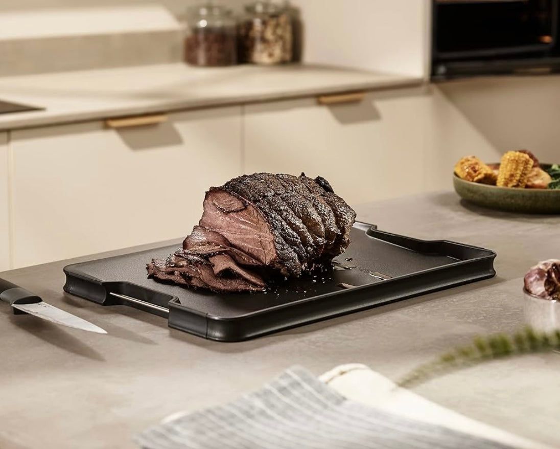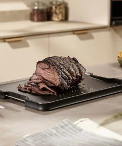 - Unique sloping base and raised edges help catch crumbs and meat juices