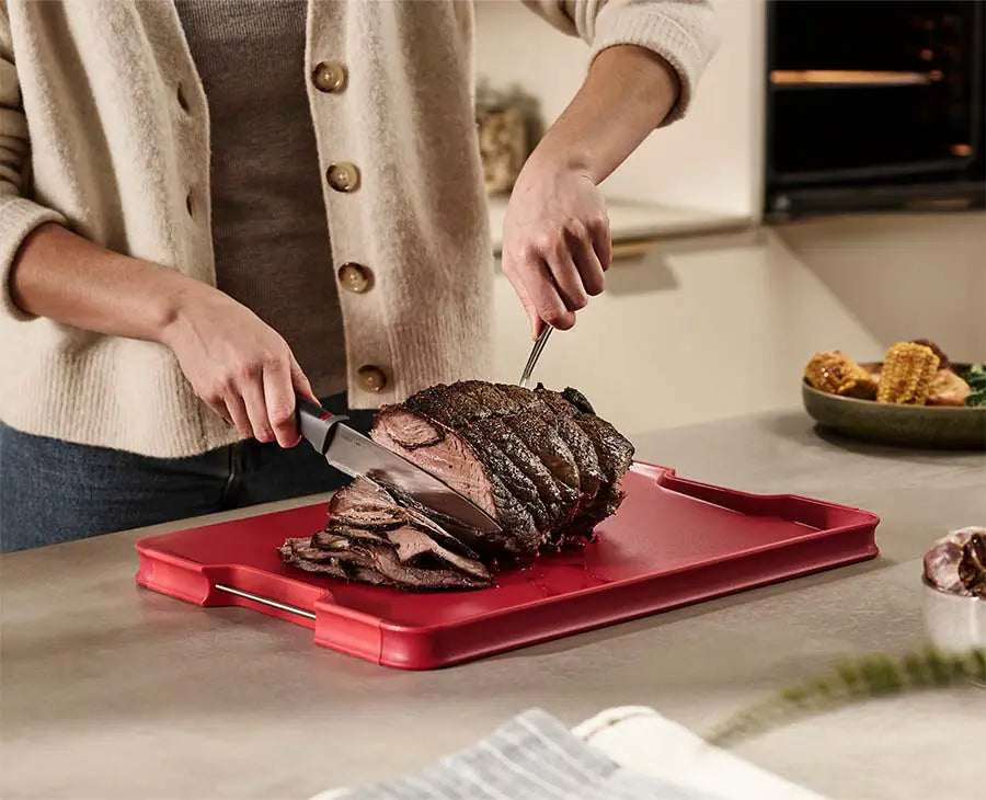 Cut&Carve™ Plus serves up multiple uses in one colourful design. One side features an integrated meat grip for extra help with carving while the other provides a smooth cutting surface for all other types of food prep. Other clever details include an angled base, raised edges and easy-pour corners for collecting and disposing of crumbs and liquids. If a Sunday roast is on the menu, you’ll want Cut&Carve™ Plus on the worktop.