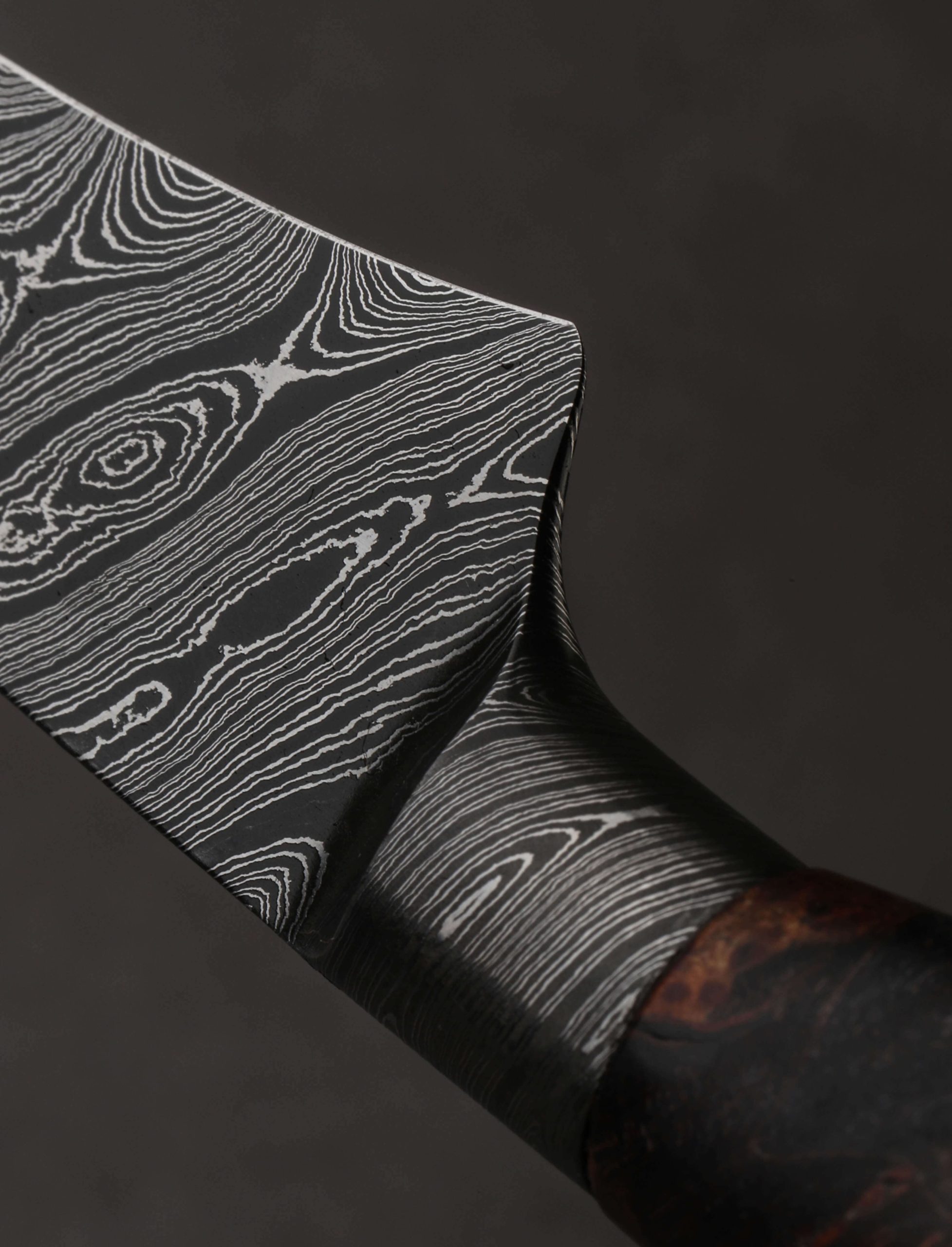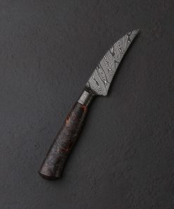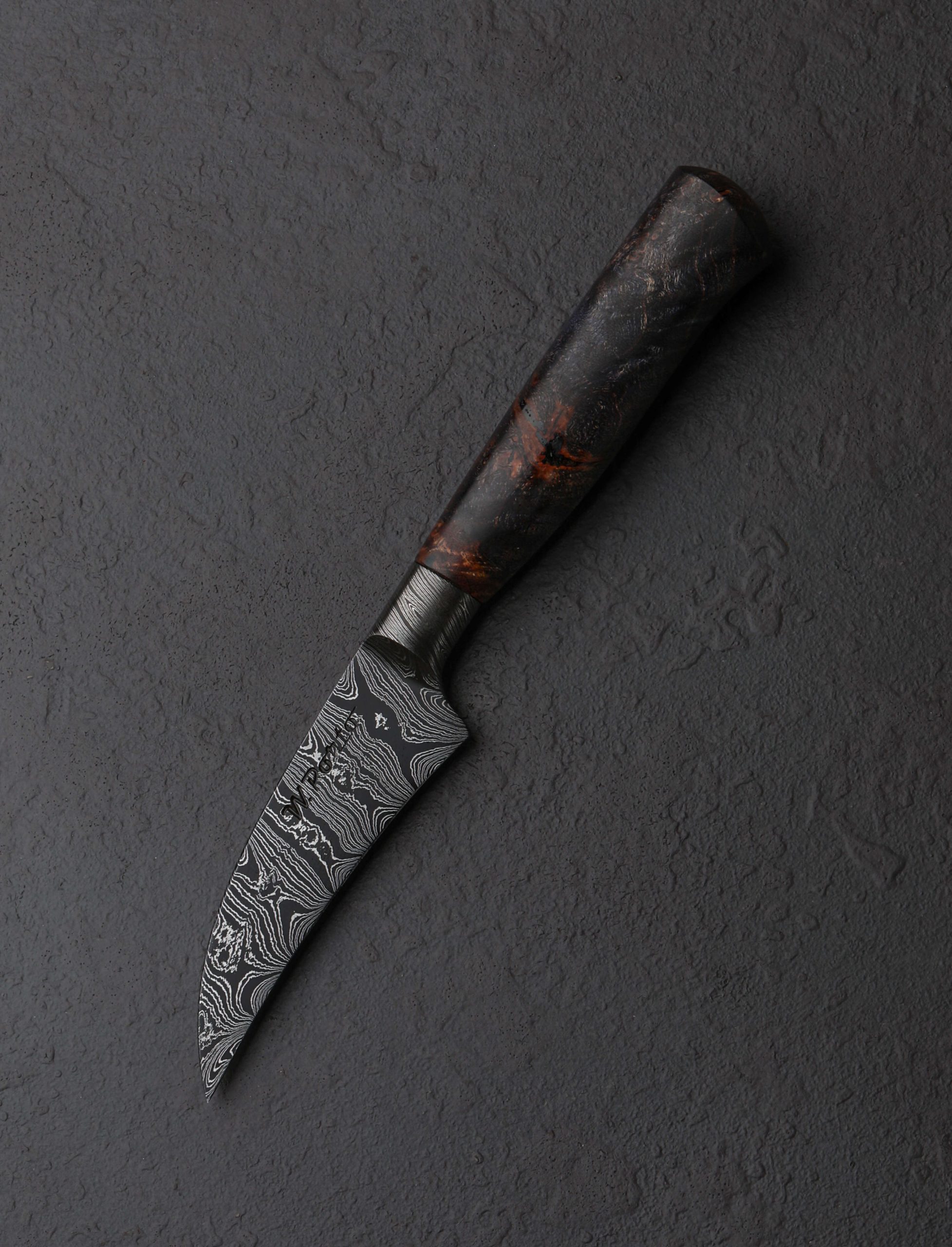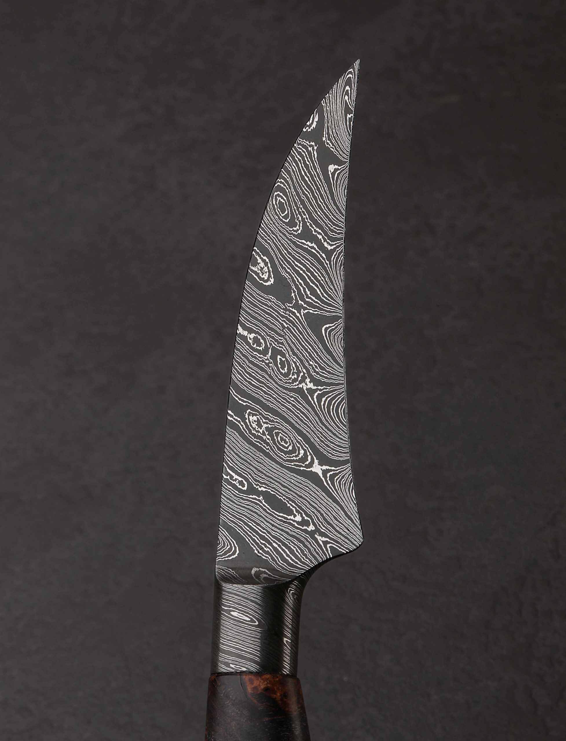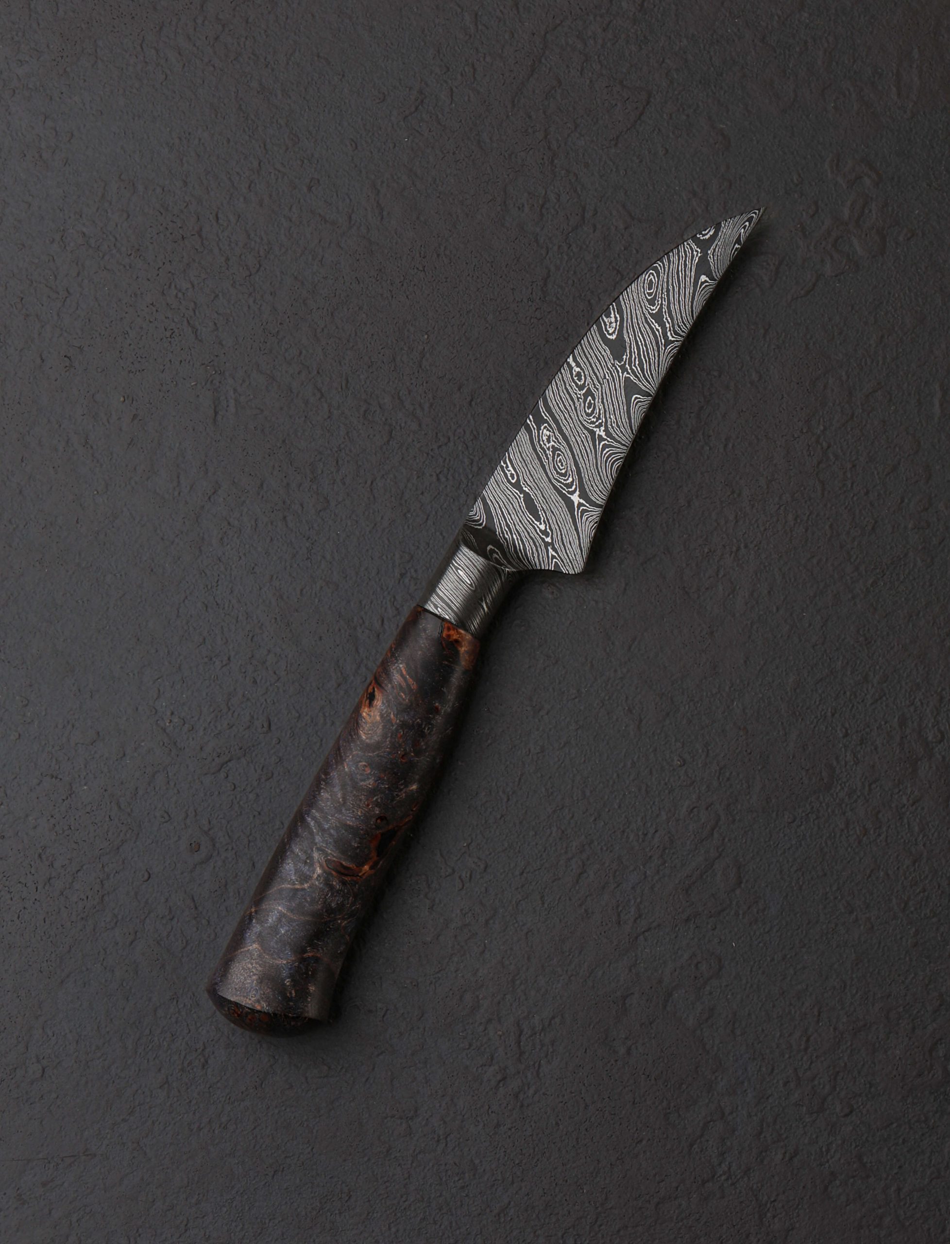 Whether peeling citrus, trimming brussels sprouts, halving strawberries, or foraging for mushrooms, the bird’s beak parer, also called a tourné knife, is the tool for the job. From Brazilian artist William Porto, forged by hand from homemade carbon damascus steel with a beautiful, high-contrast etch, this particular tourné is more than just a tool: it exemplifies functional, culinary art. Crafted at his one-person studio in Piratini in Brazil’s southernmost reaches, a simple, rounded integral damascus bolster gives way to the curved, 85mm / 3.3″ blade that is stiff and tough throughout, yet slim and precise at the tip, perfect for exacting cuts of all variety. The edge is thin and razor sharp. Comfortable and natural in the hand, the forged bolster meets beautiful maple burl with stepped, heirloom fit-up, together providing control and deftness over a chef’s knife that will find no shortage of utility throughout the home or professional kitchen.
