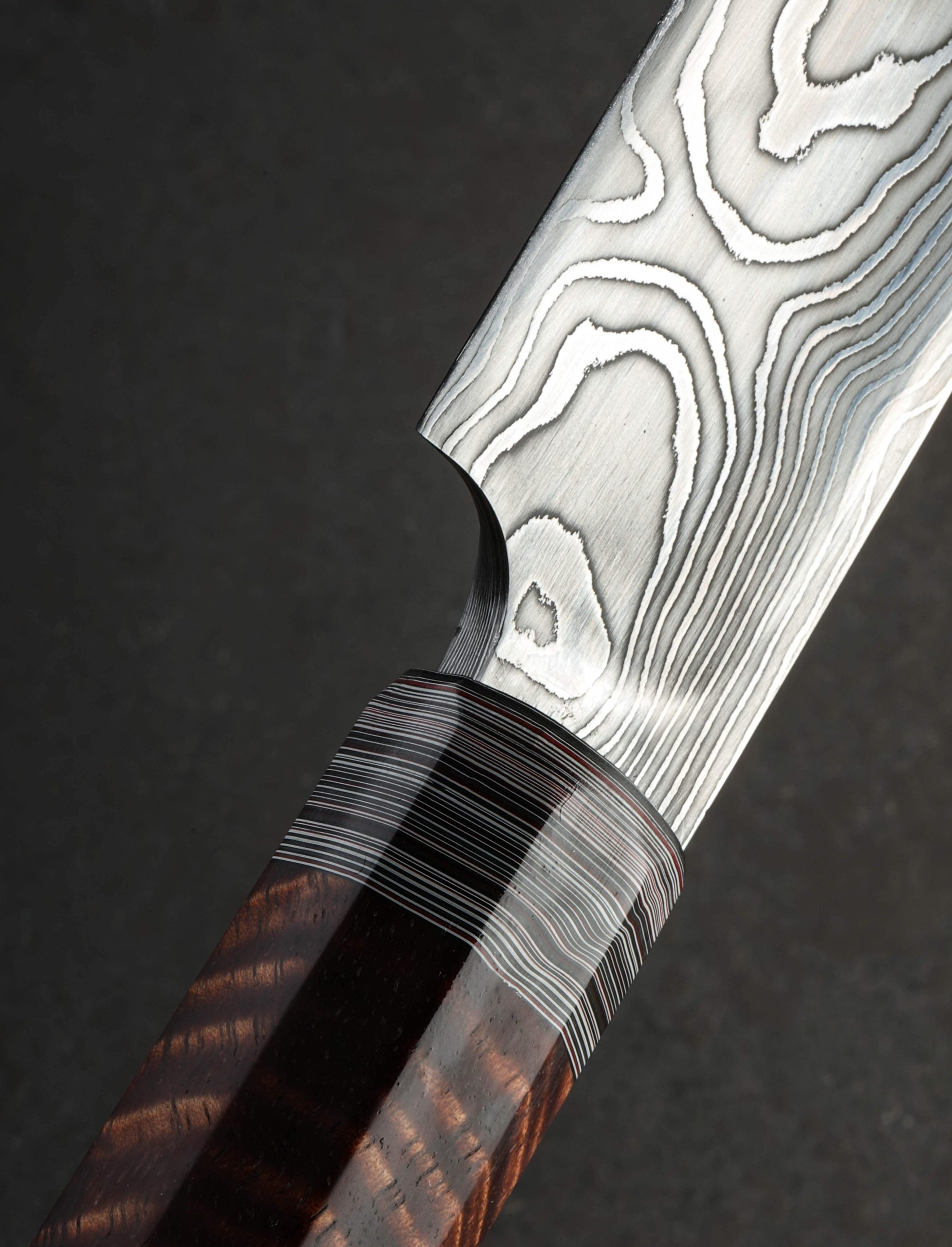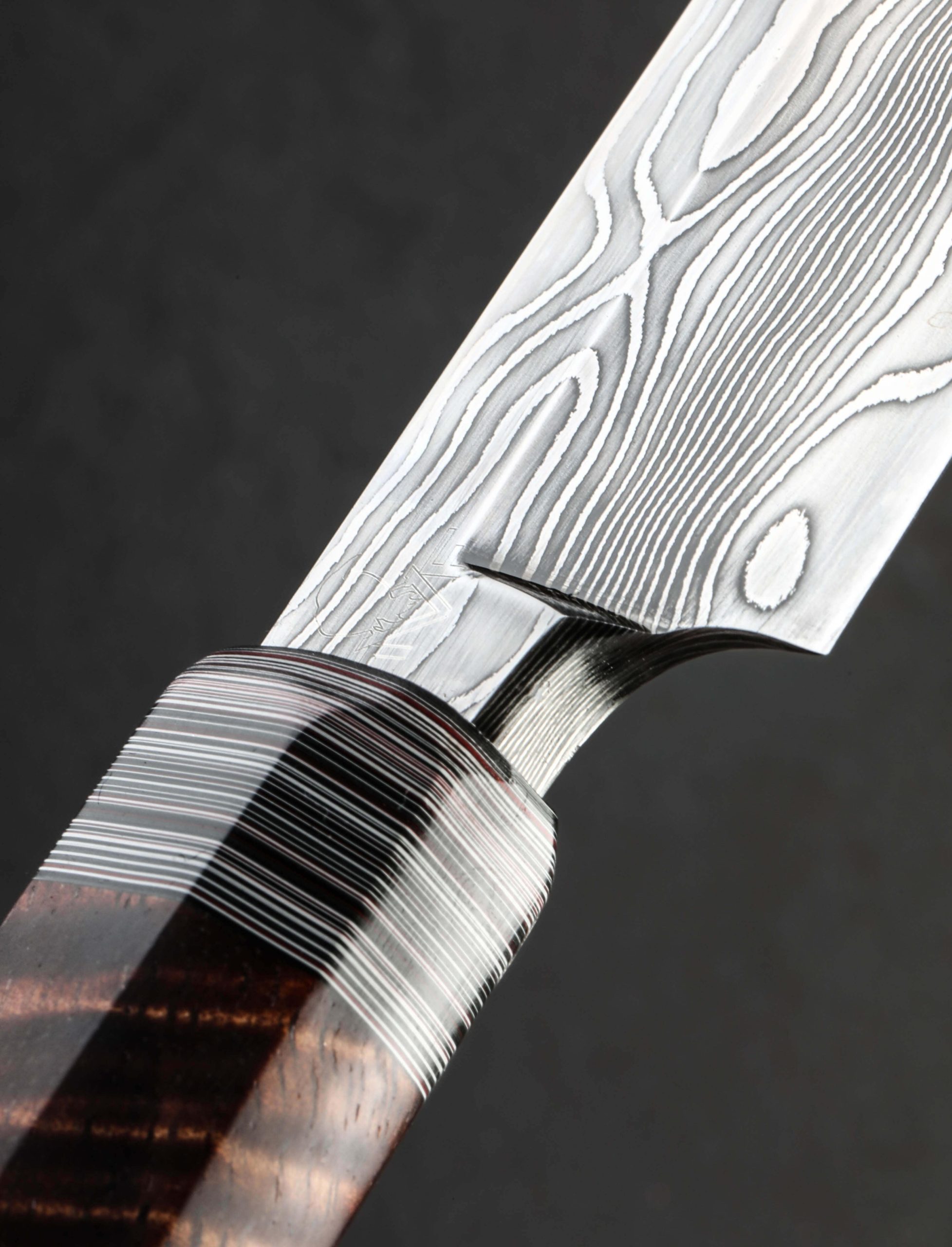 Few artisans can accomplish what Casey Vilensky has done in the creation of this extraordinary chef’s tool. Forged by hand at his North Vancouver studio for the uncompromising sashimi chef, Casey delivers a single bevel yanagiba built for a right-handed user with a razor-sharp edge that extends outwards for a mere 460mm, or just over 18 inches. In any material this is considered an impressive feat, and Casey meets the challenge not with just any steel, but with his own house-made carbon damascus formed from 1084 and 15n20 alloys, hardened to completion at 62 HRC on the Rockwell scale. The beautifully etched and polished pattern revealed throughout the blade meanders like a lazy stream through the short tang, along the shinogi which separates flat from bevel on the blade’s front side, down a spine which begins with a width of 5.7mm before tapering to a needle-like tip, and with bold, high-contrast character through the back-side’s concave urasuki. The melding of the two steels only works to accentuate the precise and remarkable purpose-specific geometry. In the hands of a practitioner, the balance, weight, and control afforded by a blade of this size and exactness are unparalleled. To wield the cutting edge with a unique beauty that matches both blade and its maker, exquisite Hawaiian Koa is matched with densely layered Fordite to form a traditional wa-style, hidden-tang handle which tapers slightly from back to front and fills the hand with indescribable pleasure.