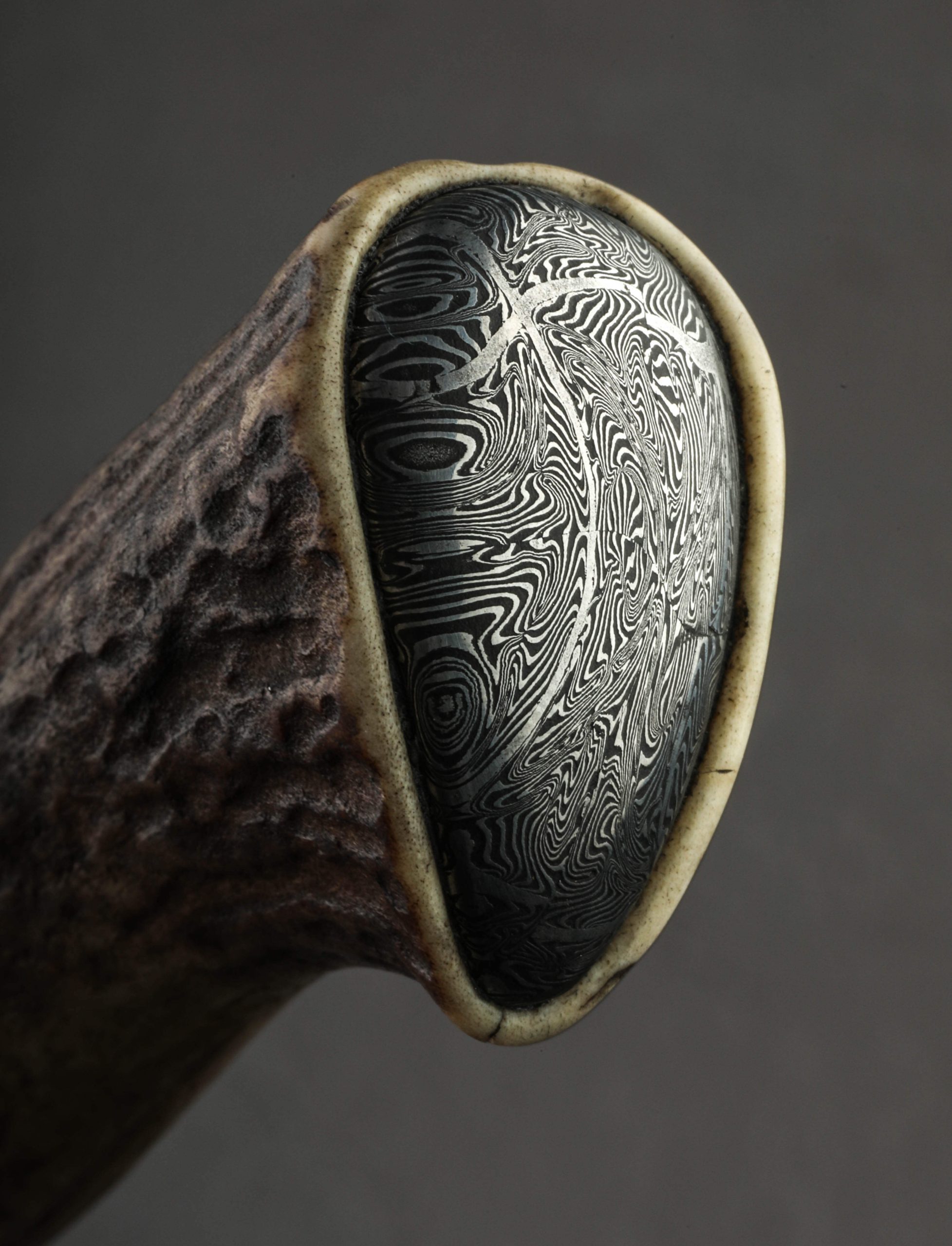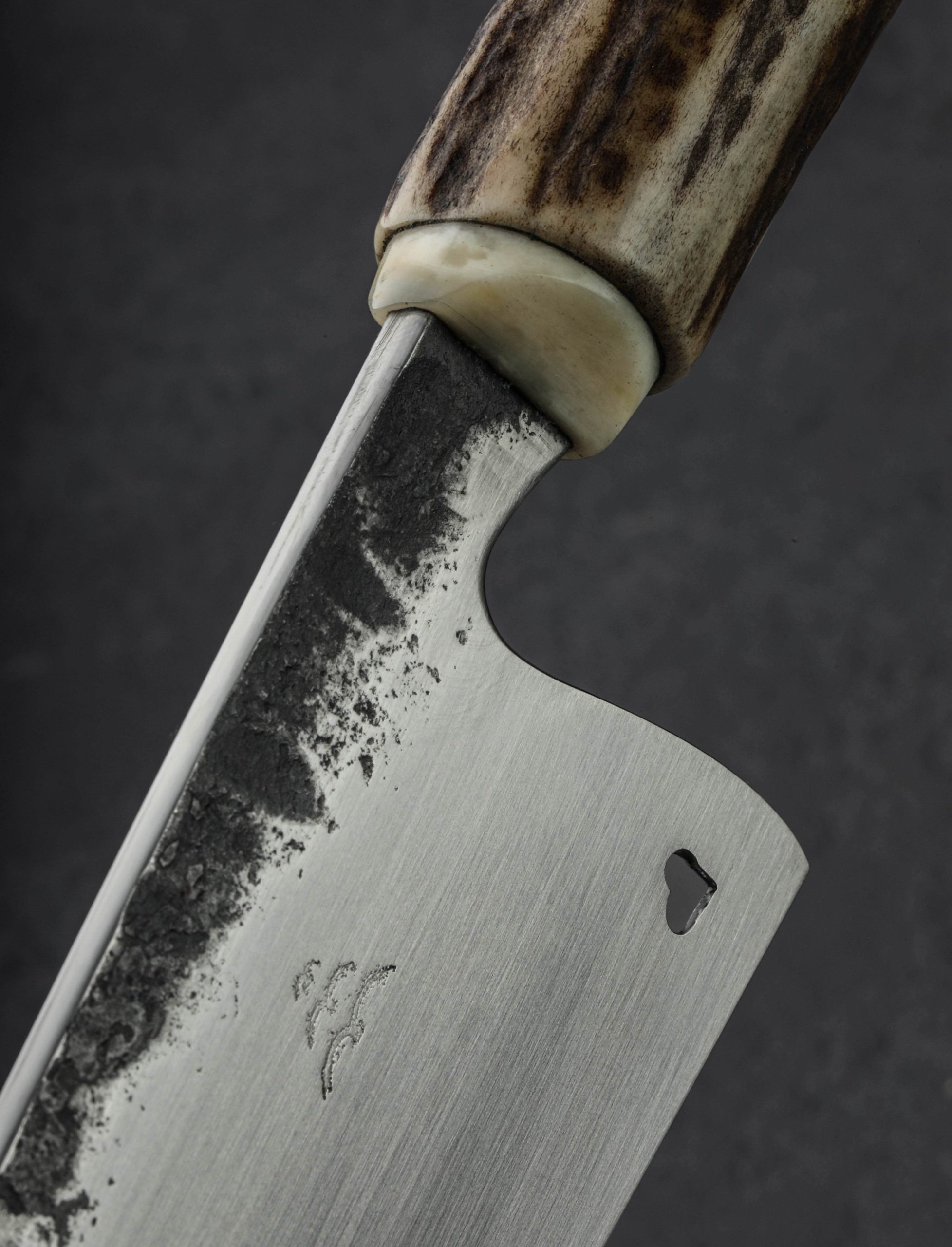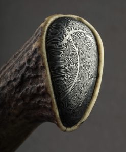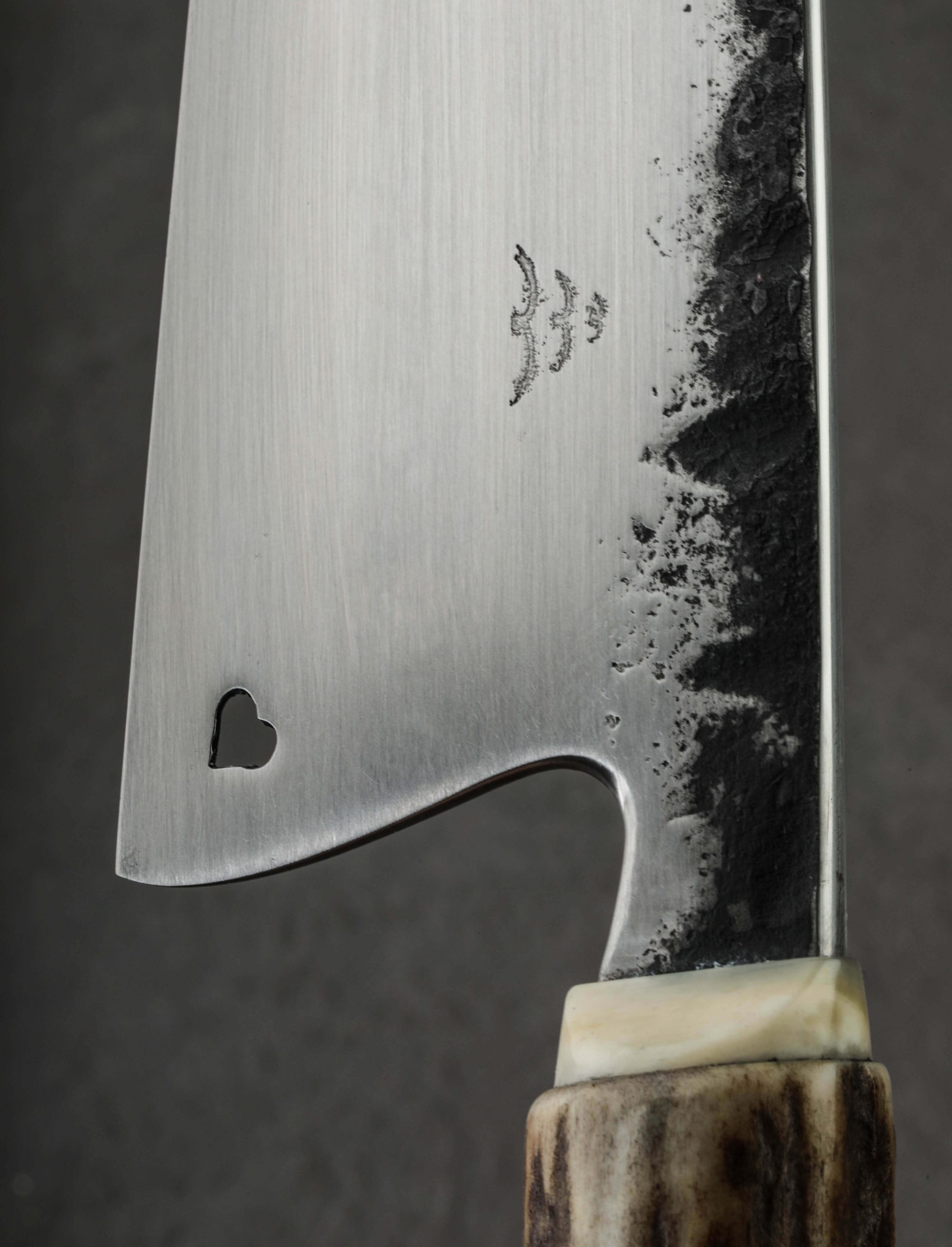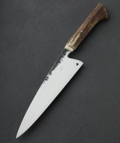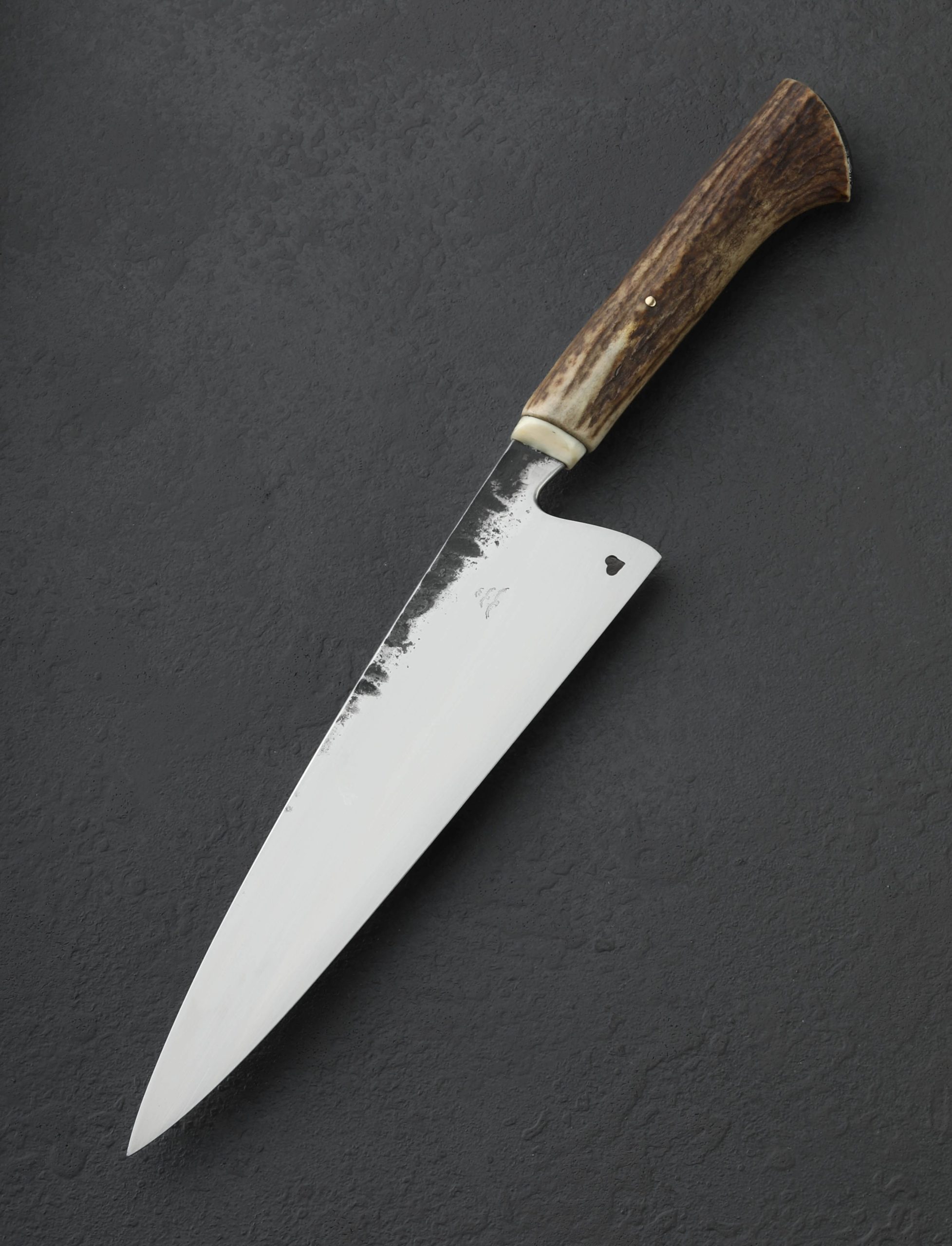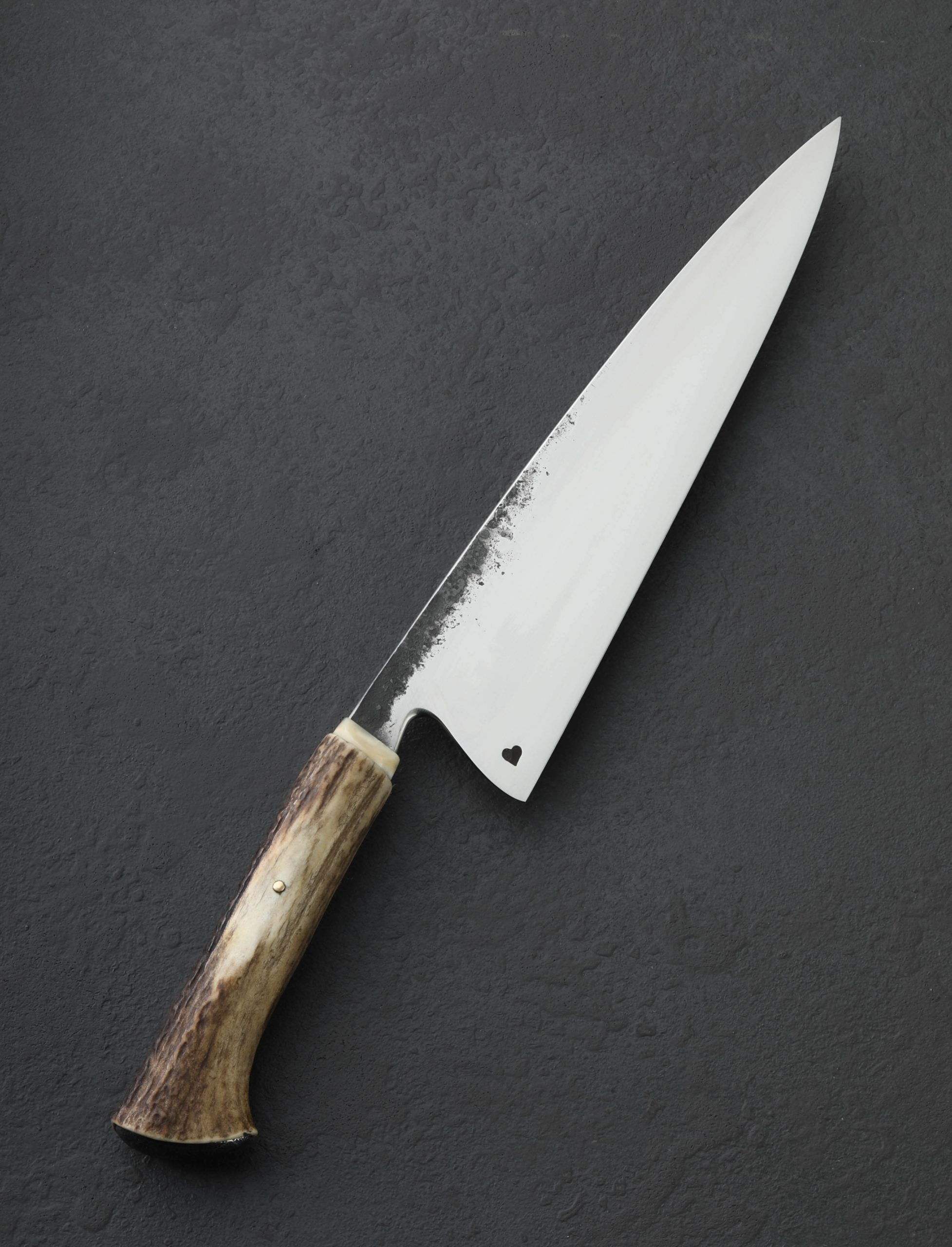 By bladesmith Toma Fenes of Romania, the Damascus Heart Chef is an exquisite and versatile culinary tool built for the rigors of every-day cooking, forged by hand from 26c3 ‘Spicy White’ carbon steel to create a Western-style blade featuring a beautiful heart detail. Altogether, it’s enough to make you fall in love. Wonderfully balanced just at the blade’s heel, the silky, satin finished bevels are superbly shaped for outstanding cutting performance, the convex geometry slimming to a sharp, thin, near-zero edge. Above, the blade’s comfortably rounded and polished spine tapers steadily from handle forward, delivering a dynamic and evened feel along with a very slim, needle-like tip perfect for detail work and precision slicing. With forge-finished blade flats that complement the handle’s natural, rustic aesthetic, 19-year-old Toma shows that age is just a number when it comes to the marriage of form and purpose-built function. The handle is sculpted of deer antler and inlaid with a handsome, domed cap of damascus in the rear, adding a beautiful touch to this one-of-a-kind kitchen knife. For the home cook and professional chef alike comes a world-class cutting tool from the newest artist to join our collection.