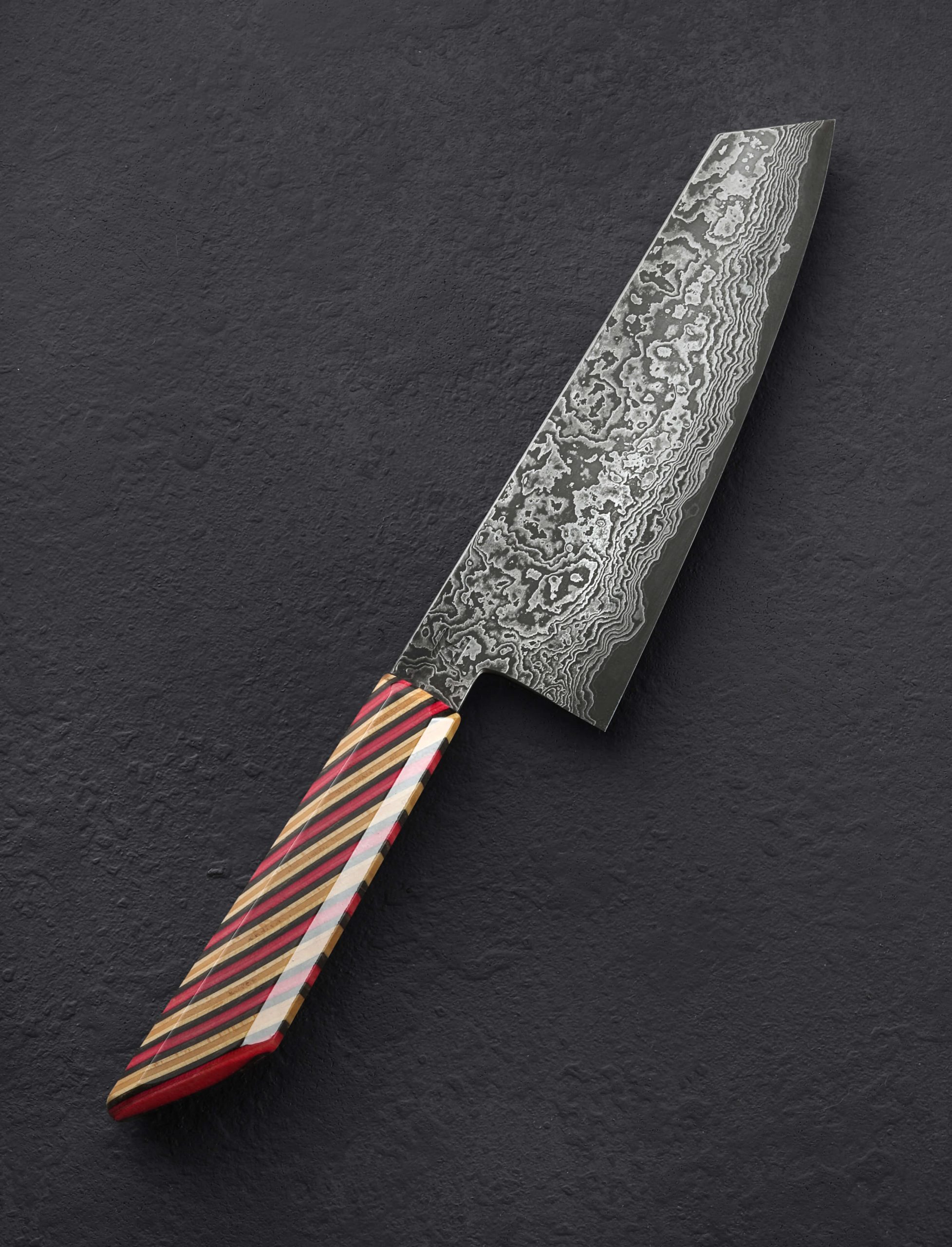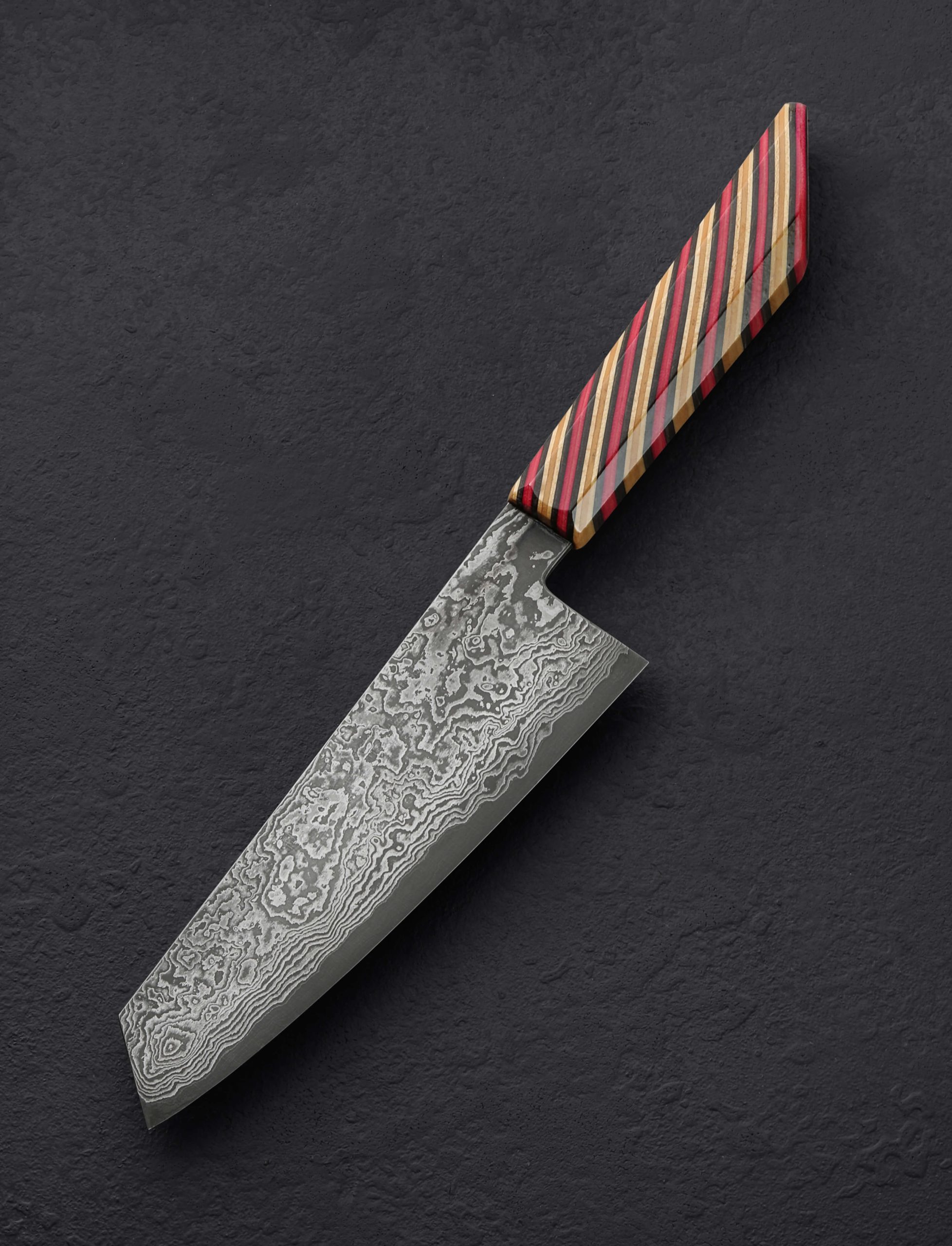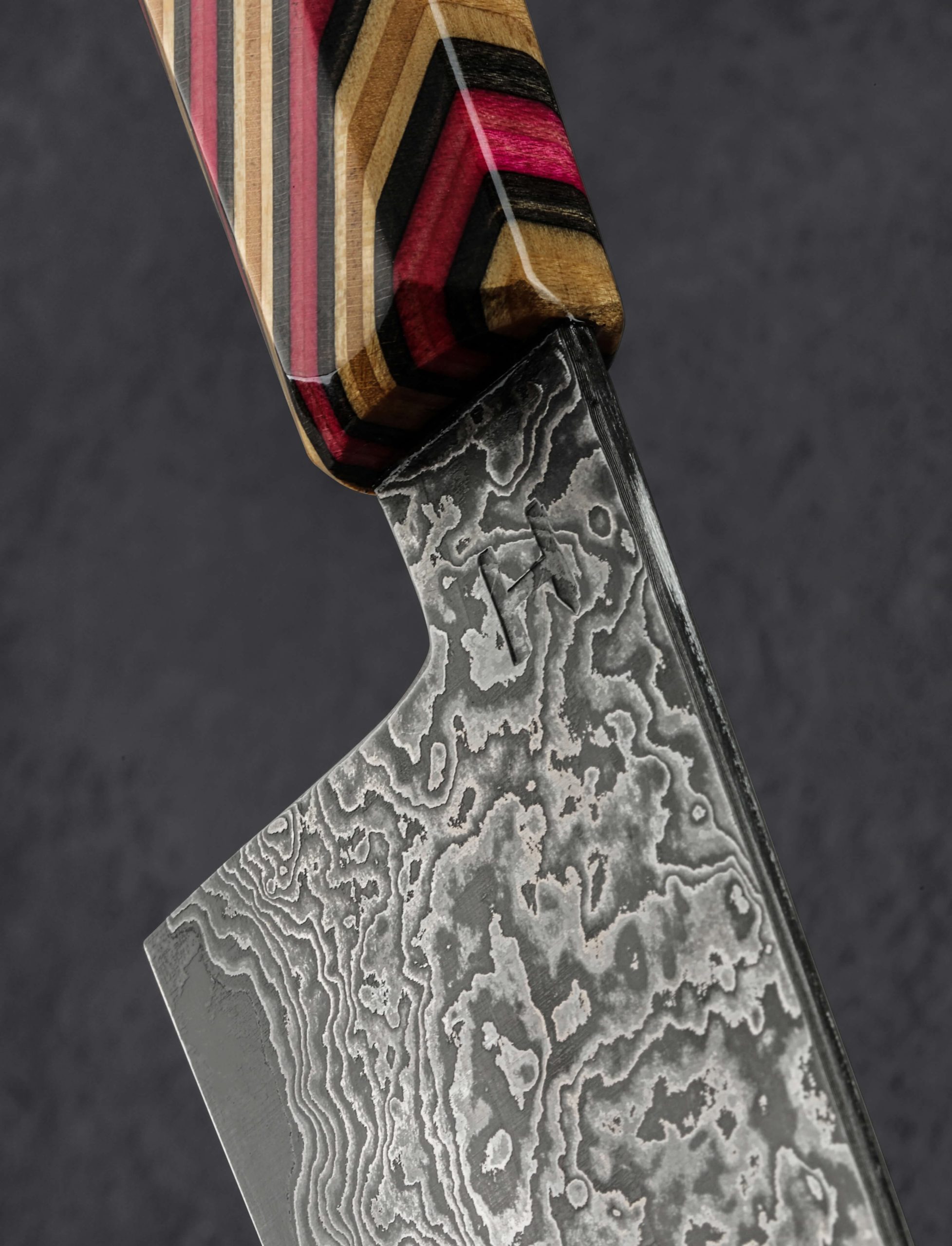 Forged from their homemade damascus-clad san mai steel, brother’s Kamil & Michal Hanuljak deliver another outstanding chef knife crafted for everything and anything the kitchen throws at it. The 170mm / 6.7″ bunka blade profile stands 54mm tall at the heel, designed to rock and chop on the board, while a fine, pointed tip is wonderfully honed for precision slicing and detail work. Quite thin at the edge, the convex bevel geometry above provides the performance, food release, and stability for both tough cuts and delicate work alike. Treated to a high hardness, the carbon steel will take and maintain a razor-sharp edge without excessive effort. As is their trademark, the comfortable and unique handle is sculpted from reclaimed, stacked skateboard decks including a pink highlight that makes this tapering, octagonal handle stand out from the crowd.