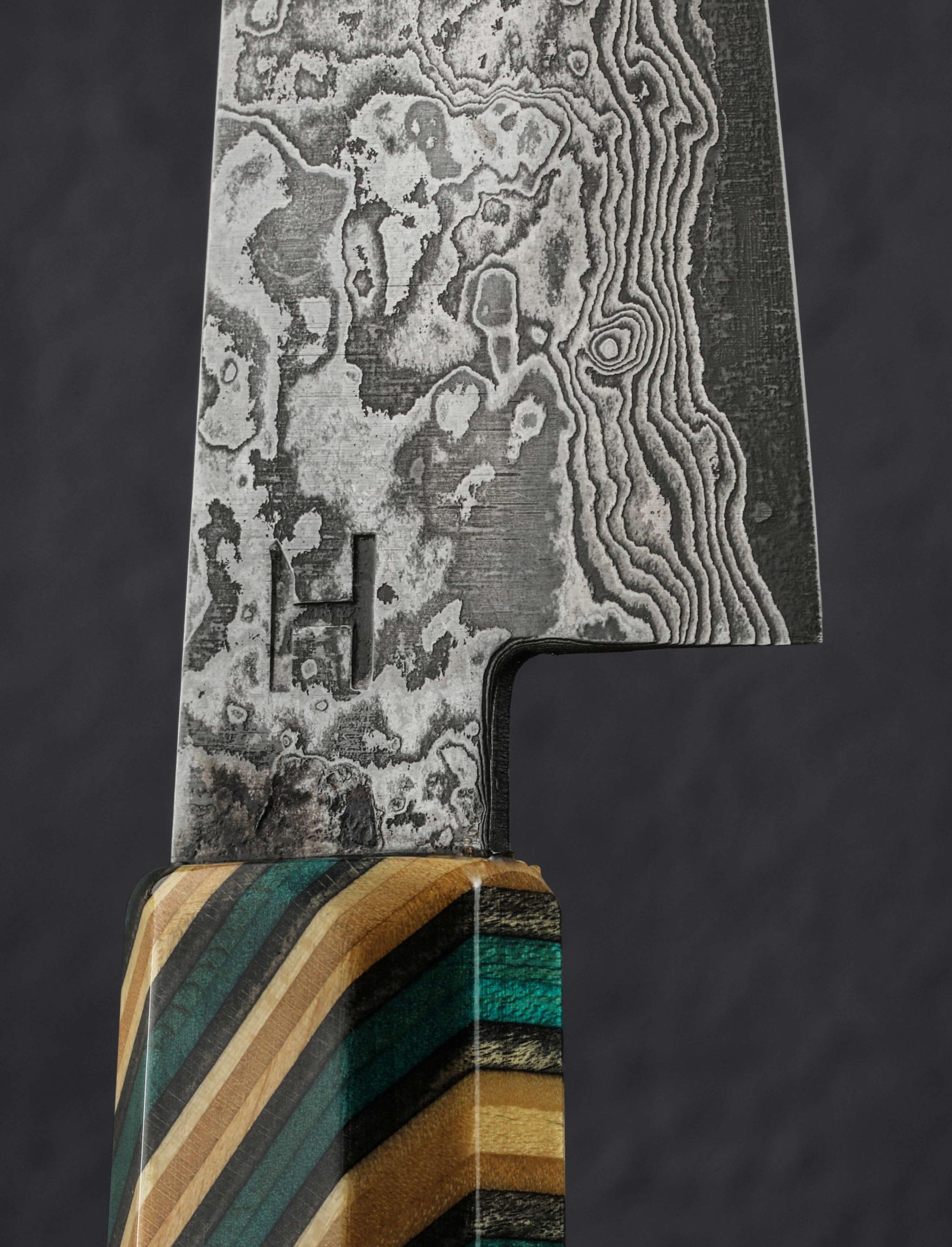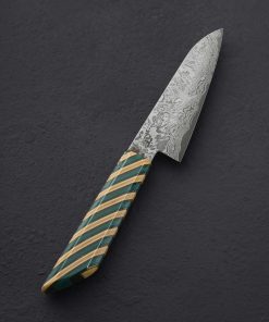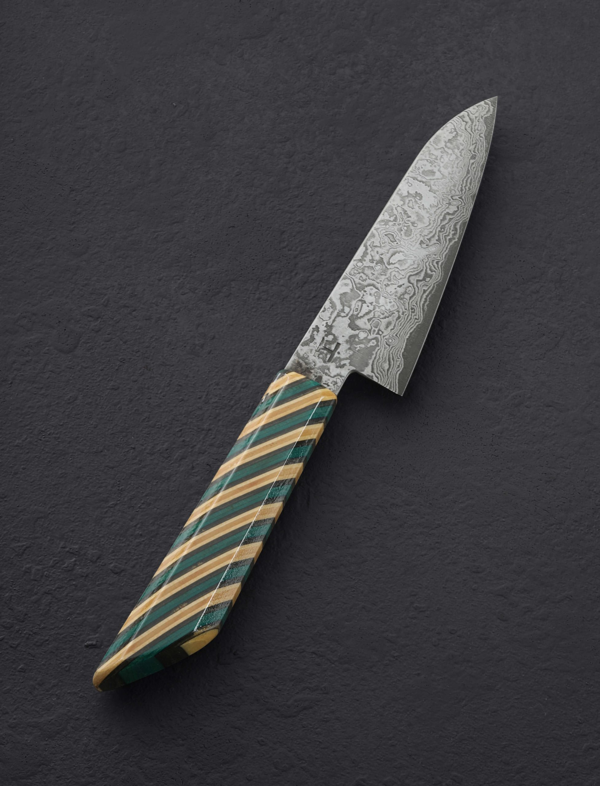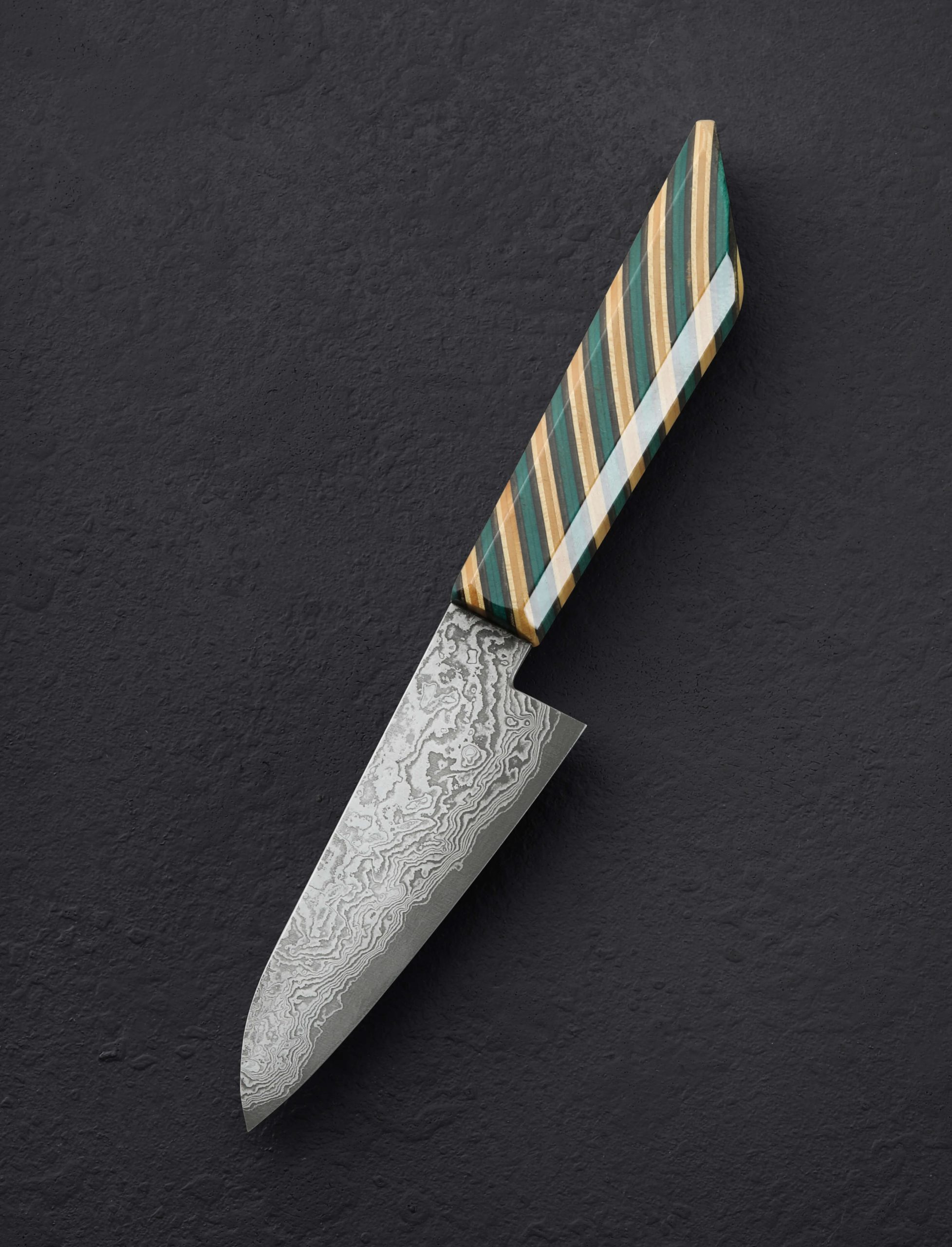 Clad in beautiful, homemade damascus steel is this unique petty chef knife from brothers Kamil and Michal Hanuljak. In a size and profile designed for unlimited uses around the kitchen, the 115mm / 4.5″ blade is thin and sharp at the edge beneath convex bevels, the blade spine above tapering forward to a needle-like tip for detail work. A long, comfortable handle and 41mm tall blade height combine to make this a comfortable tool in any grip, and it can even be used above the board for handheld tasks in larger hands. From cut and stacked reclaimed skateboards, an ode to the artists’ love of the sport as well as the creative freedom they so enjoy in their knifemaking, the handle is both unique, stylish, and eye-catching.