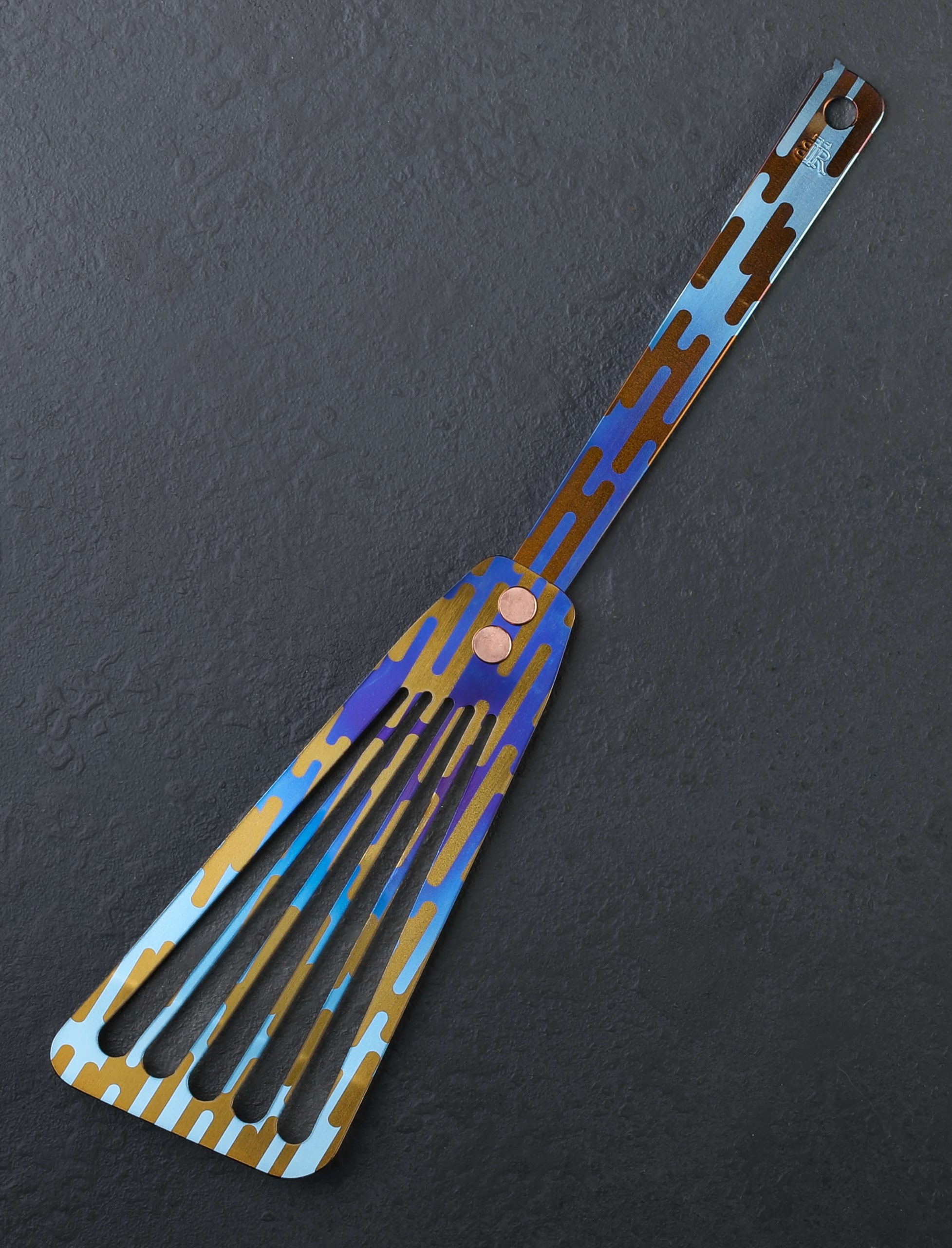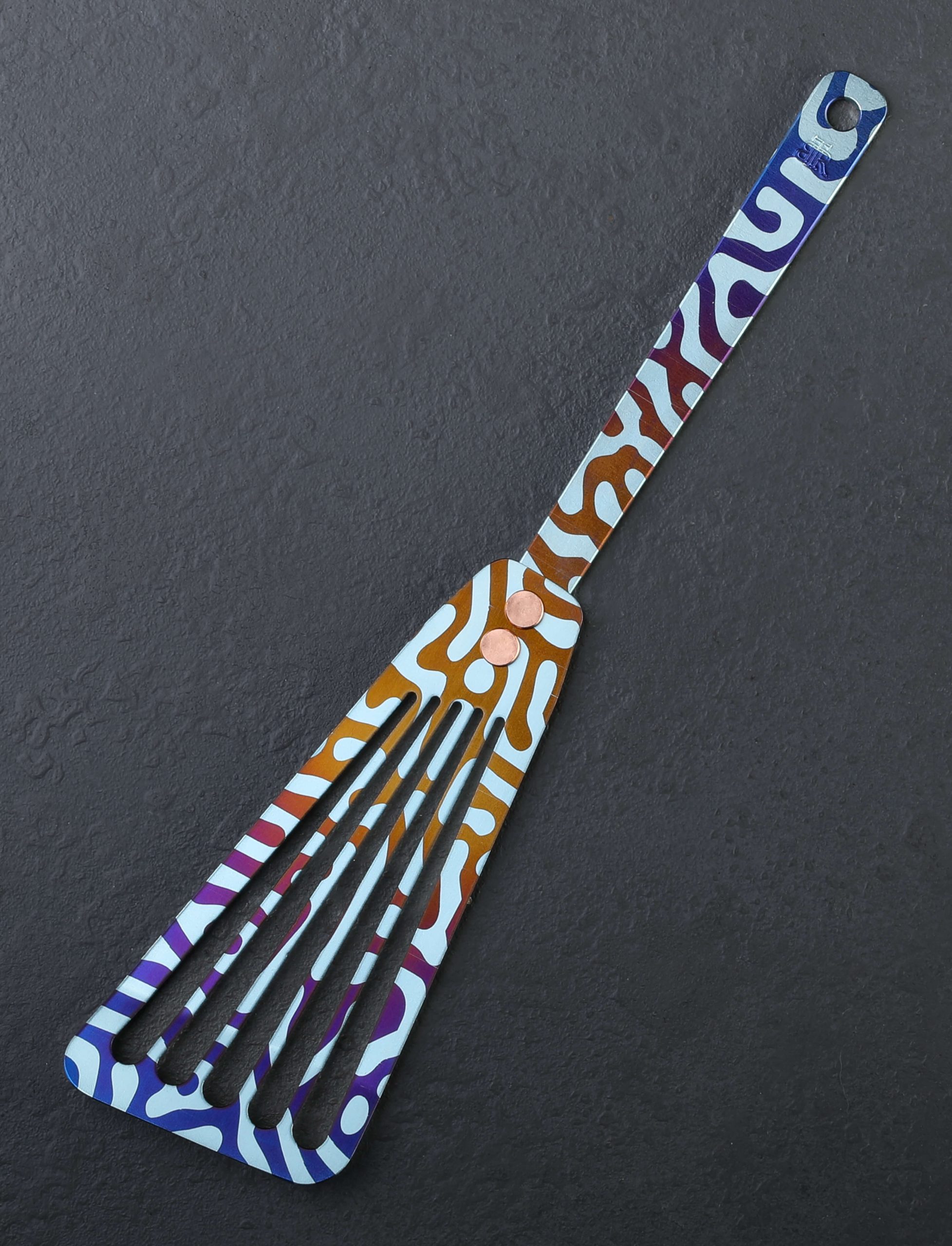 As far as we can tell, the world’s finest fish spatula is handmade in Oregon by Ben Tendick from solid titanium with solid copper rivets. Flexible, thin, beautiful, and built to use daily, the long, slotted head is angled slightly toward the end for precise and effortless functionality. In magnificent one-of-a-kind anodized, laser engraved styles, not only is titanium the ultimate culinary material for so many cooking applications, it’s also beautiful and timeless. The ultimate kitchen gift for the cook who has it all? Quite possibly.