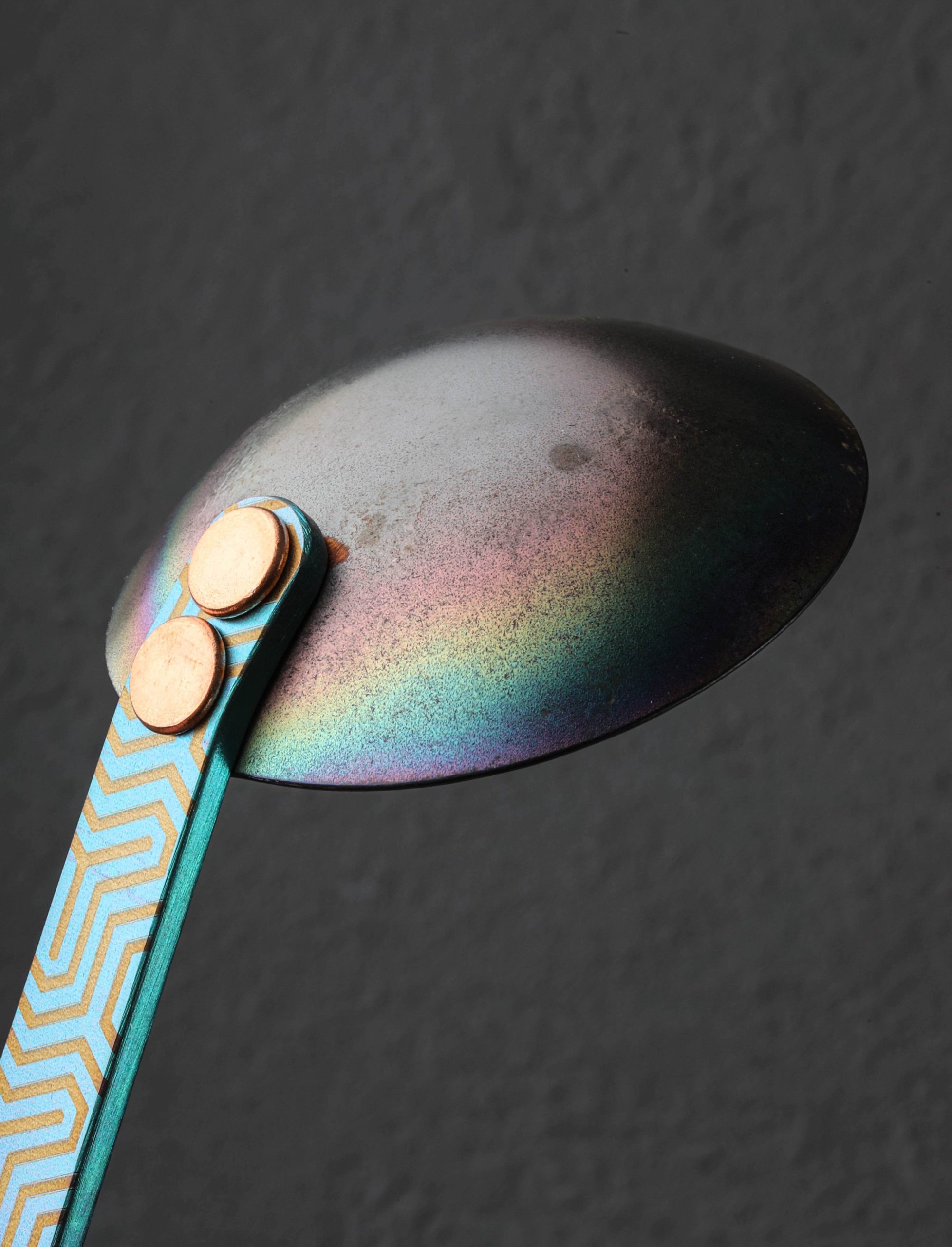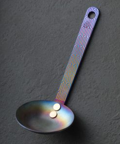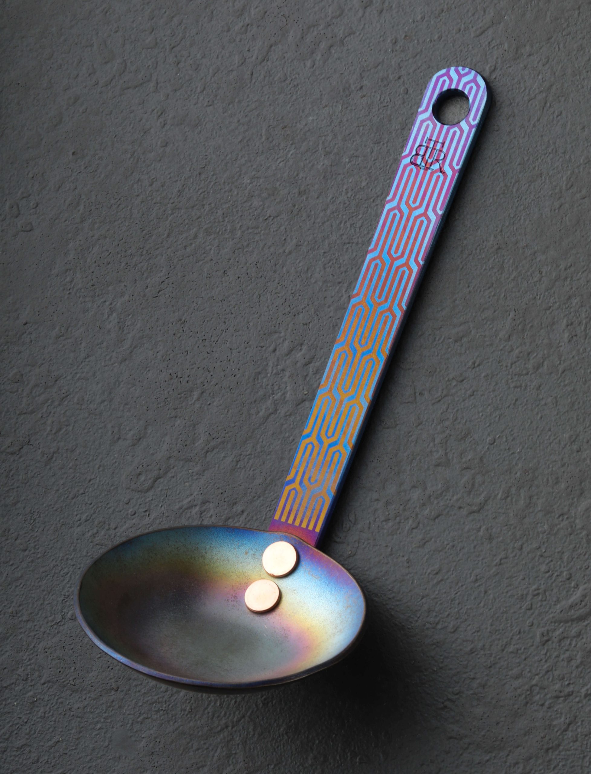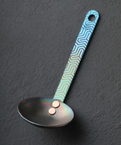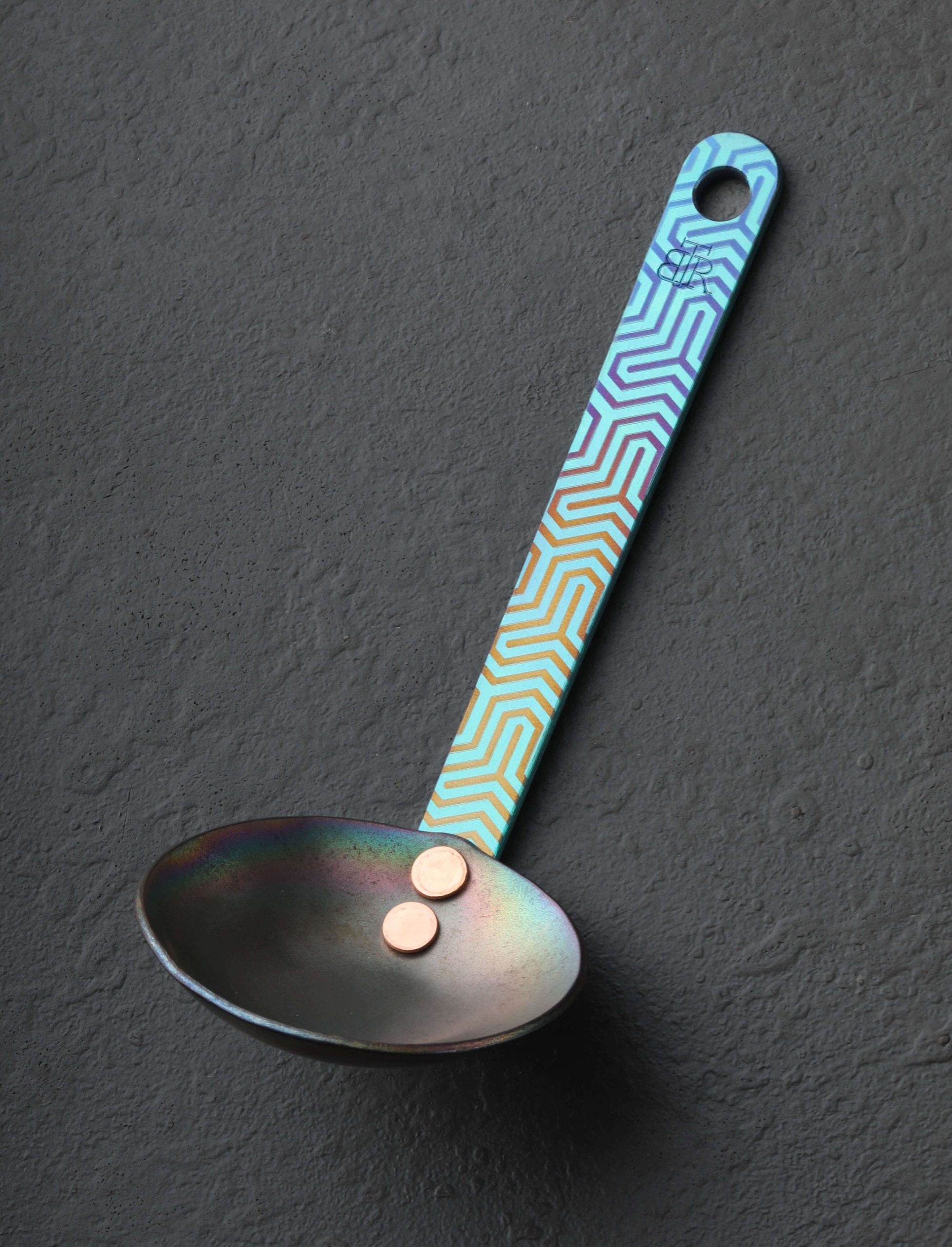What is a utility ladle, you ask? This versatile, hard-working tool, designed and made by hand in Oregon by Ben Tendick, is perfectly positioned for everything from serving sauces, to cooking and eating around the campfire, to ladling soups, chili, oatmeal, and porridge. As its creator puts it, the Titanium Utility Ladle is “Big enough to cook with, but small enough to eat with.” Combining unlimited function in a form that delivers stunning, hand-anodized handles, heat-anodized bowls, and solid copper pins, Ben has created a tool you won’t want to cook or eat without. Lightweight, incredibly tough, and built to last generations, the new addition to Ben’s titanium utensil collection travels easily and provides all of the attributes that makes titanium the ultimate culinary material. Low in heat conductivity, non-reactive, 100% food safe, non-magnetic, and able to be anodized without the use of dyes, paints, or coatings of any kind, titanium is hard to beat when working around food. Just like this ladle.