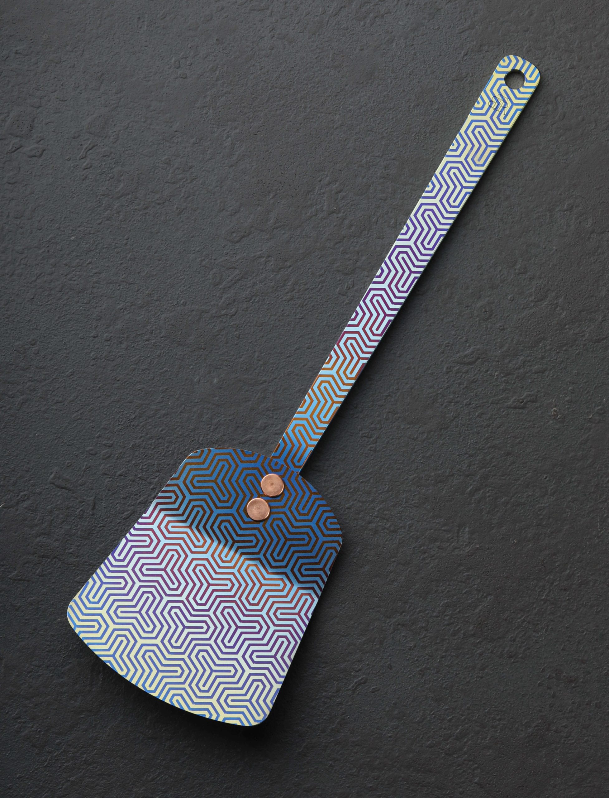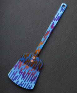 The newest TiSpats Titanium Spatula design, the purpose-built wok spatula, receives the Deluxe treatment from designer and maker Ben Tendick. Anodized at Ben’s Oregon studio, each one-of-a-kind design features the wok spatula’s rounded spatula head, ideal for working inside the rounded interior walls of the pan. Adorned with the beautiful and bold colors of Ben’s artistic styling, form and function collide in an artful kitchen object guaranteed to turn heads. Crafted from solid, Grade-5 titanium, this luxurious cooking tool is lightweight, incredibly strong and durable, and built to last for generations. As no dyes, paints, or coatings are used in the anodization process, these high-performance objects maintain all of the wonderful qualities titanium has to offer: the ultimate culinary material is low in heat conductivity, non-reactive, virtually impervious to corrosion, dishwasher safe, non-magnetic, and 100% food safe in all its forms. Cook with style.