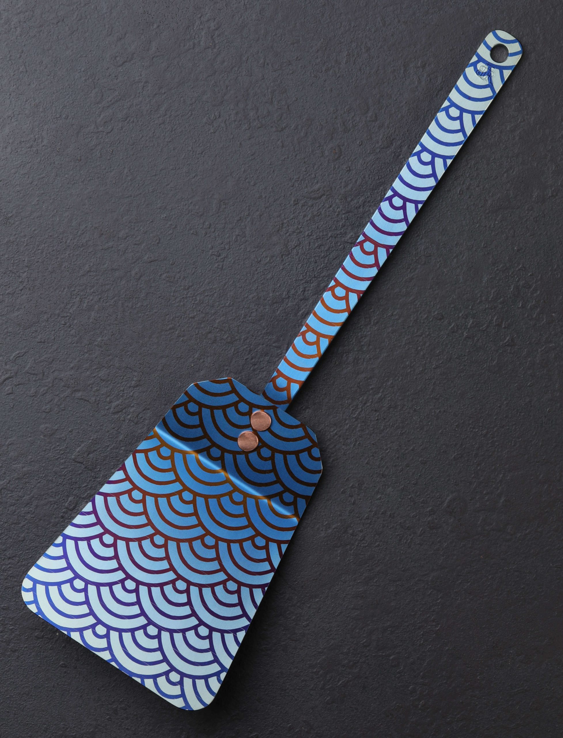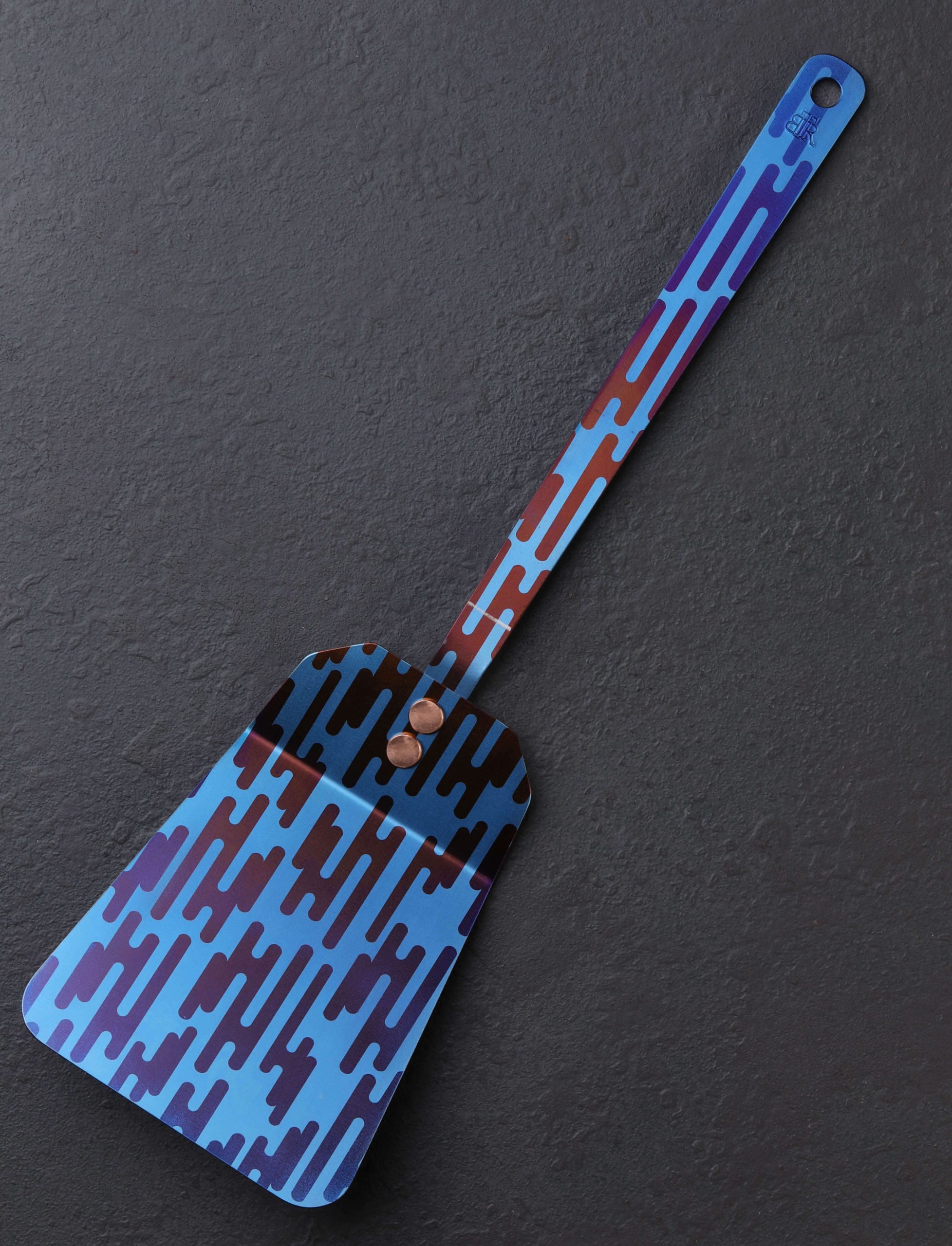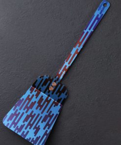 One of our most popular spatula designs, the Wide-Head Titanium Kitchen Spatula by Oregon’s Ben Tendick, receives the deluxe treatment with these one-of-a-kind anodized editions. With a thin, lightweight, solid titanium head fastened to a solid titanium handle, they are built for the rigors of daily use, durable enough to last generations, and styled to look great to the end. At over 4″ wide in the front, the strong, stiff, tapered head offers ample surface area to turn, flip, and transport the largest items in the kitchen or on the grill. Made from titanium, with no coatings, dyes, or additives used in the process that results in these vibrant colors, the spatula is low in heat conductivity compared with steel, incredibly lightweight, non-magnetic, and virtually impervious to rust or corrosion. A colorful addition to any chef’s arsenal.