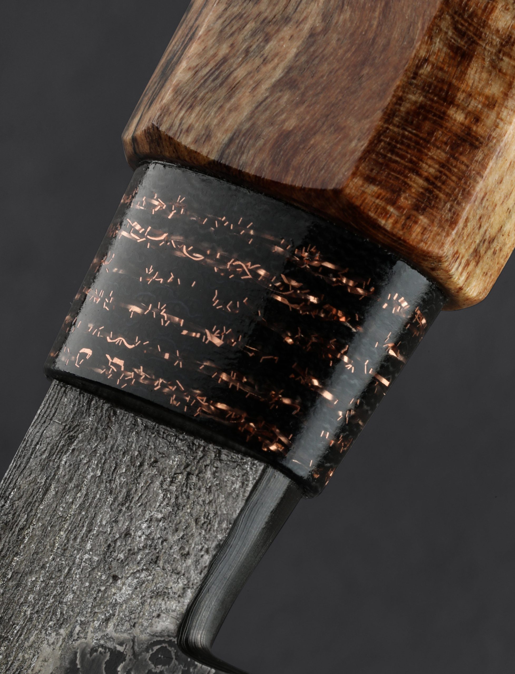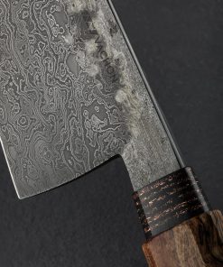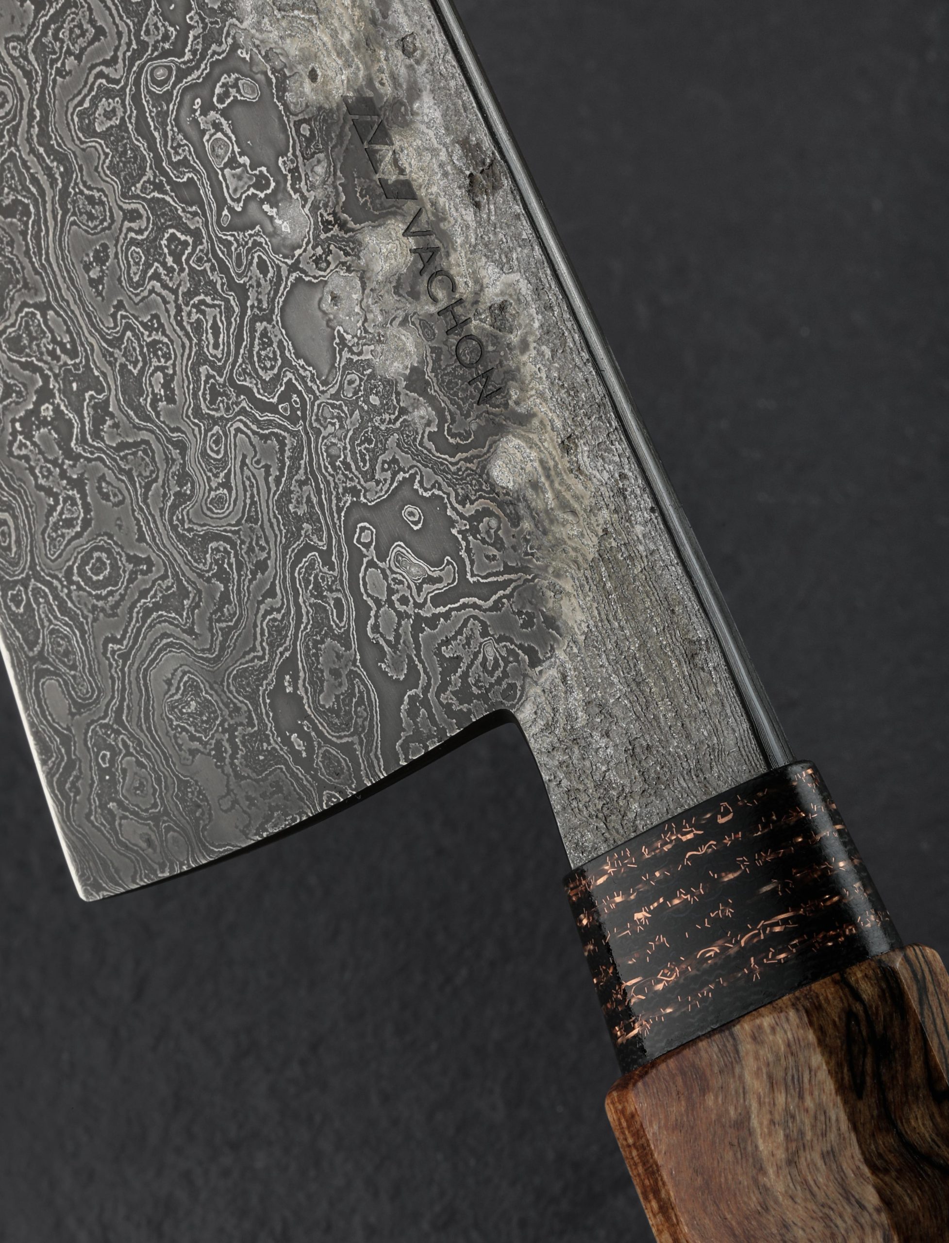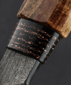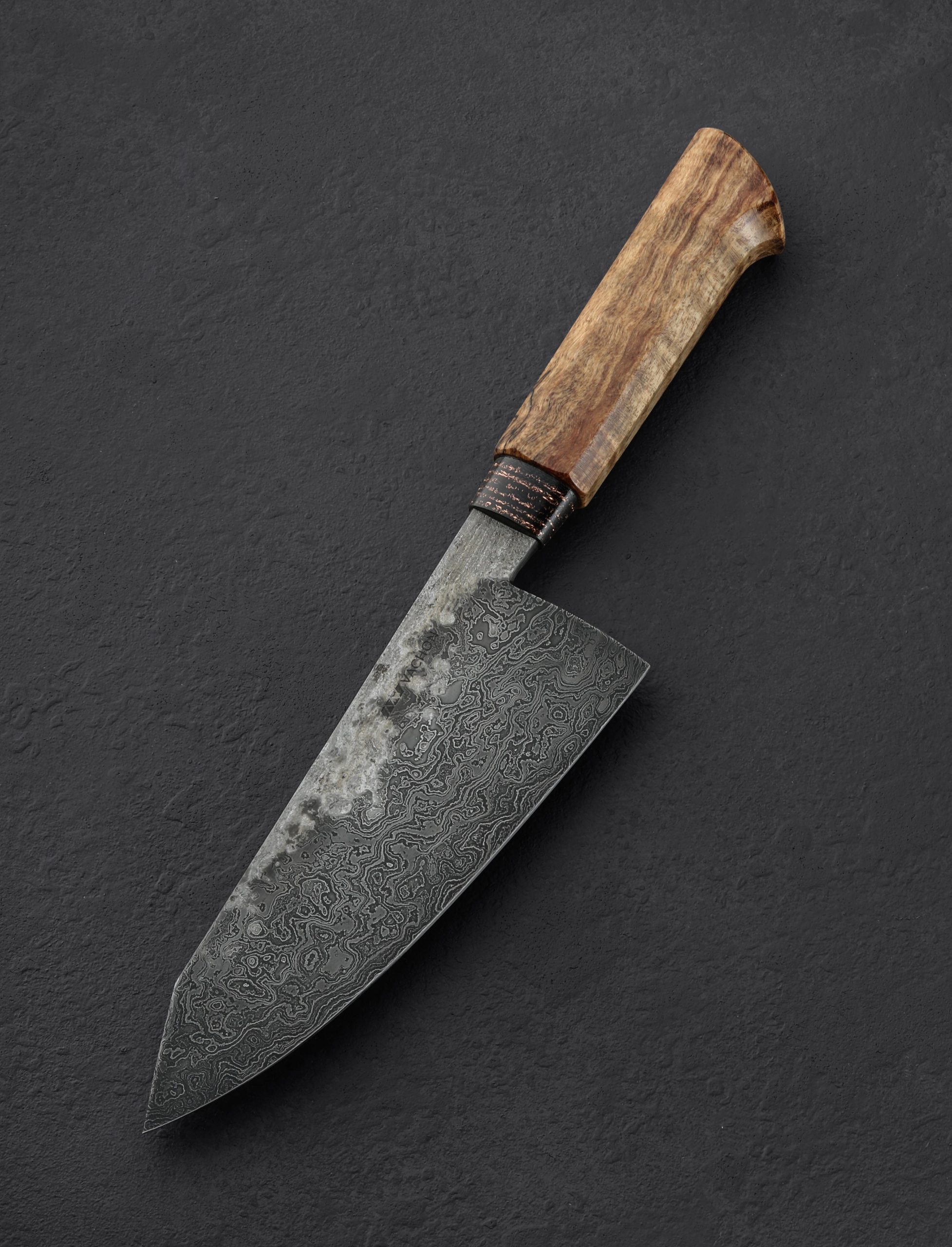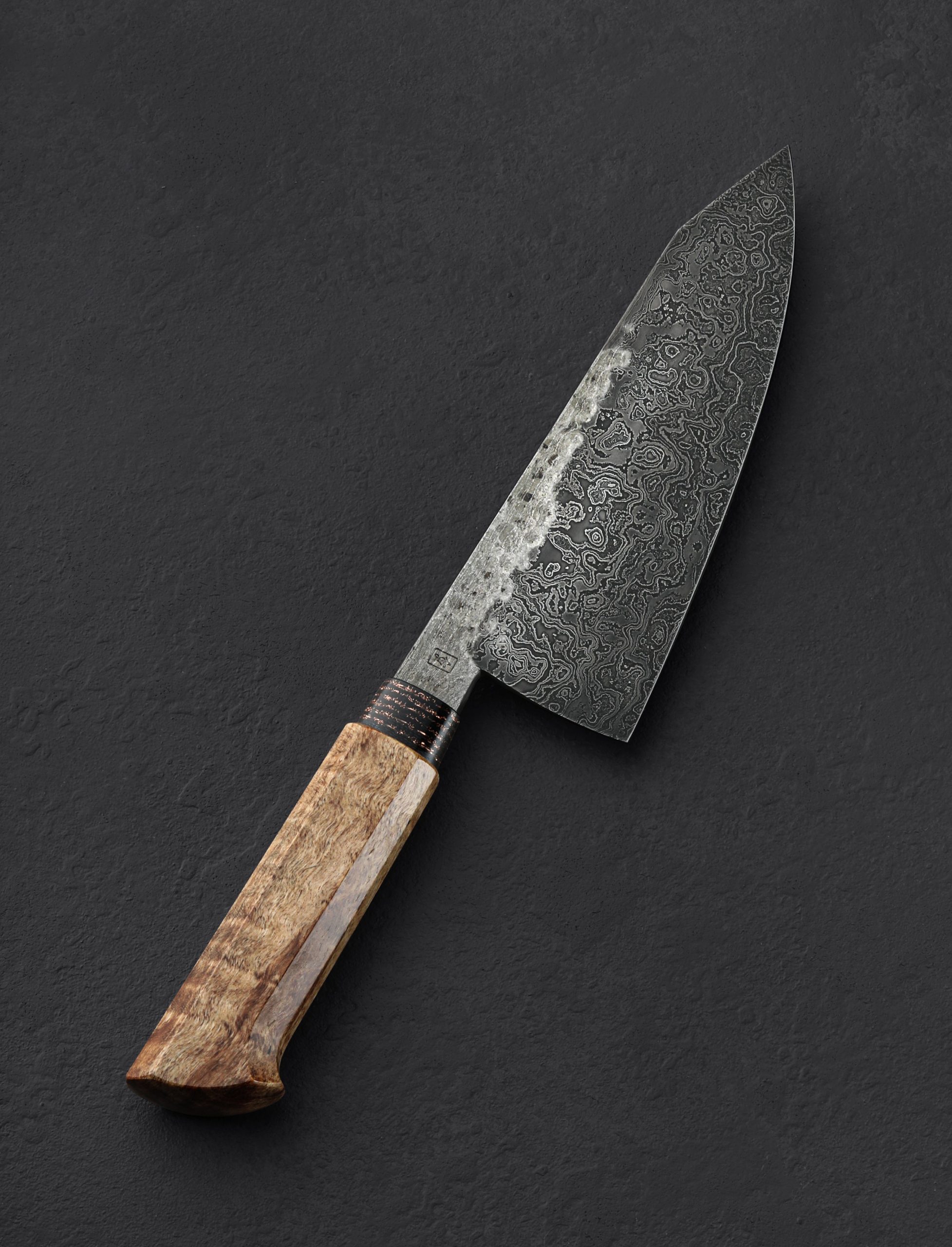 Forged by hand from a house-made damascus pattern made from three separate carbon steel alloys comes a striking chef knife by Canadian bladesmith Noah Vachon. Standing 66mm tall with a thin, razor-sharp, 190mm / 7.5″ edge, this is a large, powerful culinary cutting tool with the toughness for the most demanding work, and the outstanding geometry and versatility for every other cut the kitchen can throw at it. Balancing directly above the blade’s heel, this knife is weighted in the hand, a rounded spine tapering steadily from over 5mm wide at the tang down to a slim, needle-like tip for precision slicing and detail work. Convex primary bevel geometry and a hard edge provide a workhorse feel with the finesse needed for precision with every pass. The gorgeous random pattern damascus steel is etched to a contrasting, matte finish while the slim flats along the top of the blade have been left with a forged finish that shows Noah’s hammer blows and the knife’s hand-hewn origins. As beautiful as the blade, a handle sculpted from curly maple is capped with an heirloom-fit ferrule made from a denim and copper composite. Comfortable, and even more satisfying, is how we describe the experience of holding this one-of-a-kind object that merges art and function in the way we love.