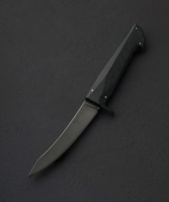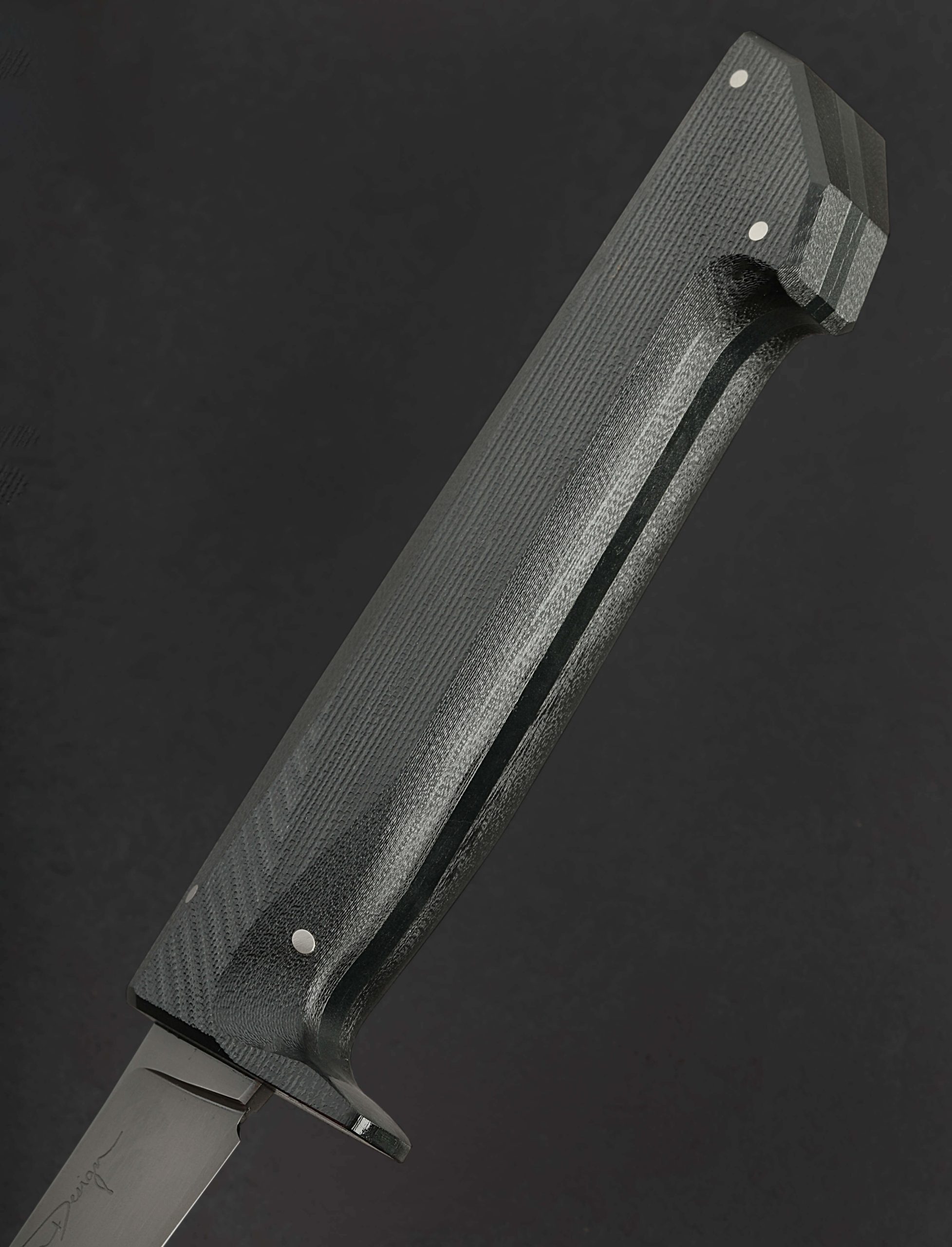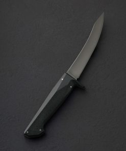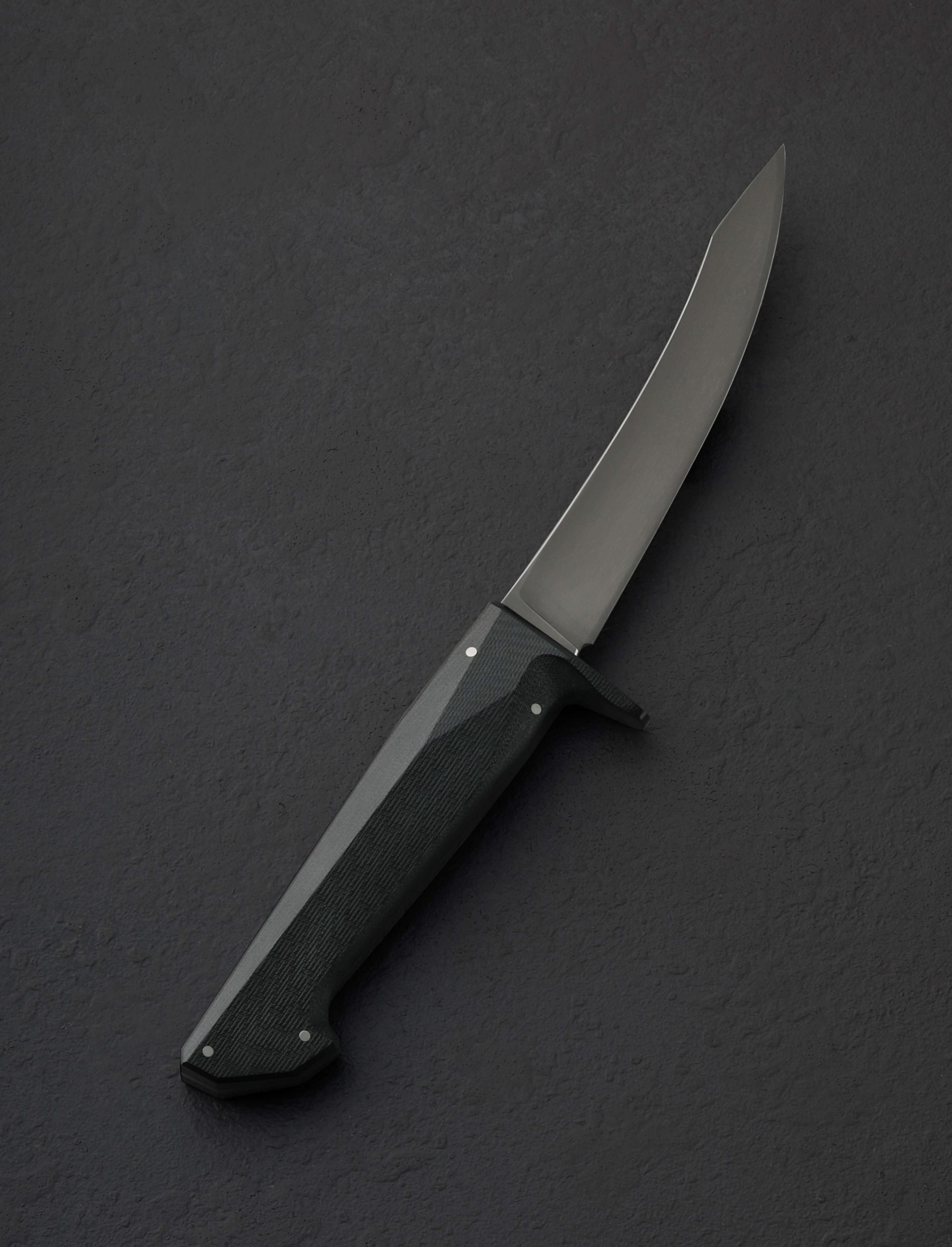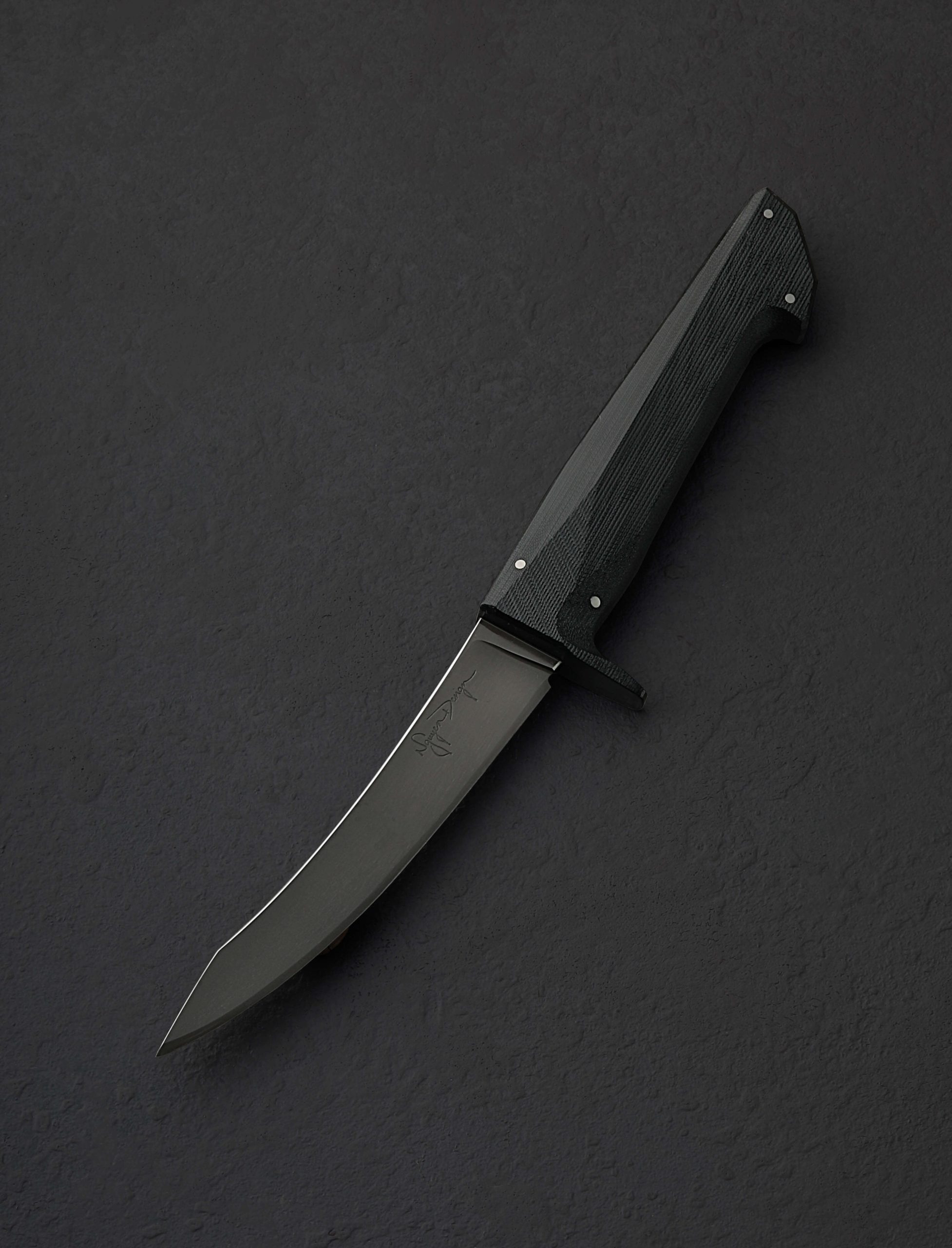 From designer and knifemaker Don Nguyen’s highly anticipated Design Series project comes the butcher’s boning knife, and this limited, newly updated 2nd edition represents the pinnacle in performance to date. Shaped from 52100 carbon steel with stone washed finish below a faceted, polished spine, the 130mm / 5.1″ upswept blade now offers meticulously hand-ground concave bevel geometry above a slim, convex stretch which tapers to a near-zero edge, designed to significantly increase the blade’s lifespan through the numerous sharpenings demanded of the butchery work it is created for. Tough, rigid, slim, and pointed at the triangular tip, the profile delivers the strength plus finesse needed to prepare proteins for the dining table. As thoughtfully designed and executed as the blade is a handle of black G10, a melding of a woven glass cloth material and an epoxy resin matrix, which Don and his team have given a sandblasted and tumbled texture for the grip and control required, sculpted into a uniquely captivating form which combines curves, facets, and a series of flush steel pins.