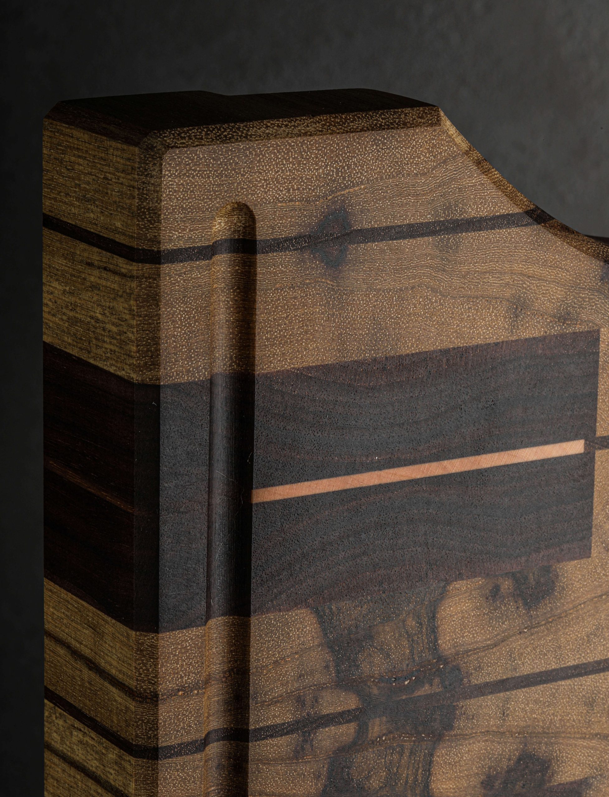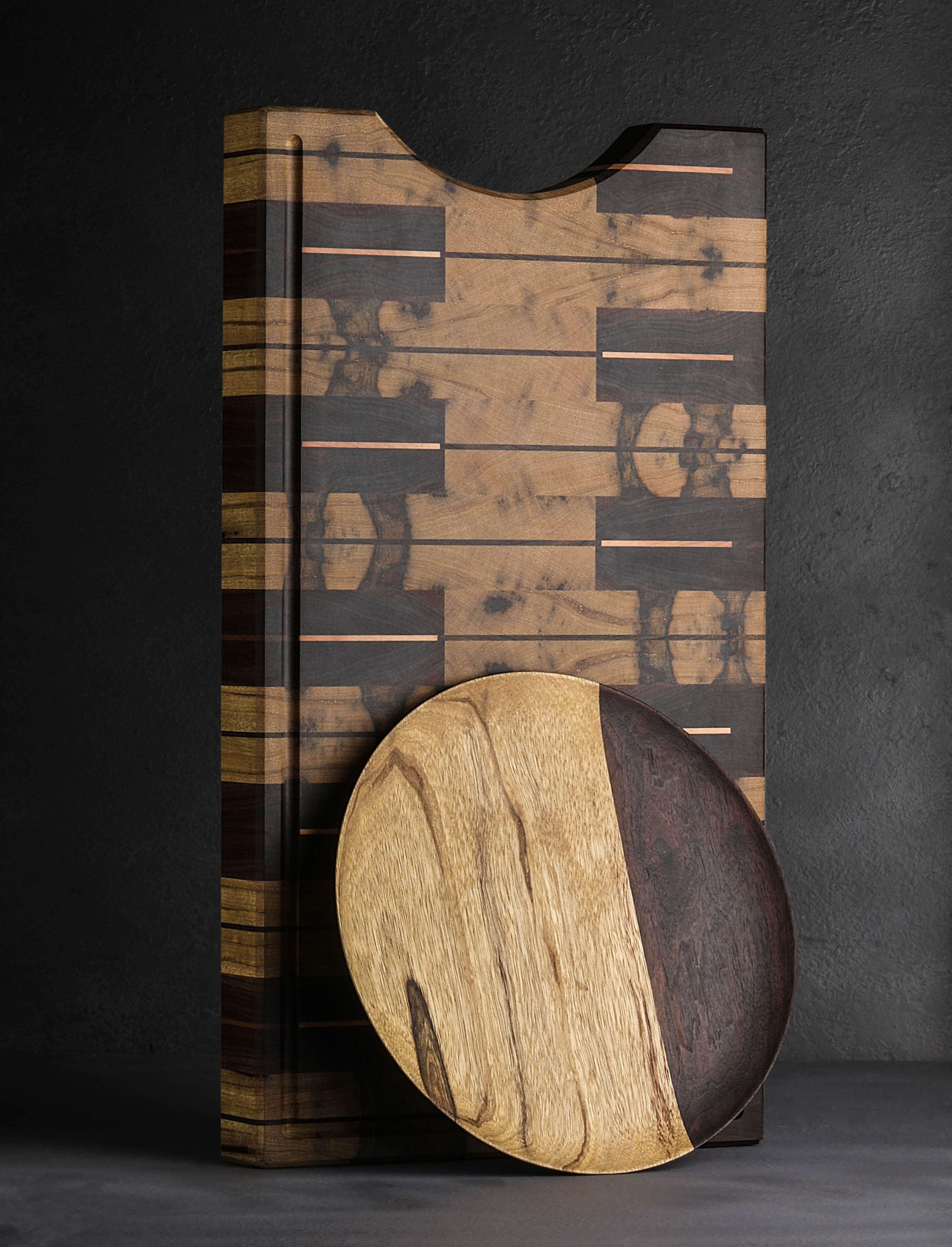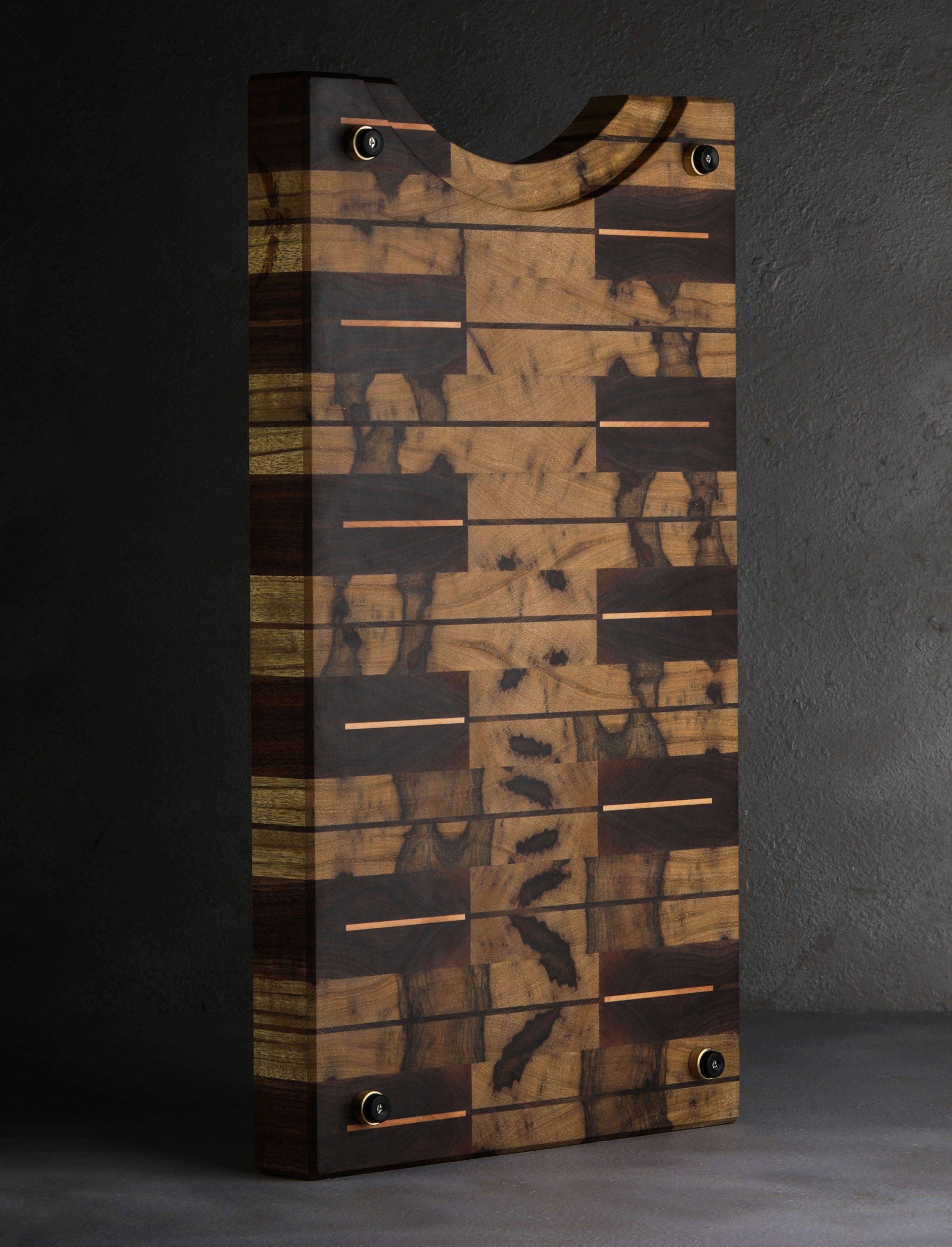 Black limba, black walnut, and maple form the Double Black end-grain butcher block by cutting board whisperer Luke Martin of Owl Woodworks. Meticulously crafted at his studio in western Canada, the sultry black limba seems to mask shadows as they attempt to reveal themselves through the haze of the night. Rays of maple strike through dark anchors of black oak to ground the one-of-a-kind culinary tool created of unexpected organic matter. Juice grooves are milled along two perpendicular sides, with a half-moon cutout at the opposite short side, under which the matching, hand-turned plate fits snugly. For a solid, slip-free cutting experience, premium brass, stainless, and silicone feet are included.