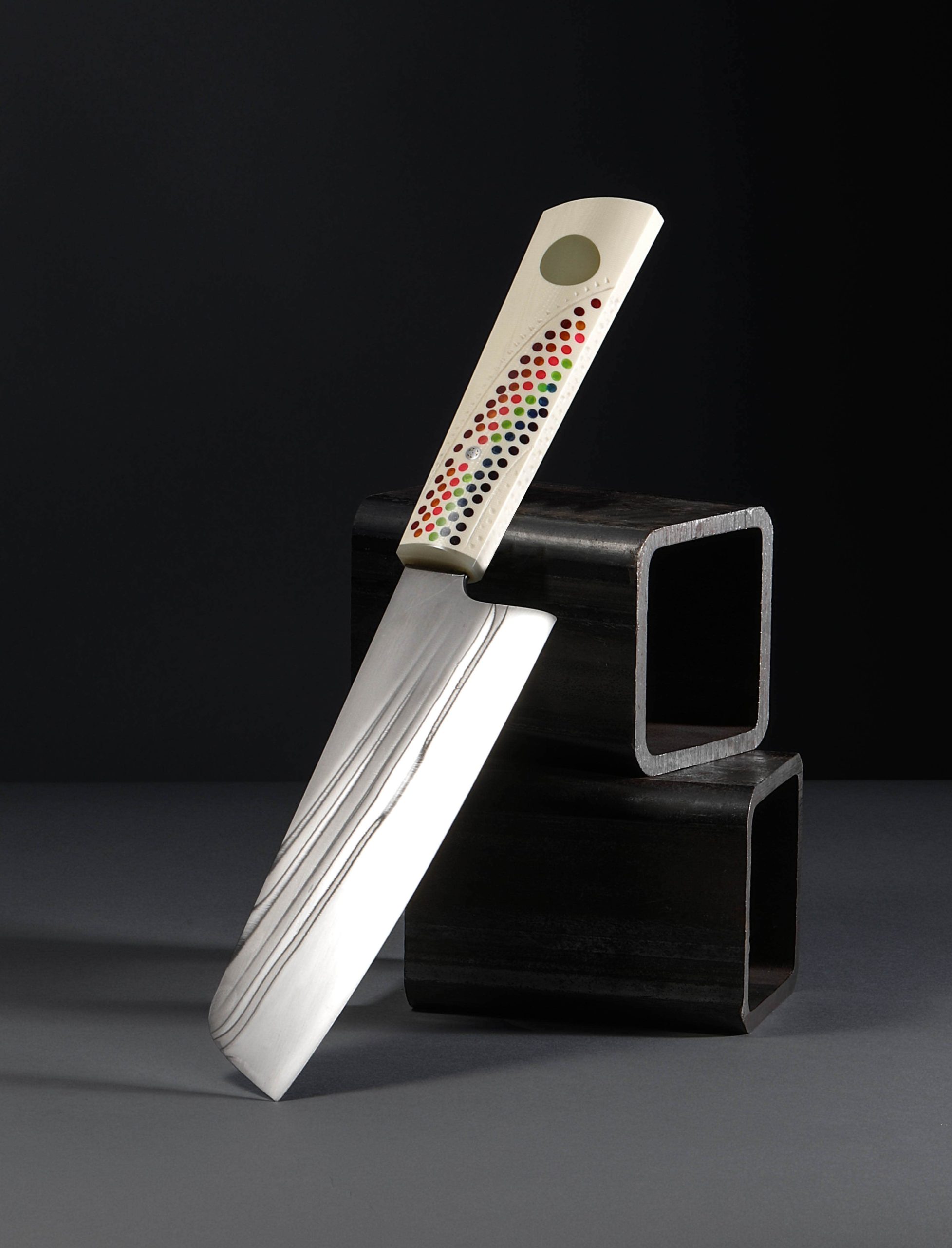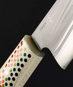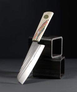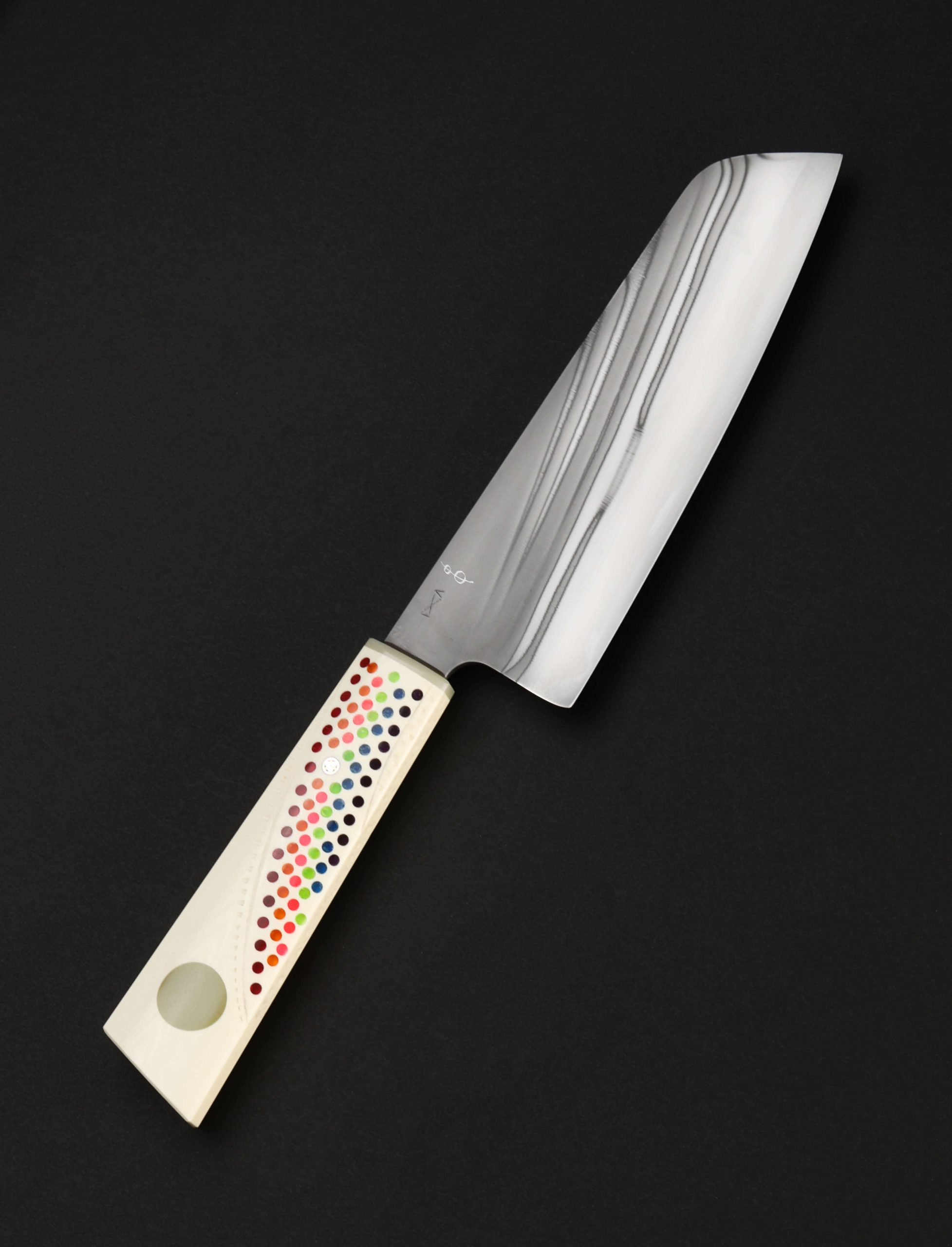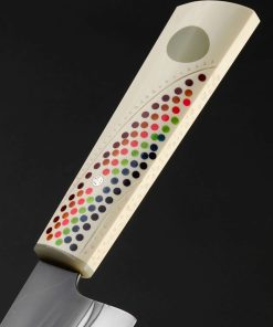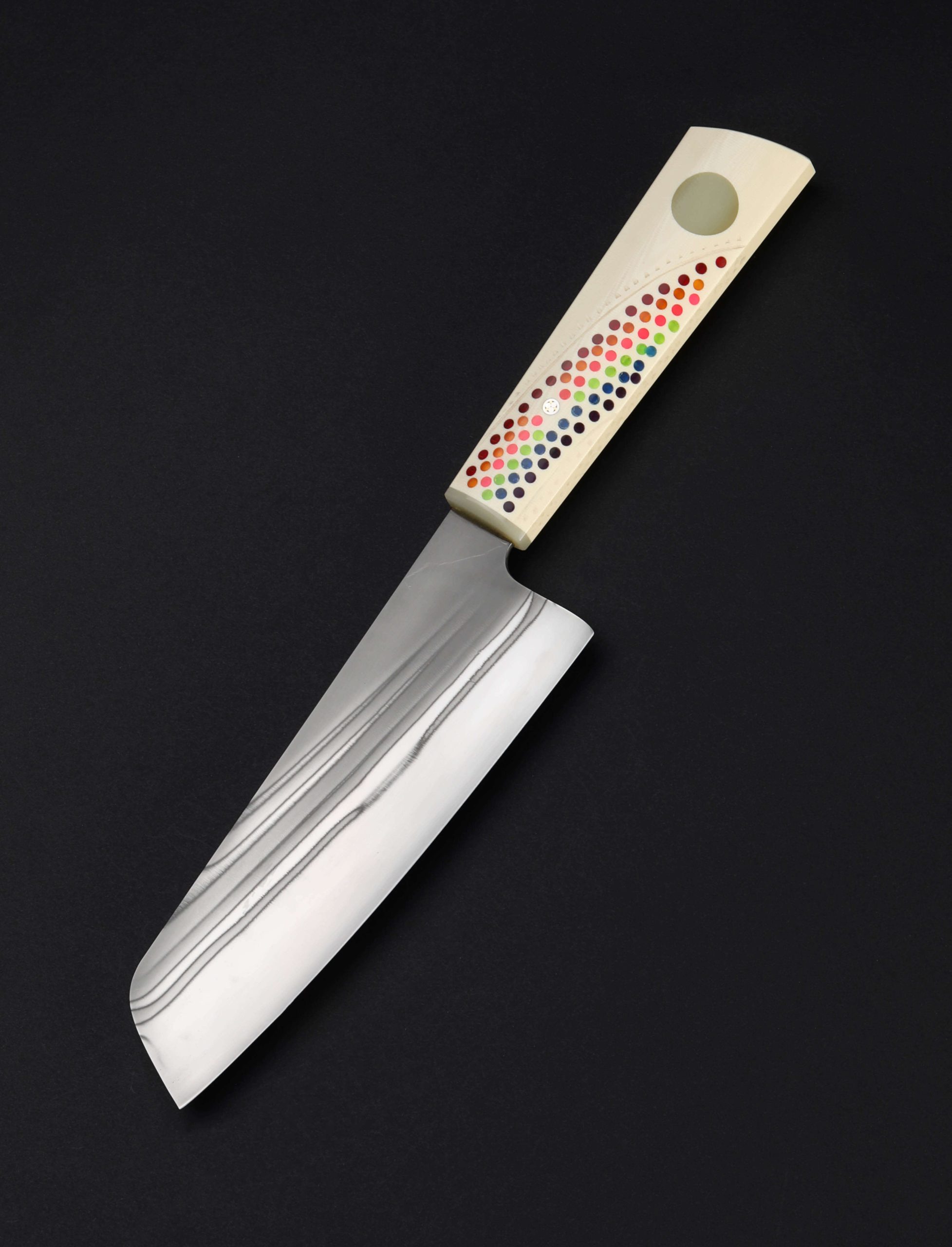 California artist Don Carlos Andrade’s contribution to The Art of Cutlery, a vegetable cleaver named “Double Rainbow,” on show during summer 2024 in Tribeca, NYC, exemplifies this long-time maker’s unique and often-whimsical aesthetic style as well as his function-forward technical excellence informed by his time in fine-dining kitchen. The blade is forged by hand, shaped with Don’s pronounced convex geometry, and given a striking ‘rainbow quench’ during the hardening process. The handle, sculpted in his recognizable, shield-style wa handle rendition, features detail carvings, a rainbow inlay, a single mosaic pin, and translucent green ferrule. Sharp and ready to use, this knife is built for cooking daily.