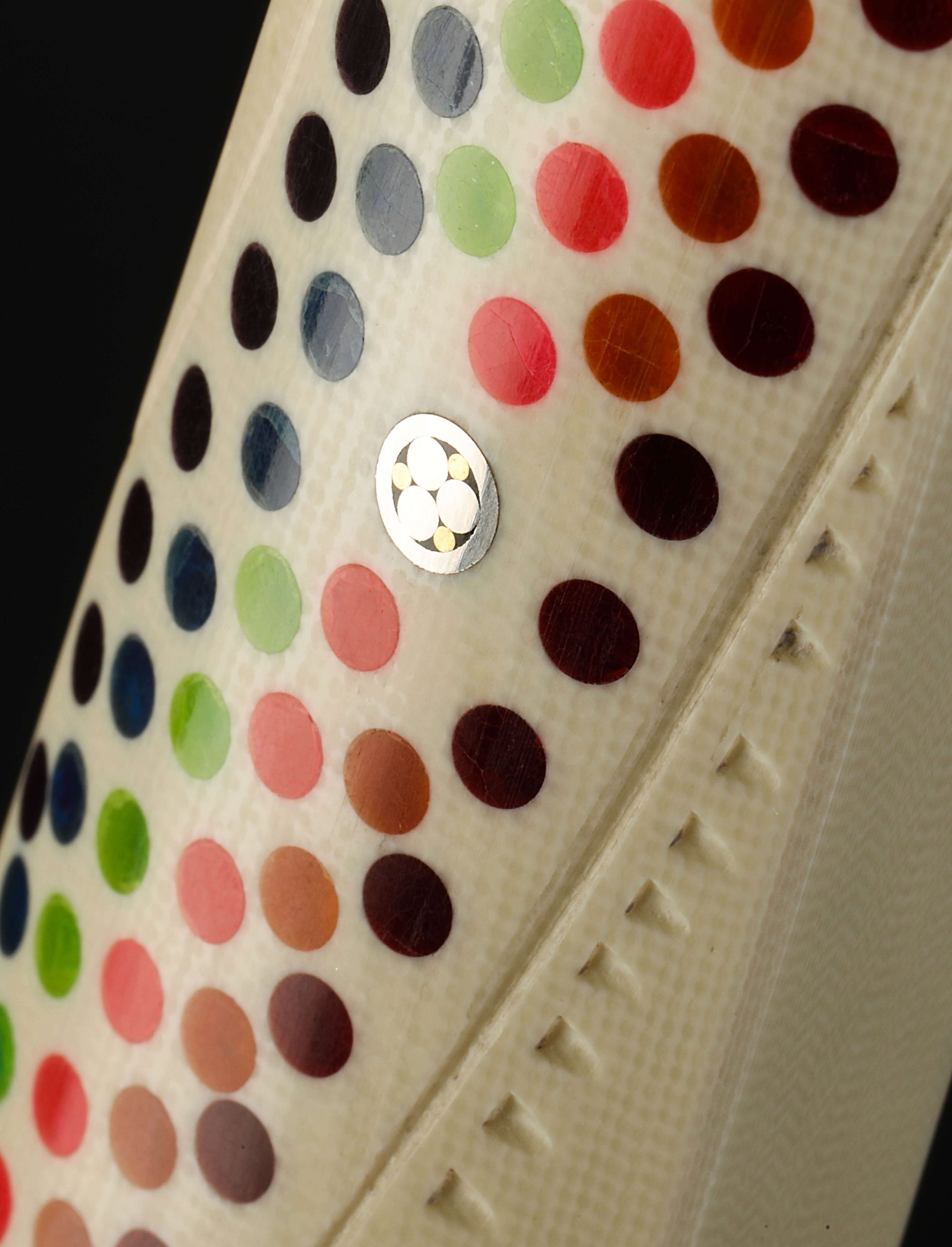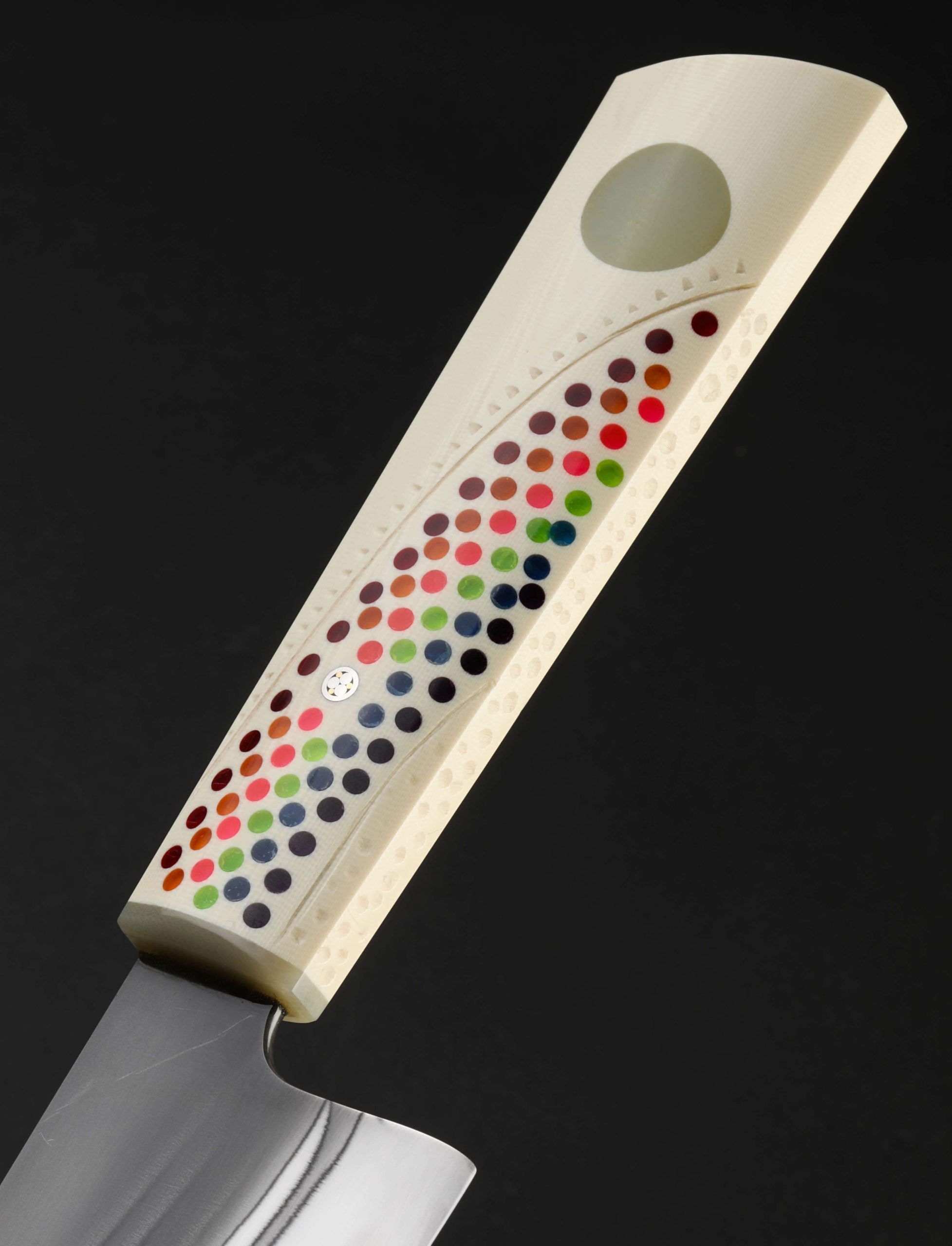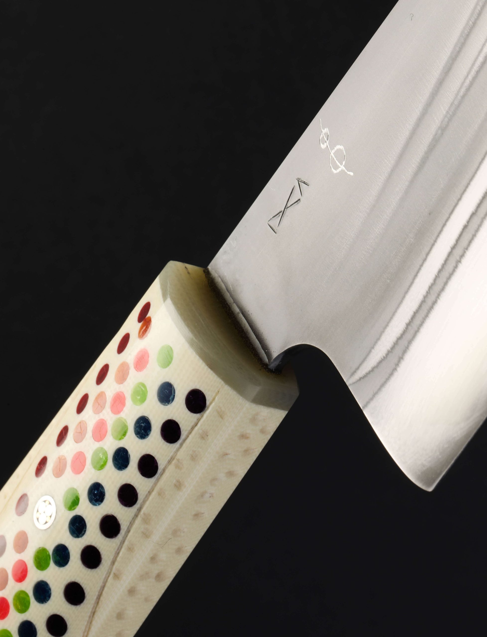 California artist Don Carlos Andrade’s contribution to The Art of Cutlery, a vegetable cleaver named “Double Rainbow,” on show during summer 2024 in Tribeca, NYC, exemplifies this long-time maker’s unique and often-whimsical aesthetic style as well as his function-forward technical excellence informed by his time in fine-dining kitchen. The blade is forged by hand, shaped with Don’s pronounced convex geometry, and given a striking ‘rainbow quench’ during the hardening process. The handle, sculpted in his recognizable, shield-style wa handle rendition, features detail carvings, a rainbow inlay, a single mosaic pin, and translucent green ferrule. Sharp and ready to use, this knife is built for cooking daily.