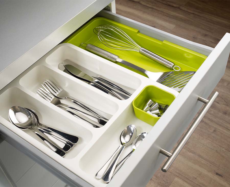 This clever drawer organiser can be expanded or compacted to fit a range of different drawer sizes and comes with several compartments for all your cutlery and utensils.