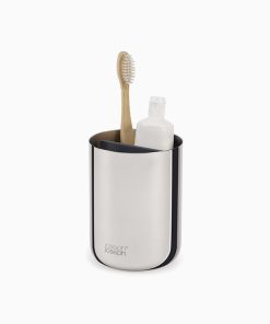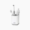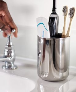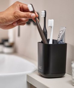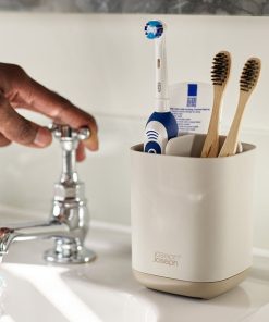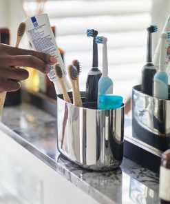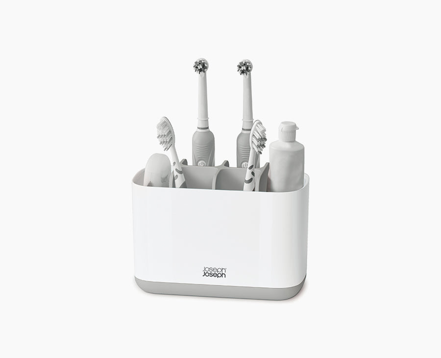 These toothbrush caddies have different sections for organising a variety of oral care items such as manual or electric toothbrushes and toothpaste tubes.