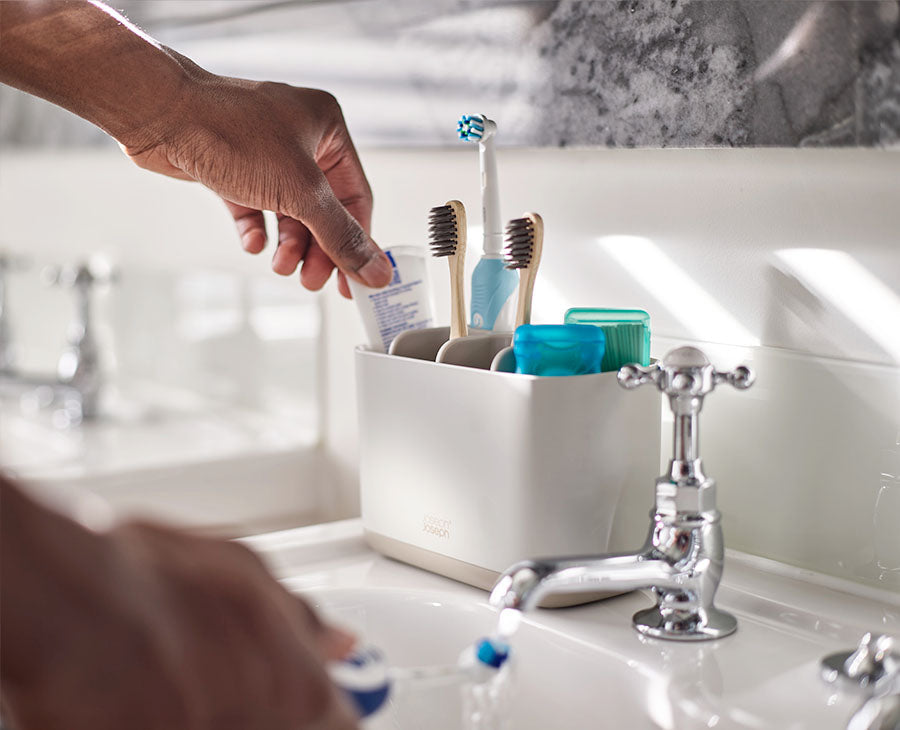These toothbrush caddies have different sections for organising a variety of oral care items such as manual or electric toothbrushes and toothpaste tubes.