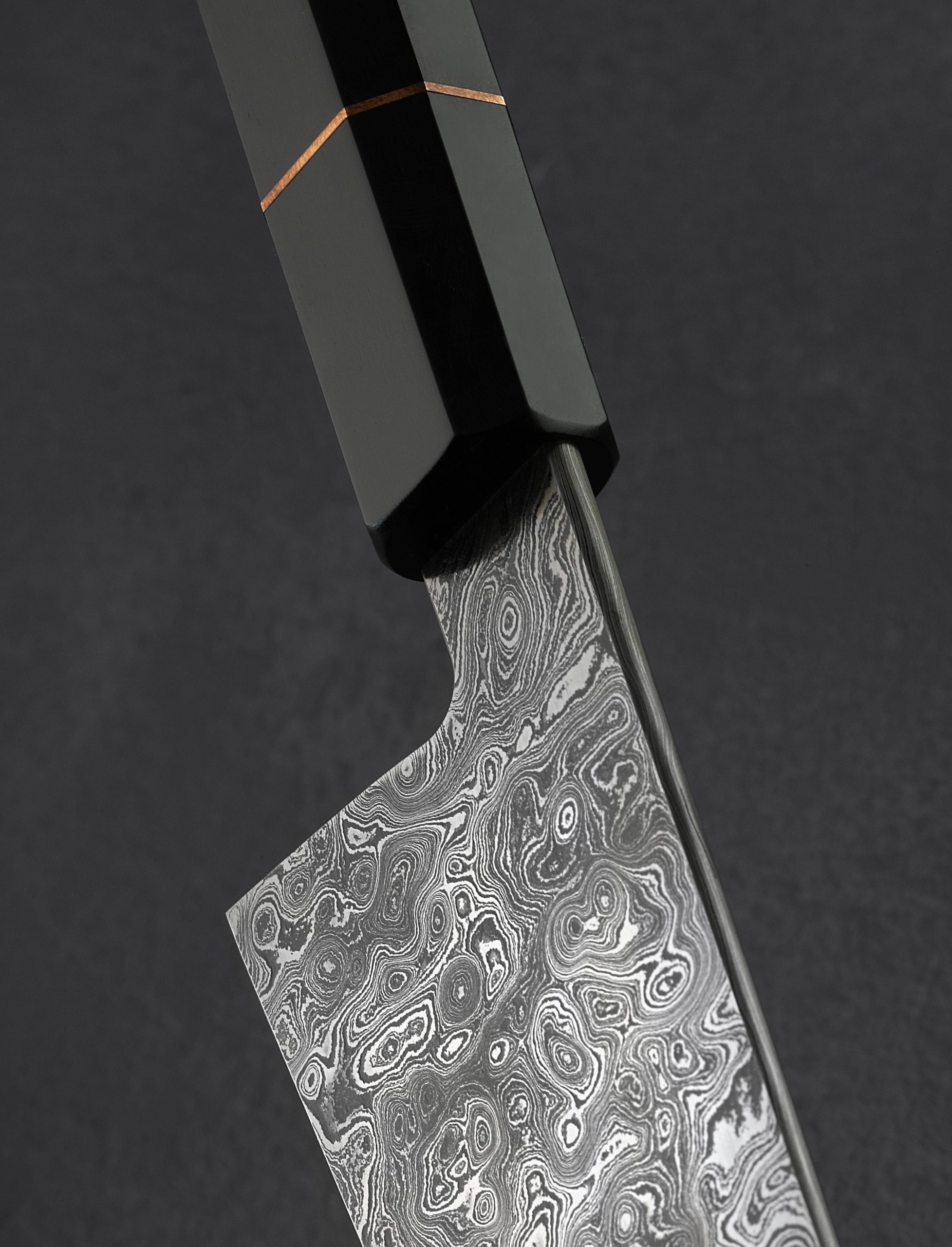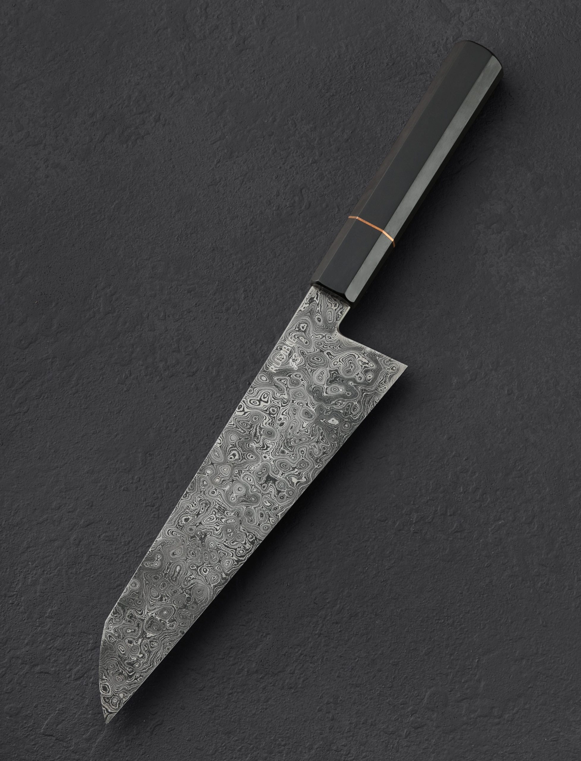 Forged by hand from Jackson Rumble’s mesmerizing random pattern carbon damascus, this gyuto is the light, thin, kitchen laser of our dreams. At 6.1oz / 172g and balancing just in front of the elegant and classic handle, the blade moves effortlessly, designed, and built for precision vegetable chopping, detail work, and slicing of everything from proteins to accoutrements. Tall, slim, superbly convex blade bevels receive a beautiful polish and etch to reveal a pattern of alternating alloys in which you can get lost. The blade’s spine, rounded and comfortable like the accompanying choil, tapers steadily from the handle to a very fine, needle-like tip. A small amount of lateral flexibility is welcomed in the front half of the blade. For push-pull cutting and nimble tip work, the edge profile is nearly flat throughout. For comfort and control, Jackson has sculpted a piece of dark, gorgeous ebony accented with a bronze spacer, rounded and finished for great looks and an even better feel in the hand.