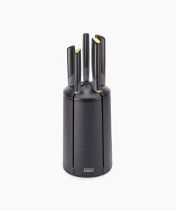 - Rotating knife block features vertical slots for easy access and has a non-slip base