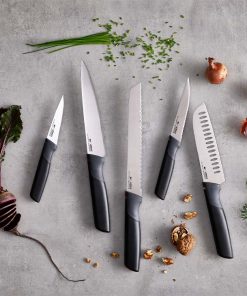 - Weighted handles and integrated knife rests prevent blades from touching the work surface when placed down