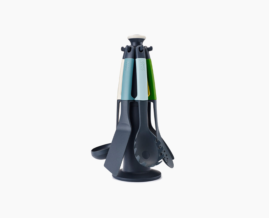 - Set includes: slotted spoon, spaghetti server, solid spoon, slotted turner, flexible turner and ladle