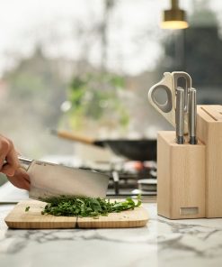 Crafted from Japanese stainless-steel, the knives, cleaver and scissors in this kitchen knife set are designed for precision and come housed in a beechwood block. Elevate™ technology minimises mess by keeping tool tips off work surfaces with weighted handles and integrated rests.