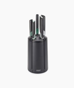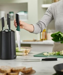 - Rotating knife block features vertical slots for easy access and has a non-slip base