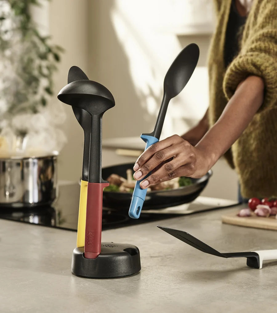 Designed with weighted handles and integrated tool rests, our Elevate™ utensils minimise mess in the kitchen by keeping the head of the utensil raised up when placed down. Elevate™ Slim includes a solid spoon, slotted spoon, slotted turner and a ladle, all with nylon tool heads and ergonomic, heat-resistant handles. Store them on the compact storage stand when not being used.