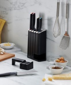 This stylish set comprises five knives with Japanese stainless-steel blades and ergonomic handles plus a smart, slimline knife block that features easy-access knife slots and a removable, two-stage ceramic sharpener in the base.