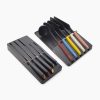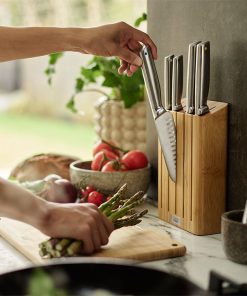 Crafted from Japanese stainless-steel, each knife in this set is designed for precise cutting and comes housed in a bamboo knife block. Elevate™ technology minimises mess by keeping the knife tips off work surfaces with weighted handles and integrated tool rests.