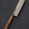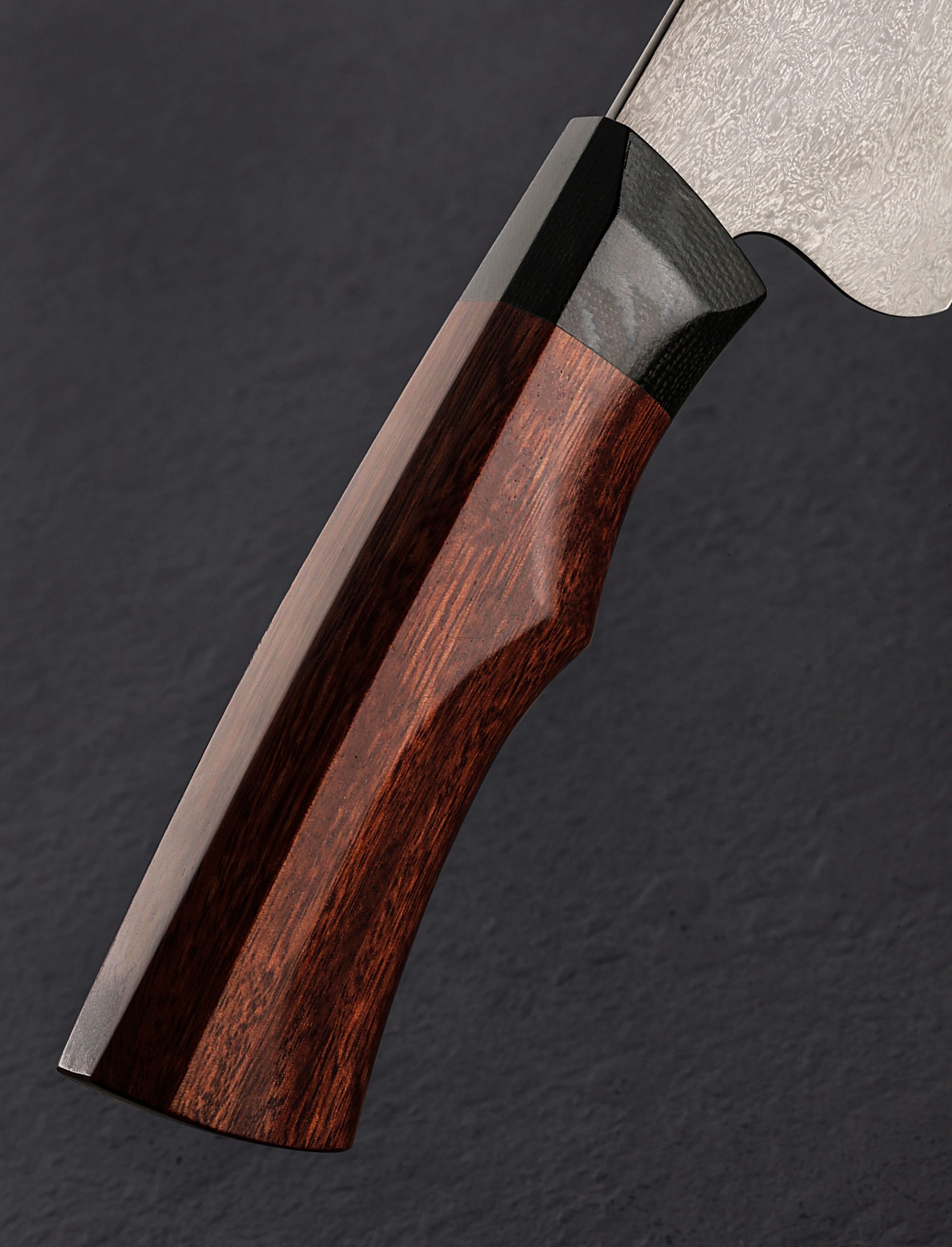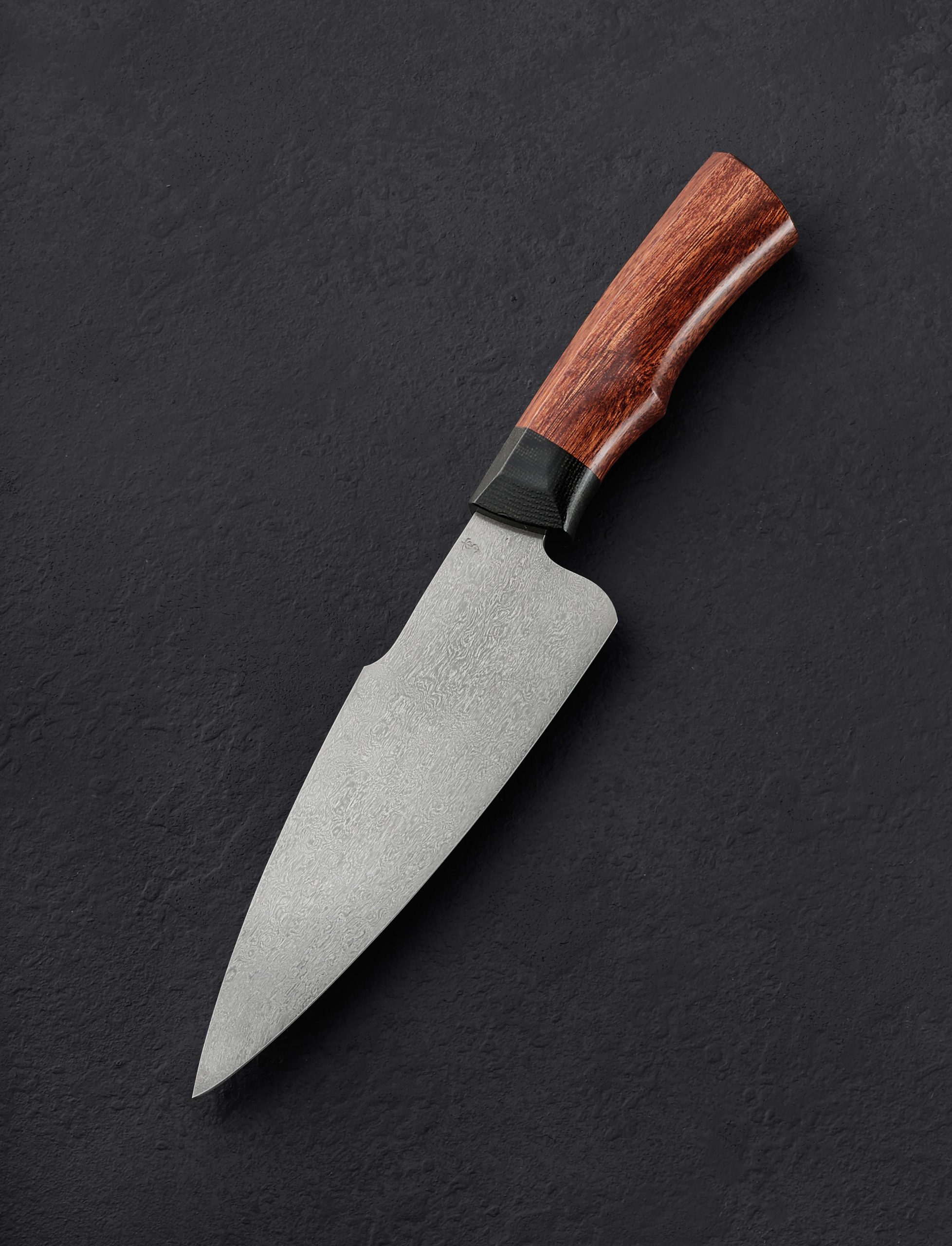 From the gorgeous eucalyptus wood handle capped with black linen micarta and matching, cross-cut micarta retention bolt cap in the rear, to the striking blade shape forged by hand from house-made, traditional wootz steel, this Peter Swarz-Burt creation is a keeper. Peter provides a very versatile, beautifully finished, 180mm / 7″ blade with full-convex bevel geometry, a thin, hard edge, and full-distal taper along the rounded spine leading to a slim, pointed, and strong tip. Stiff and sturdy in the rear where the blade stands 51mm off the board for efficient chopping, whether rocking or push-pull cutting, the bevel geometry changes little moving forward while the spine continues to taper, offering a welcome touch of lateral flexibility in the final inches while maintaining the durability for the most demanding cuts, and the finesse and control needed for precision work. Balanced just at the front of the handle, the knife moves quickly and effortlessly, much the same way the etched and high-polished wootz carbon steel will move through foods. Sculpted into a handsome, Western-influenced form that combines gentle curves with the Japanese wa-style shield profile at its core, faceted along three top planes and rounded along the bottom, the wood and micarta combination fills the hand for a wonderfully tactile experience.
