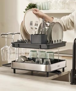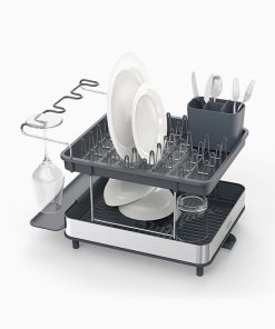 Meet Excel™, the two-tier steel dish rack that offers plenty of draining space without taking over the sink, thanks to its large capacity but small footprint. Its innovative wine-glass rail and integrated drip tray also means you can safely dry delicate glassware without the need to stack them with everything else.