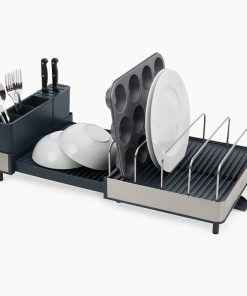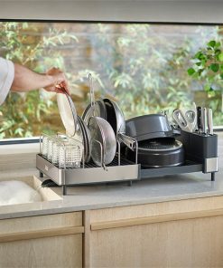This high-capacity dish rack extends to twice its size to hold larger cookware items and prevent dish rack pile-ups. Featuring a movable spout to drain water, a dedicated draining space for cutlery and raised ribs designed to prevent water from becoming trapped under glasses and bowls. Its fingerprint-proof, stainless-steel makes it easy to maintain, and simply slide the expandable sections back after use to be more compact.