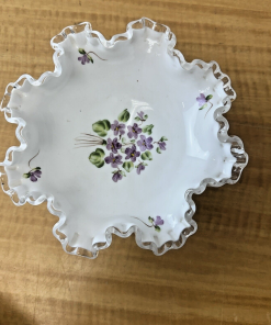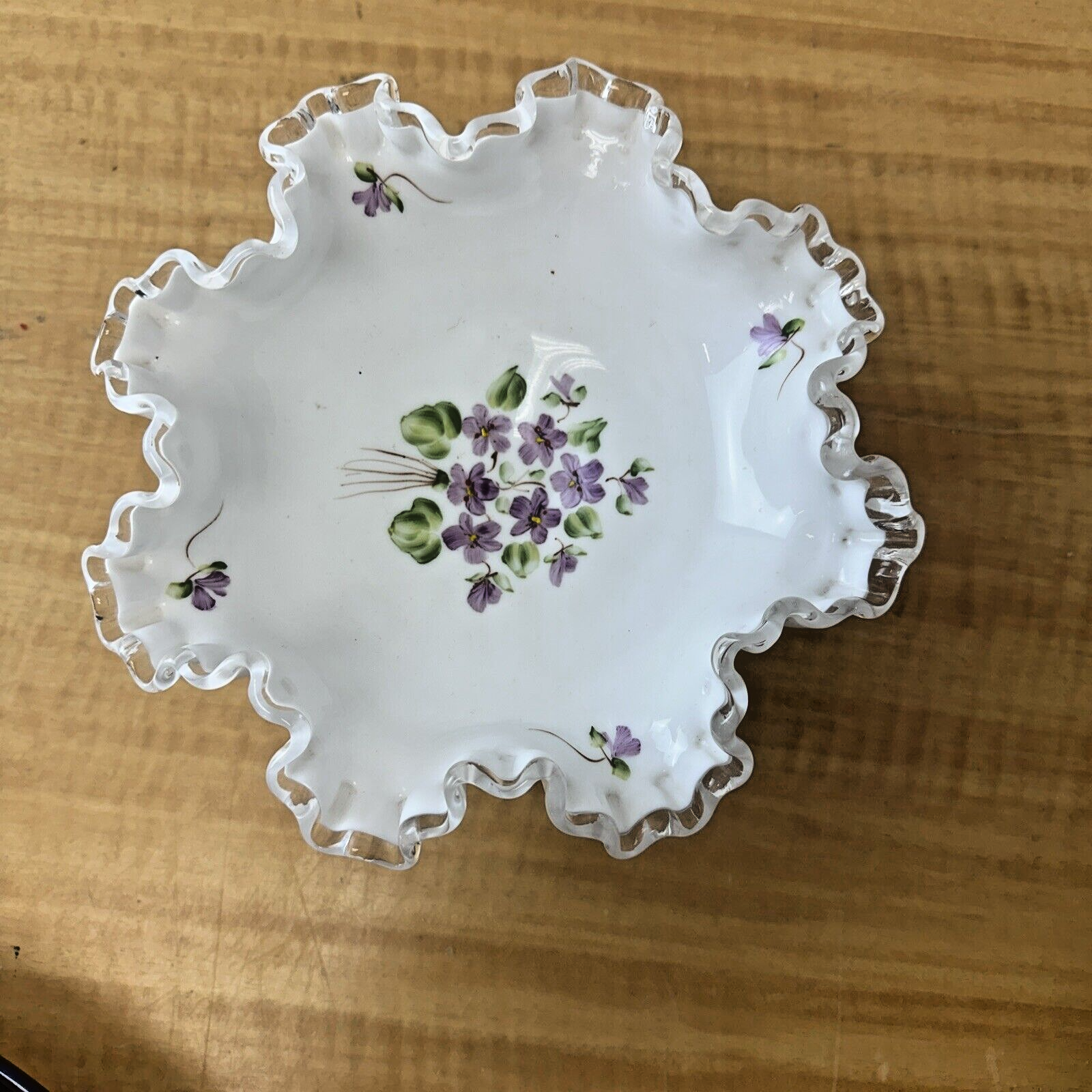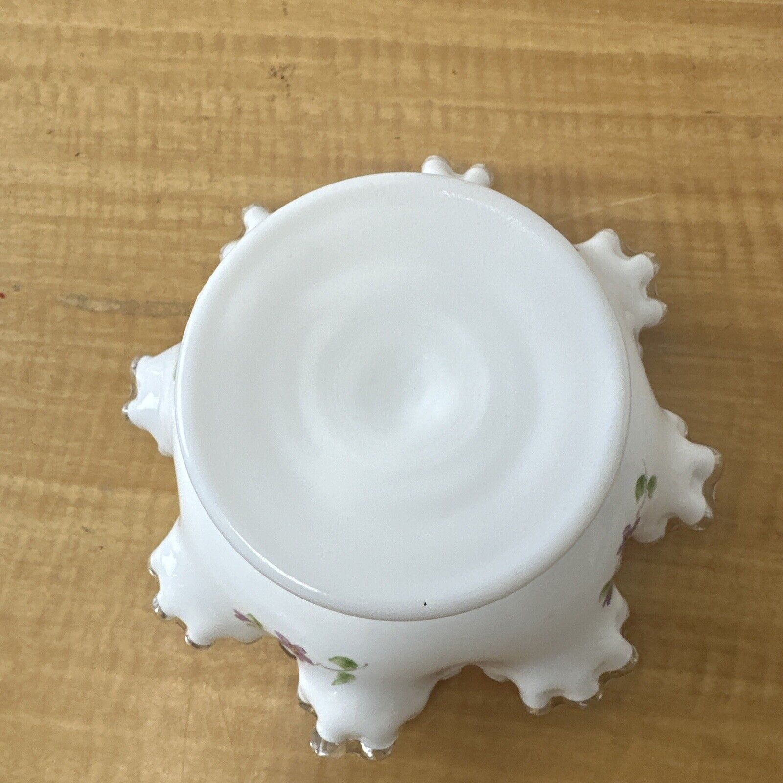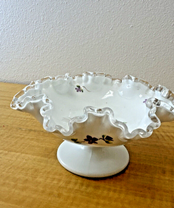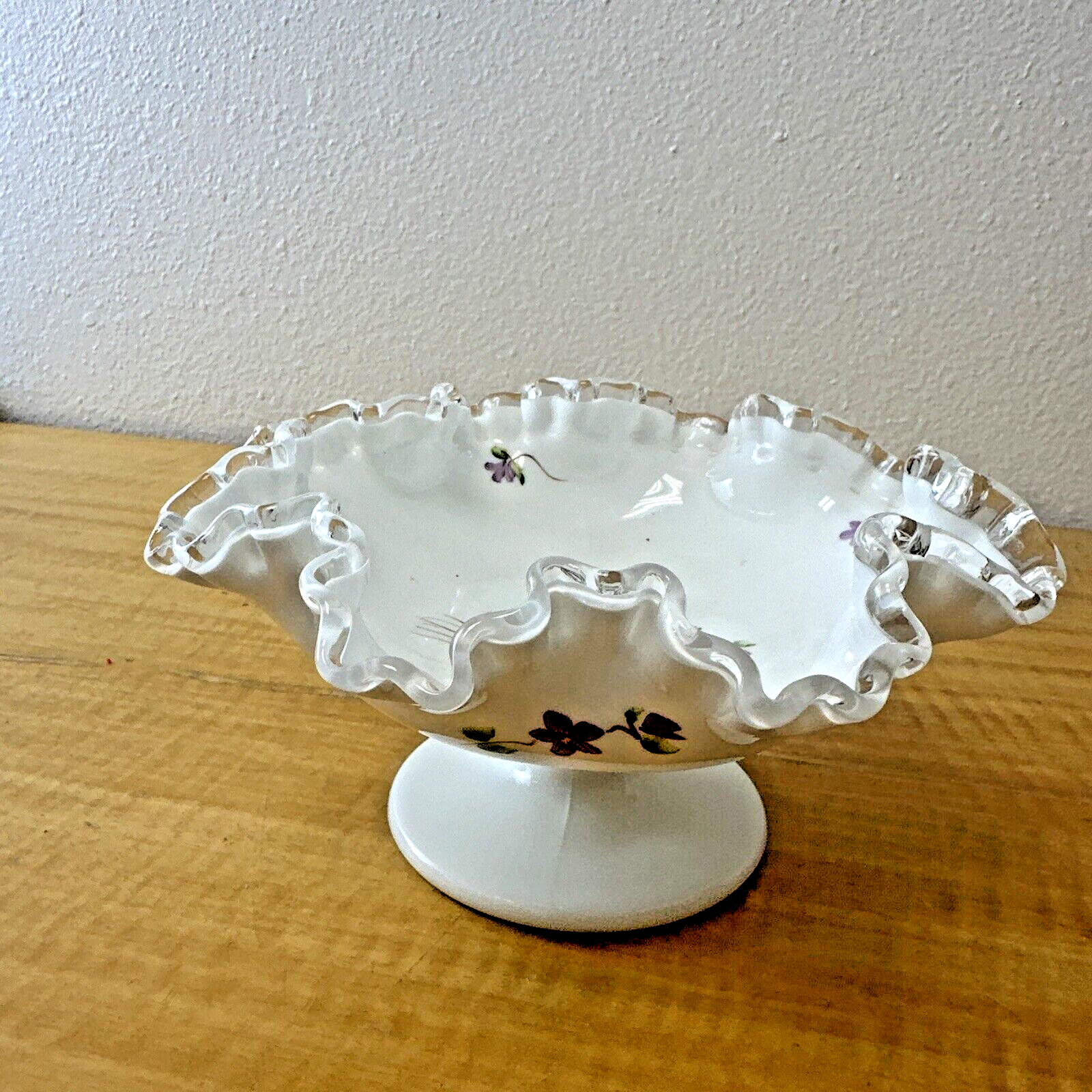 Fenton ‘Violets in the Snow’ White Milk Glass Silver Crest Footed Candy Dish