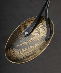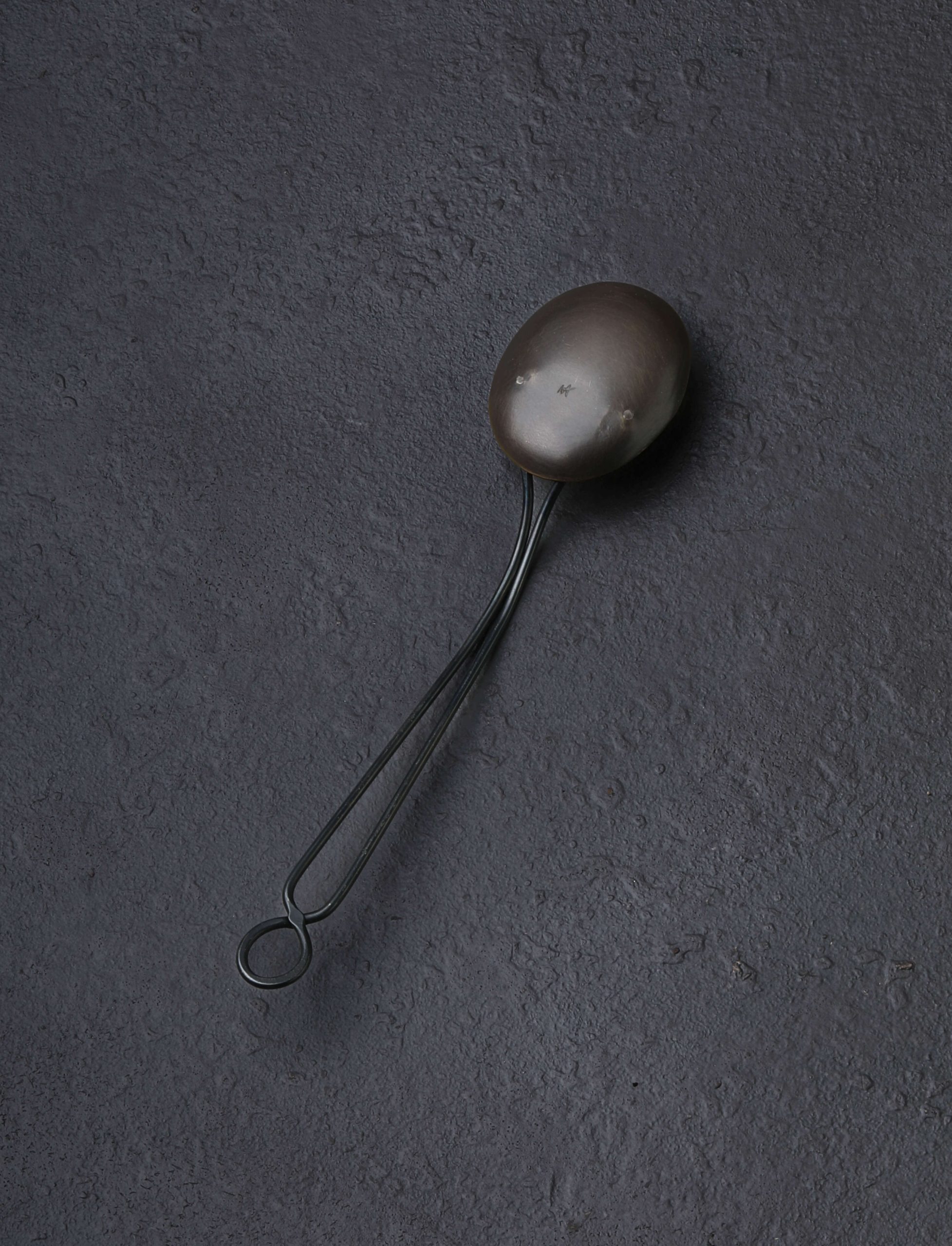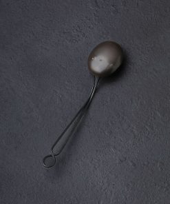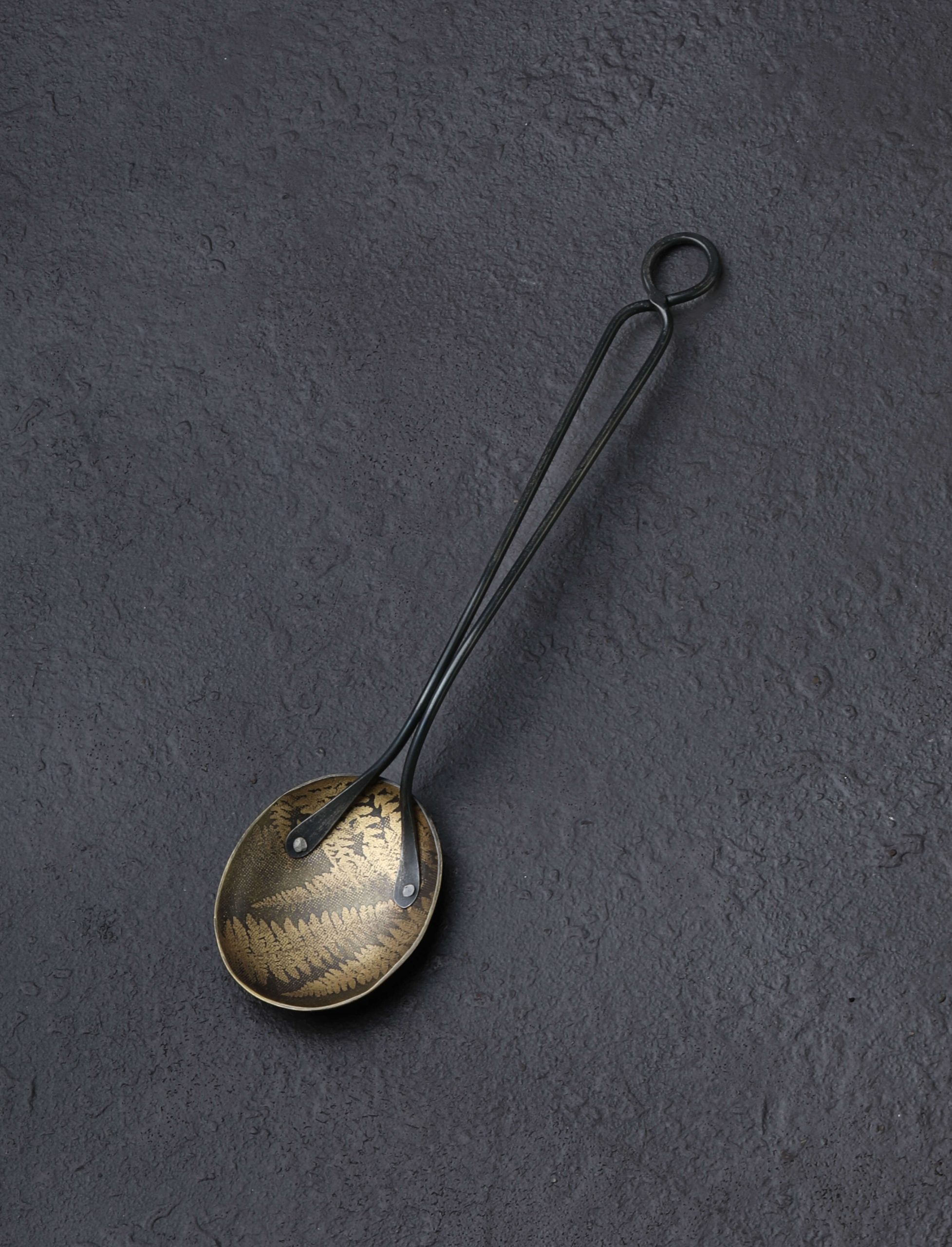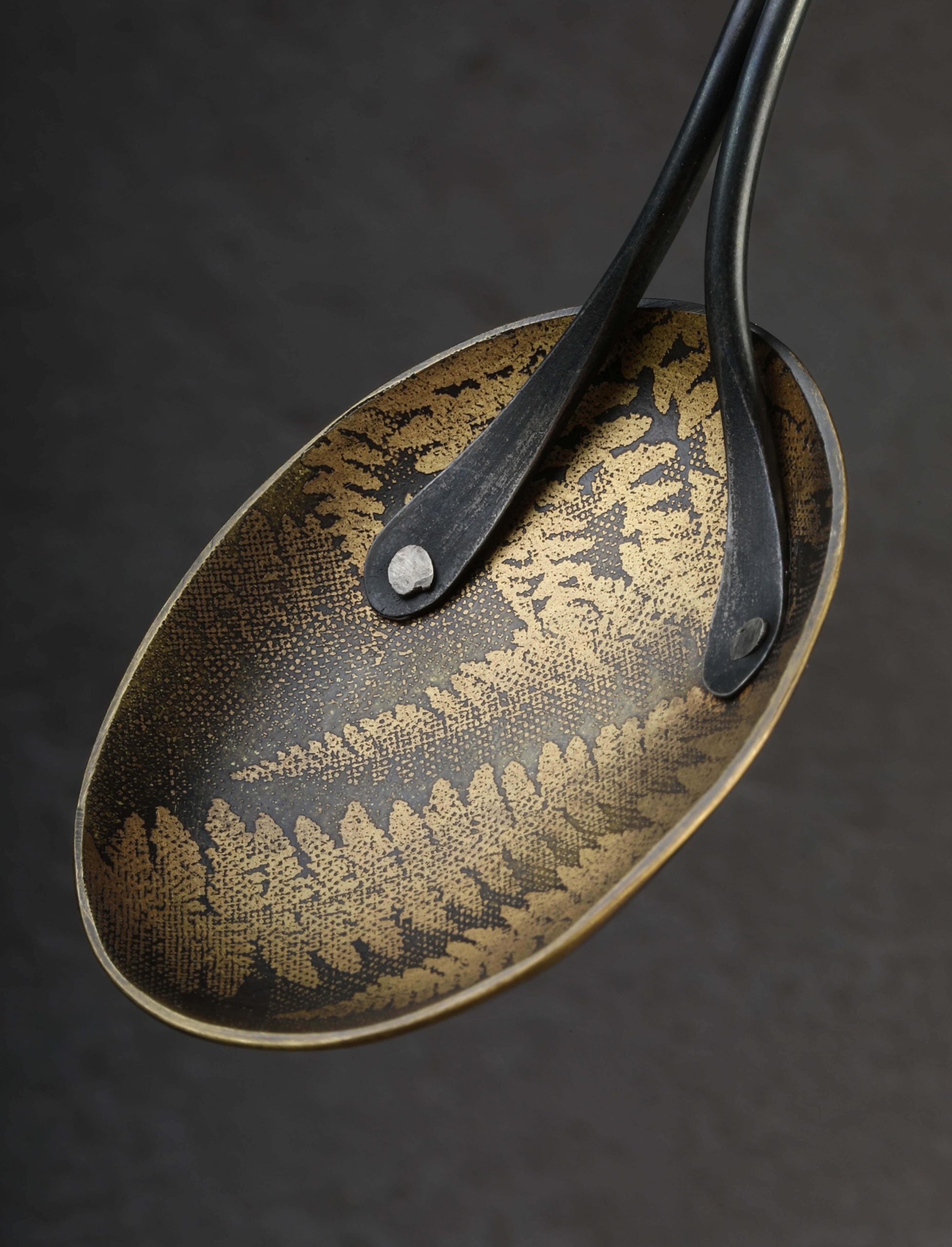 The Foliage Dessert Spoon, or ‘small serving spoon’ as the case may be in any given home, represents the smallest utensil of Michelle Kwiecien’s extraordinary Foliage Collection. Crafted by hand at her Philadelphia studio, Michelle combines metalwork, hand paper-making, and printmaking techniques to produce an heirloom object crafted for generations. The solid brass bowl is embellished with beautiful fern imagery by way of a photo-etching technique and finishing process which produces a warm, nostalgic aesthetic that will turn heads. Delicately forged, the blackened stainless handle is comfortable and elegant, secured to the spoon’s head by a pair of hammered steel pins.