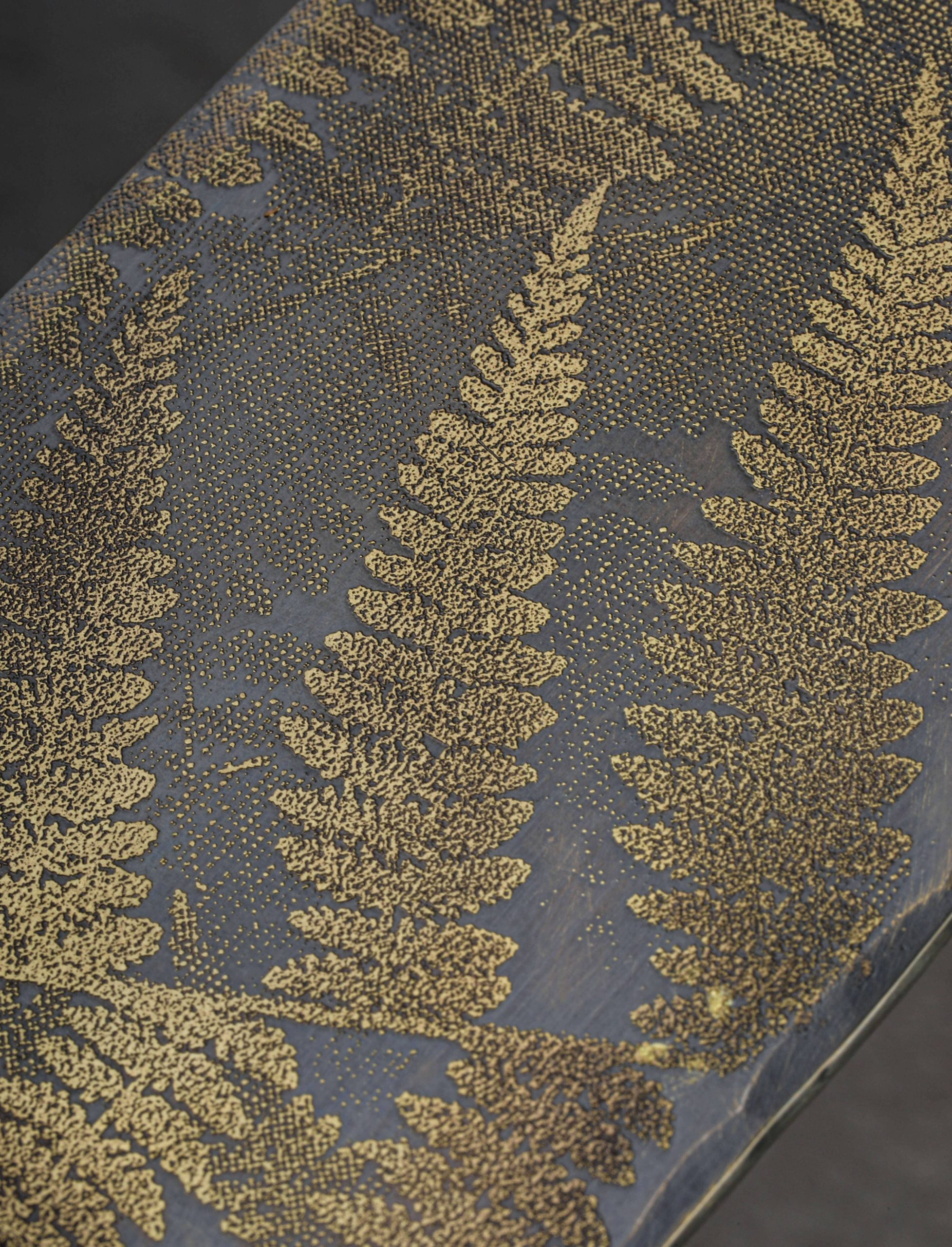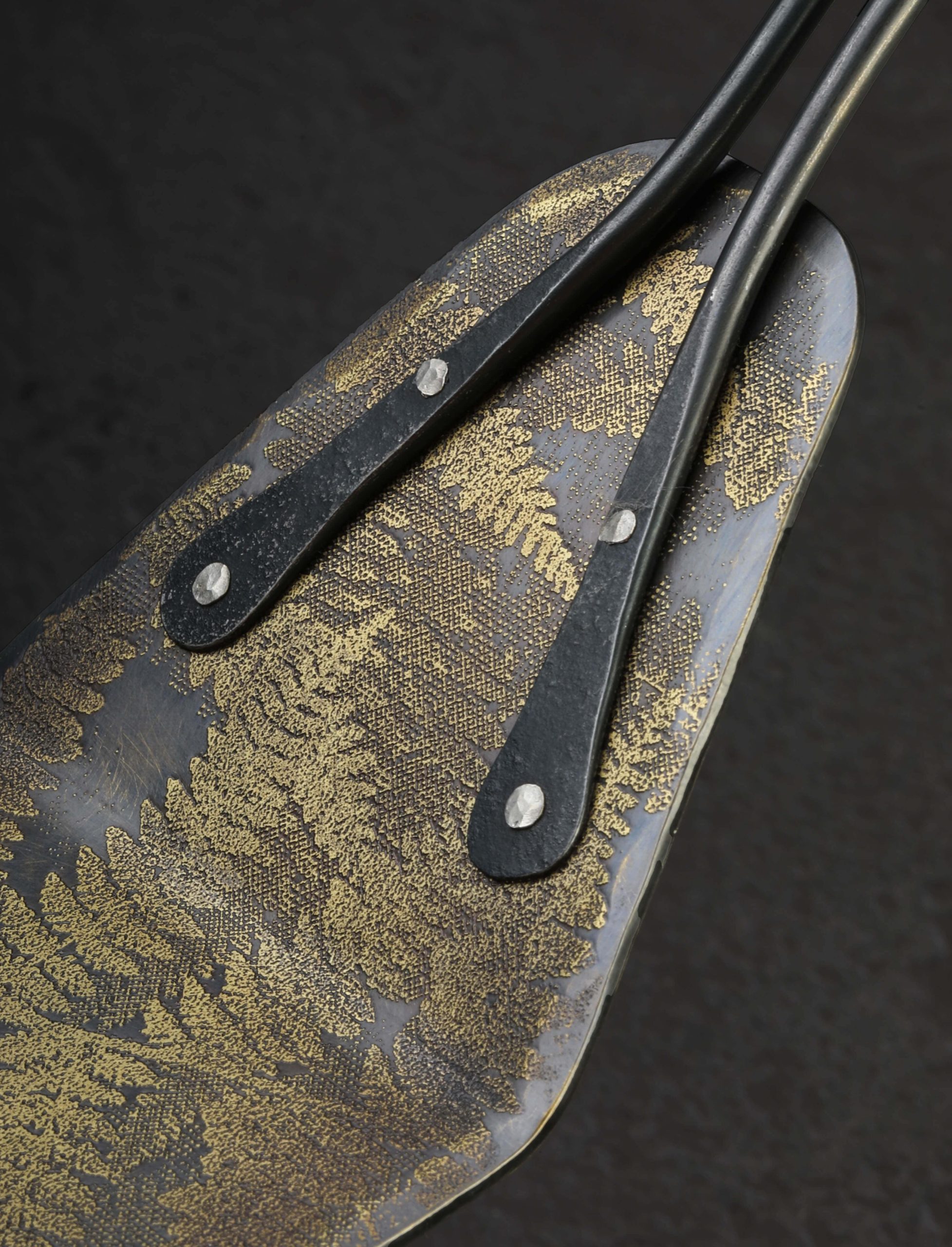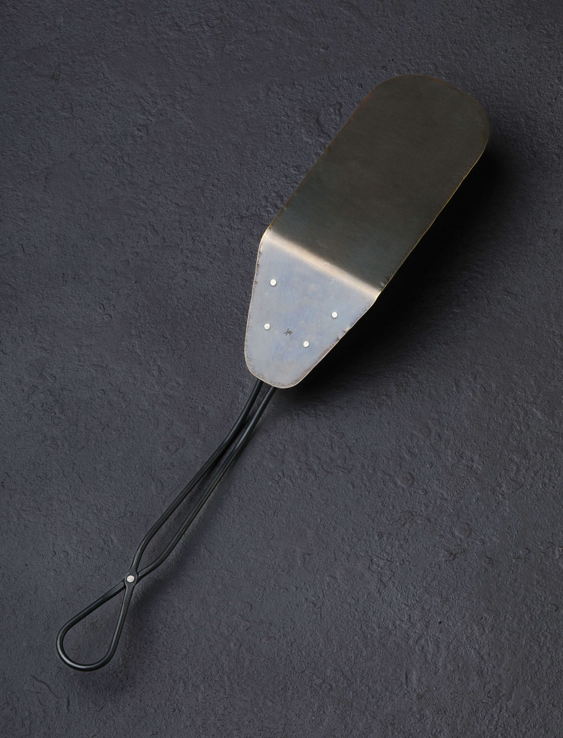 Hand-hewn by artist, blacksmith, papermaker, and printmaker Michelle Kwiecien, this beautiful turning spatula is but one form of culinary art from Foliage Collection of heirloom culinary objects. Combining techniques that span her wide-ranging resume of craft experience, the photo-etched fern imagery which graces the solid brass head is inspired by intaglio printmaking. A feeling of nostalgia and warmth is exuded from each spatula, crafted one by one at Michelle’s Philadelphia studio, from the elegantly forged stainless handle to the simple, hammered steel pins and head-turning, patinated brass. Crafted in small batches exclusively for us, each spatula is a one-of-a-kind.