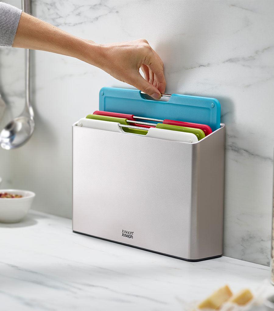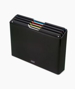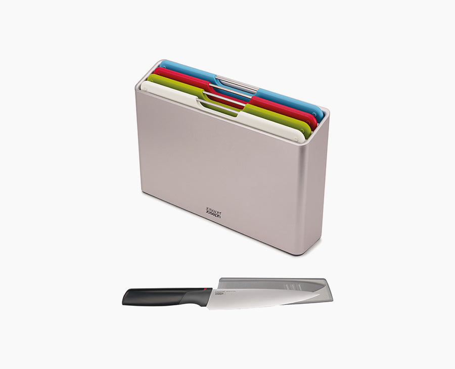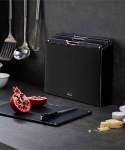 This sleek design features a slimline storage case containing four, large colour-coded boards each with knife-friendly, textured cutting surfaces on both sides and non-slip feet and a free chef’s knife with integrated tool rest and protective storage sheath.