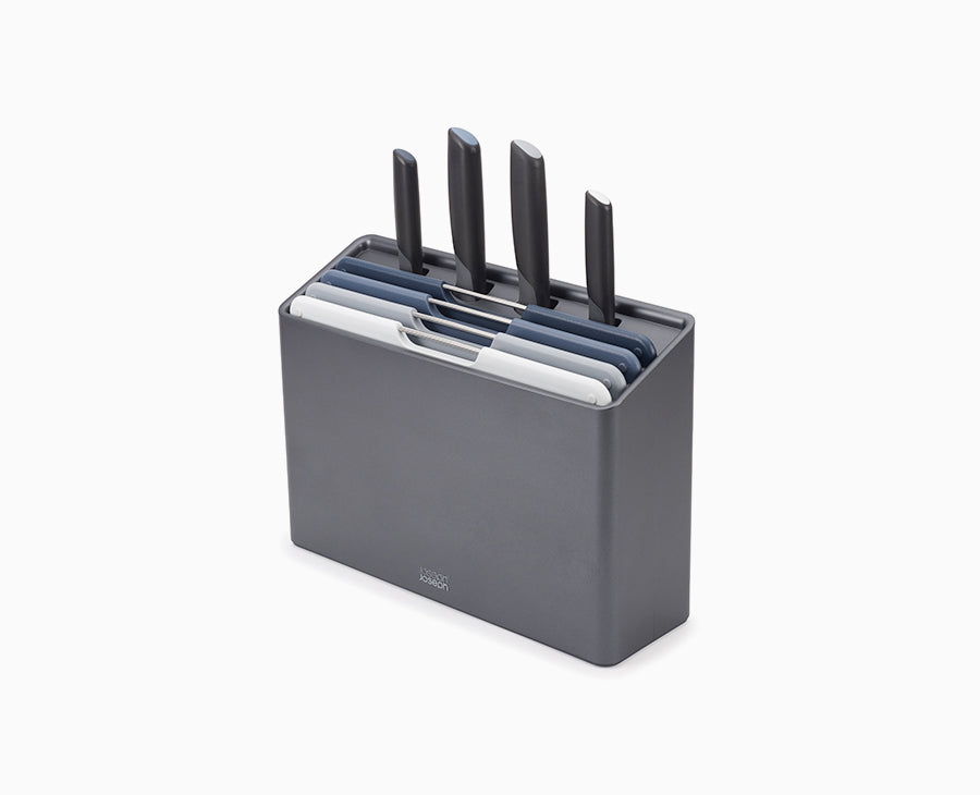 Folio™ Plus brings together four colour-coded chopping boards with four corresponding knives. Each chopping board provides knife-friendly cutting surfaces, stainless-steel selecting bars and non-slip feet. The four Japanese stainless-steel knives feature integrated tool rests that help to improve hygiene and minimise mess when the knife is placed down. Both the chopping boards and knives store in the angled case, keeping the worktop neat and tidy and ensuring your chopping essentials are always within easy reach.