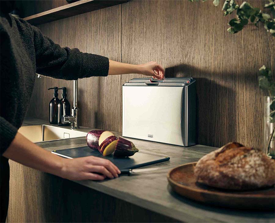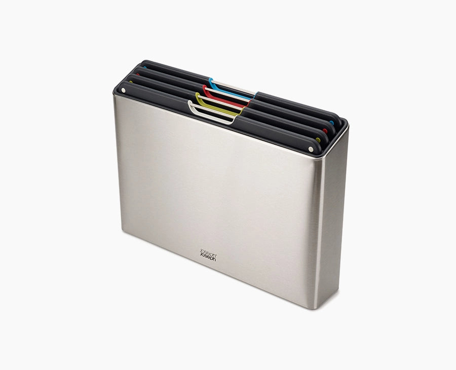 Our 4-piece stainless-steel chopping board set, Folio™ Steel, is perfect for keeping all your boards organised and easy to access. Each chopping board features knife-friendly textured surfaces and colour-coded details to help make food prep more hygienic and efficient. The finishing touch? A stainless-steel case that keeps the boards neat and tidy on the worktop.