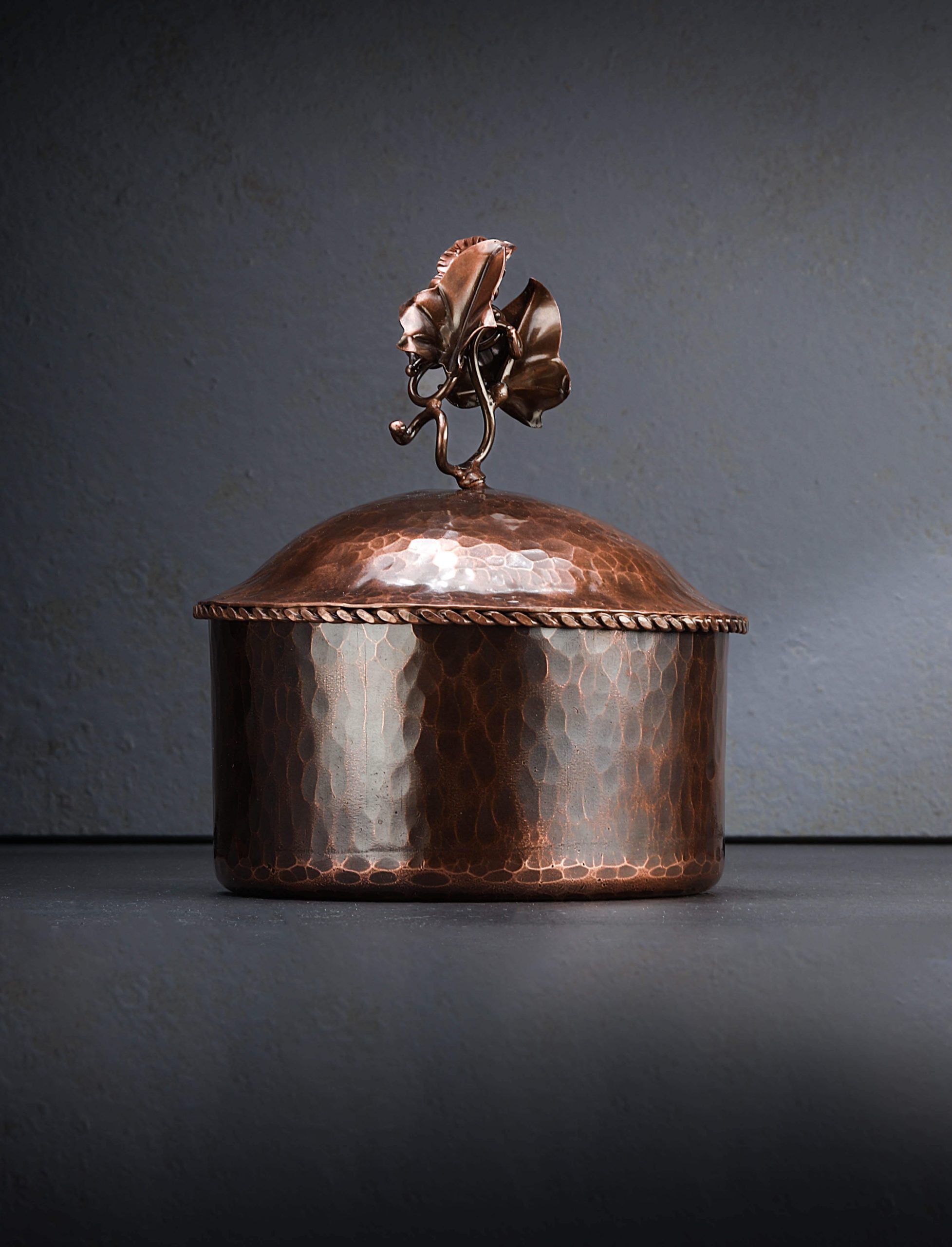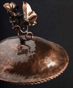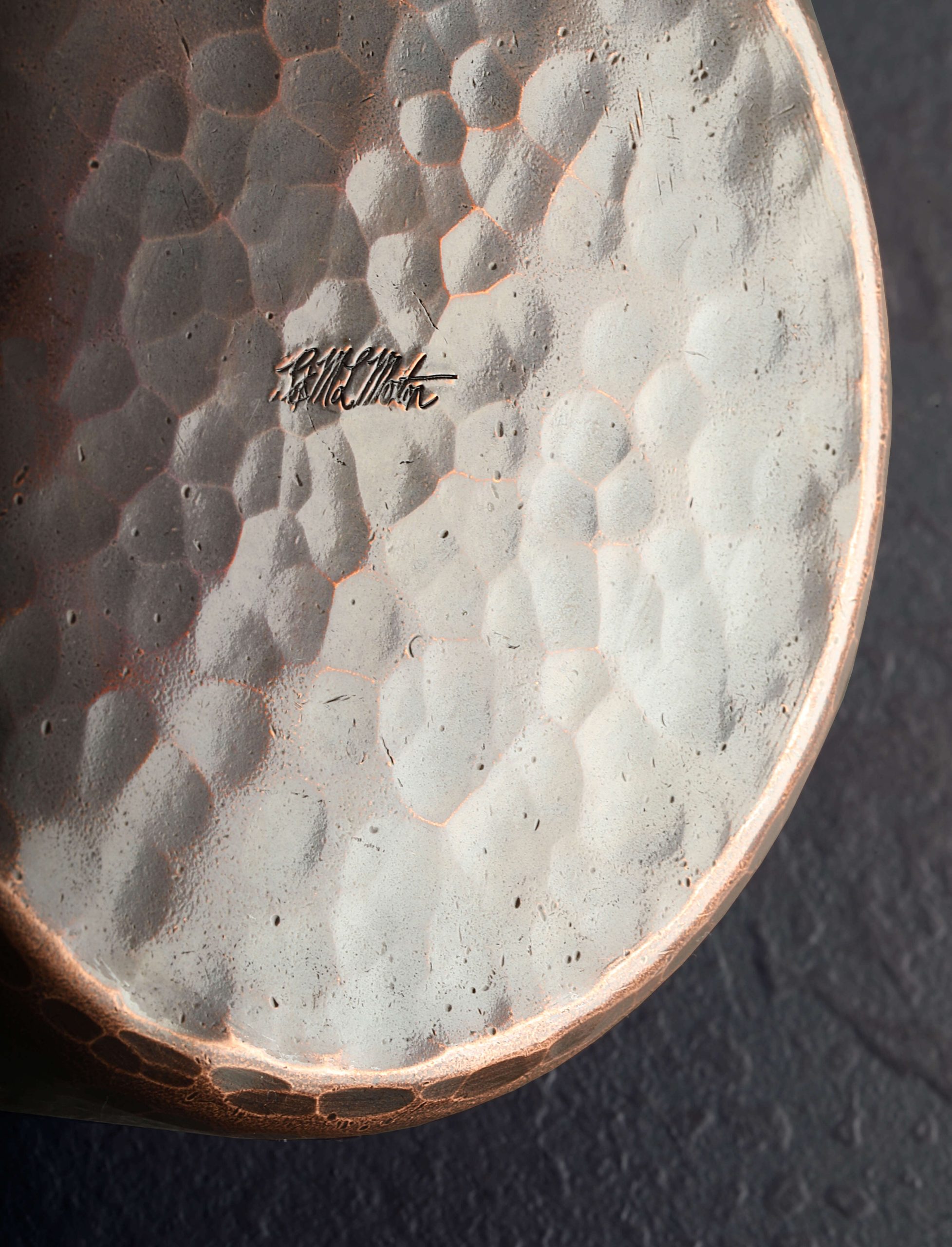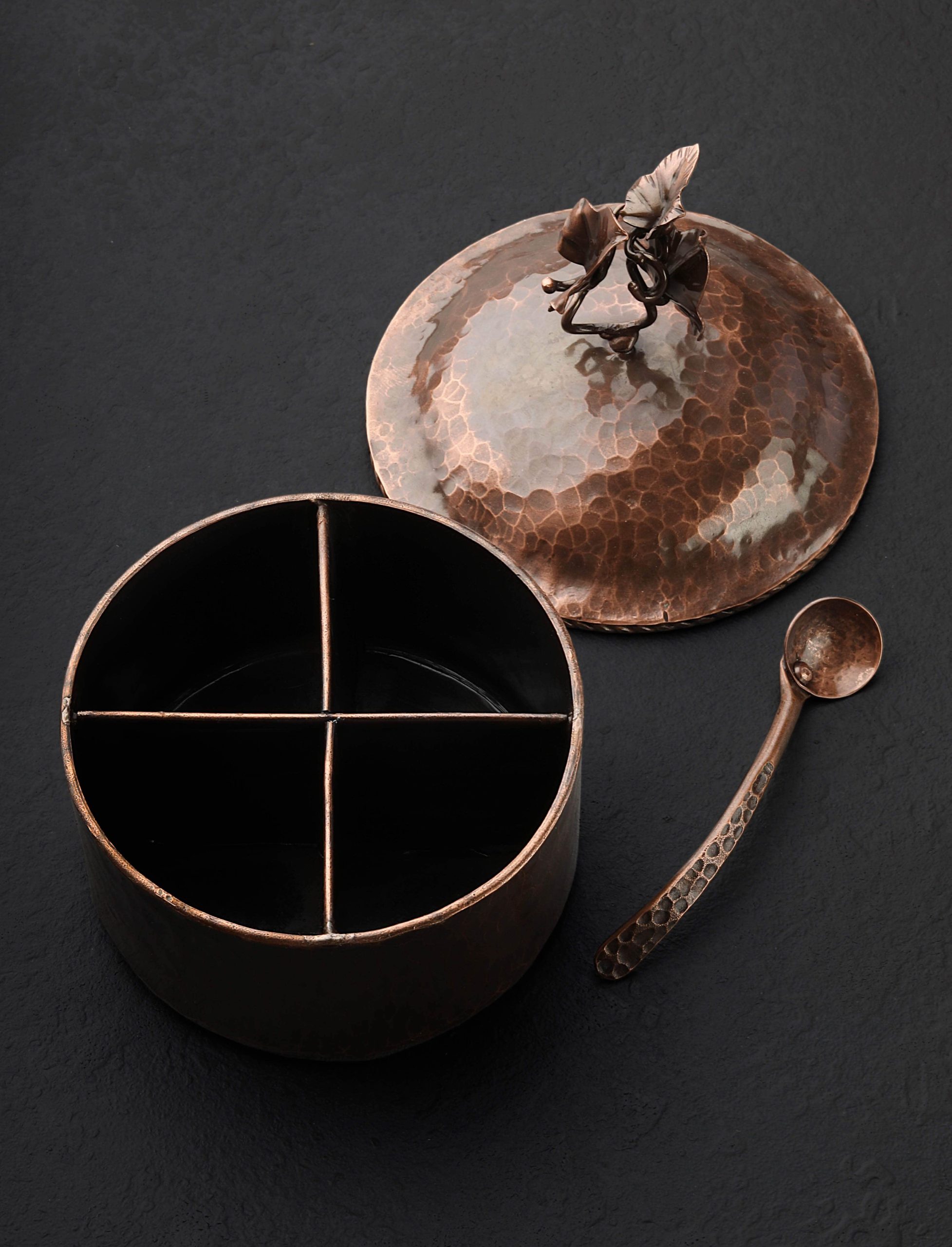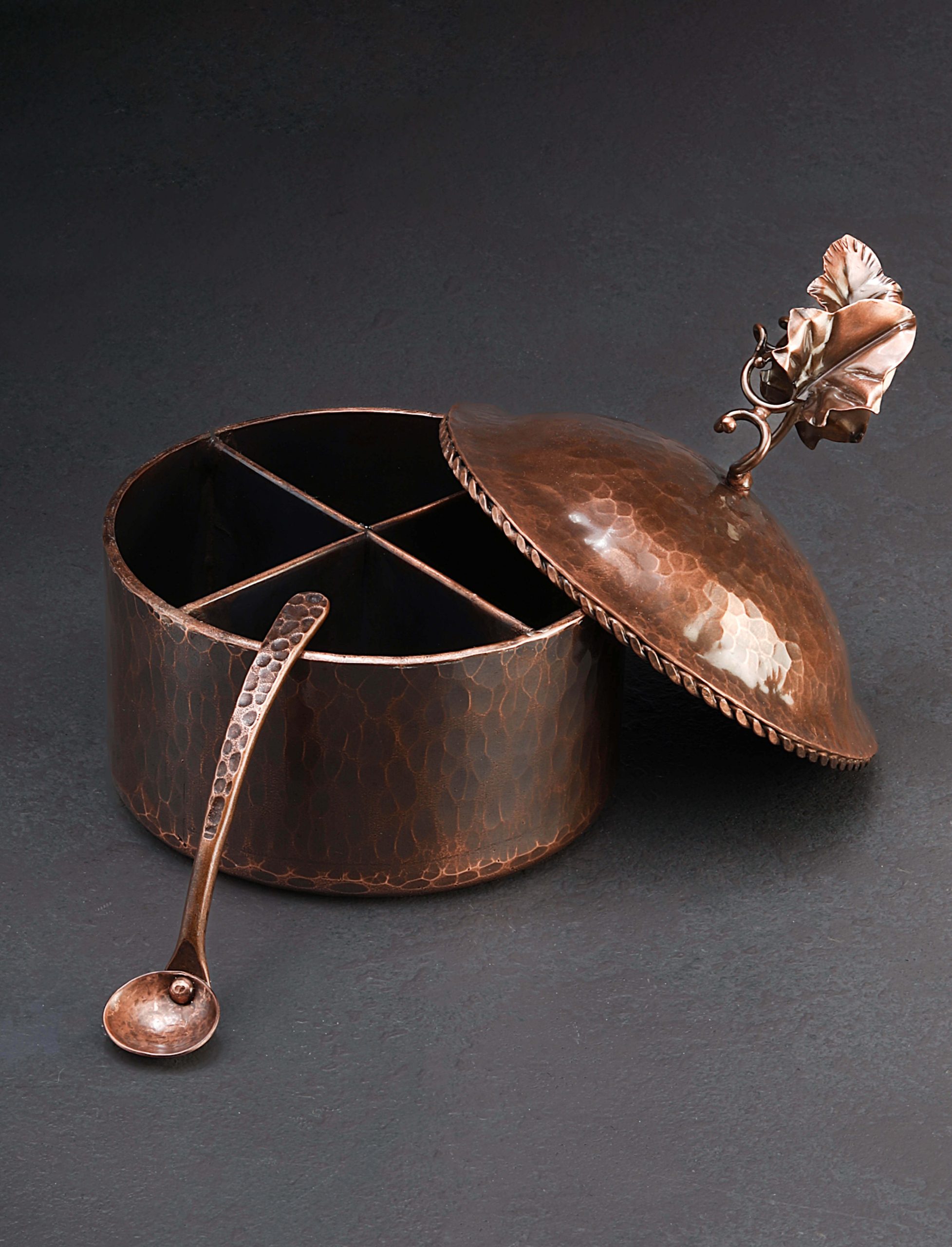 To garnish, season, and elevate the dining room’s standing with the utmost elegance is a hand-hewn Four Chamber Spice Cellar from Rex & Marsha Morton, seasoned artisanal coppersmiths of Missouri. Flavors fly with not one but four chambers to house the home’s favorite salts and seasonings. Meticulously forged and finished by Rex with wonderful attention to every detail, this singular offering is accented with beautifully twisted copper, decorative vines and leaves, a hammered finish showing the marks of its handmade origins, and stunning lines and curves at every turn. A matching spoon is included. As a functional heirloom table accent or countertop decoration, this work of art is built to stand the test of time.