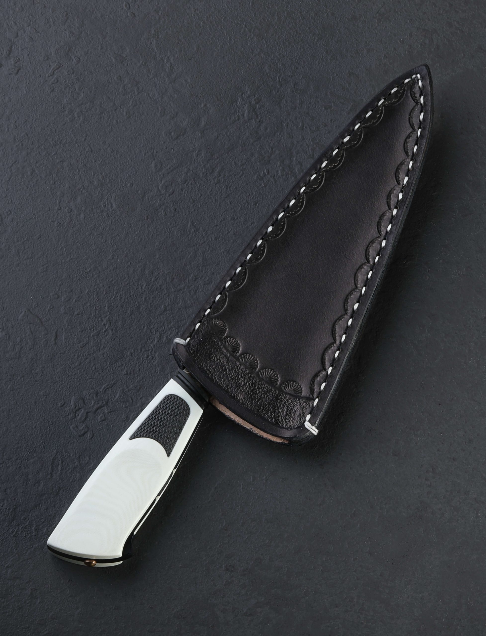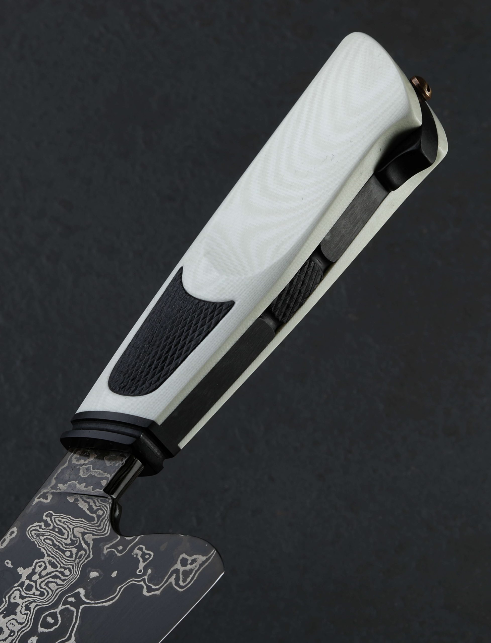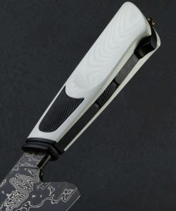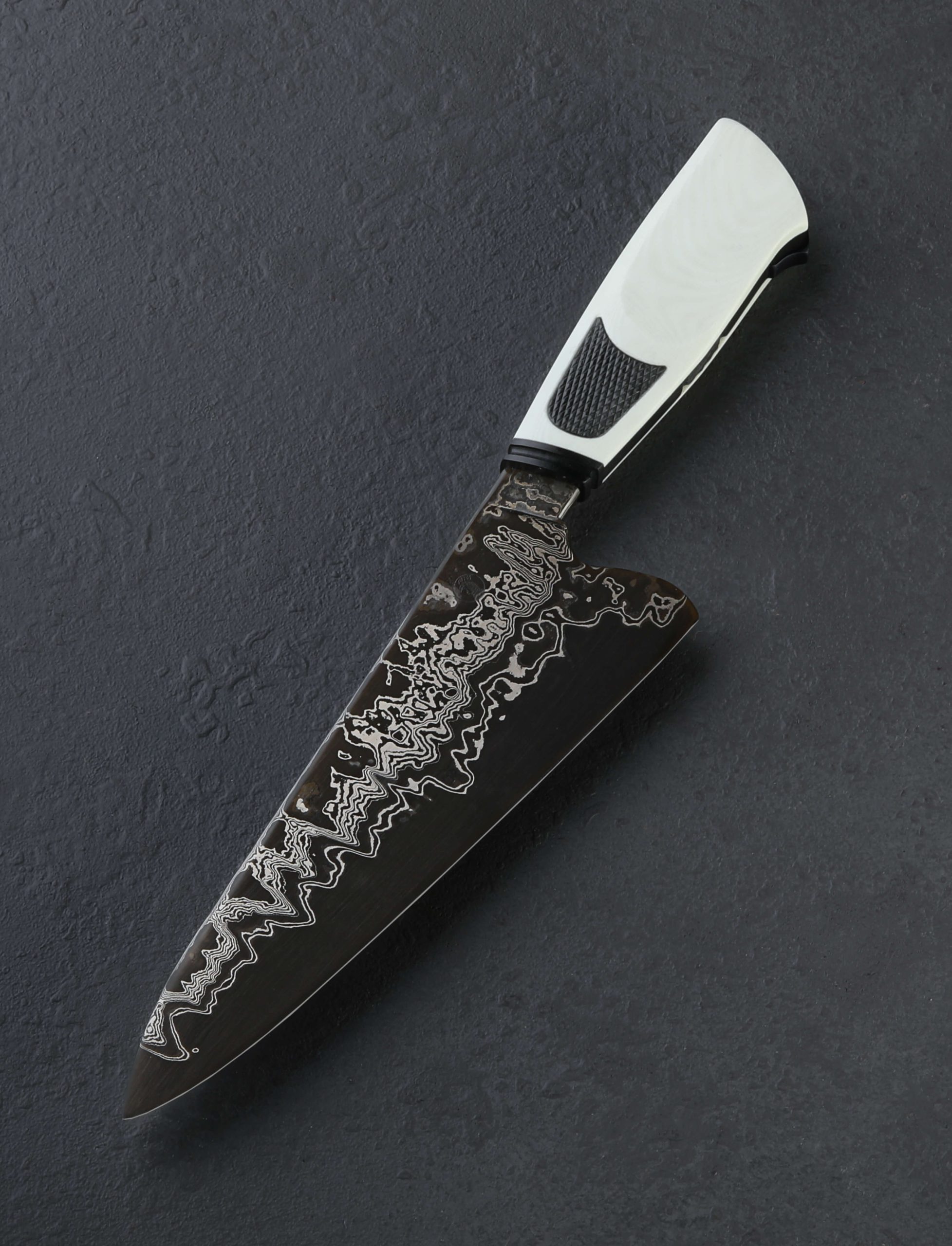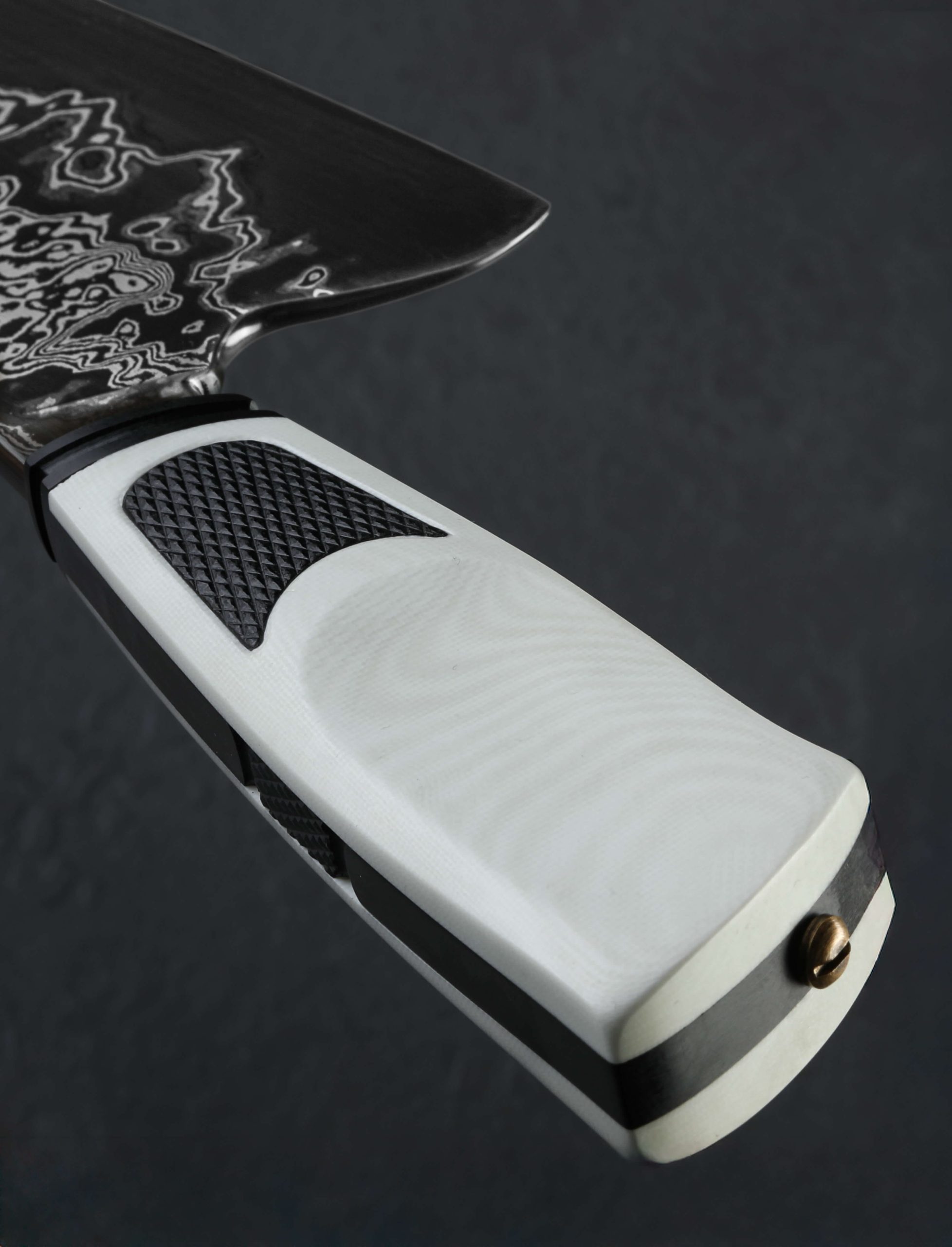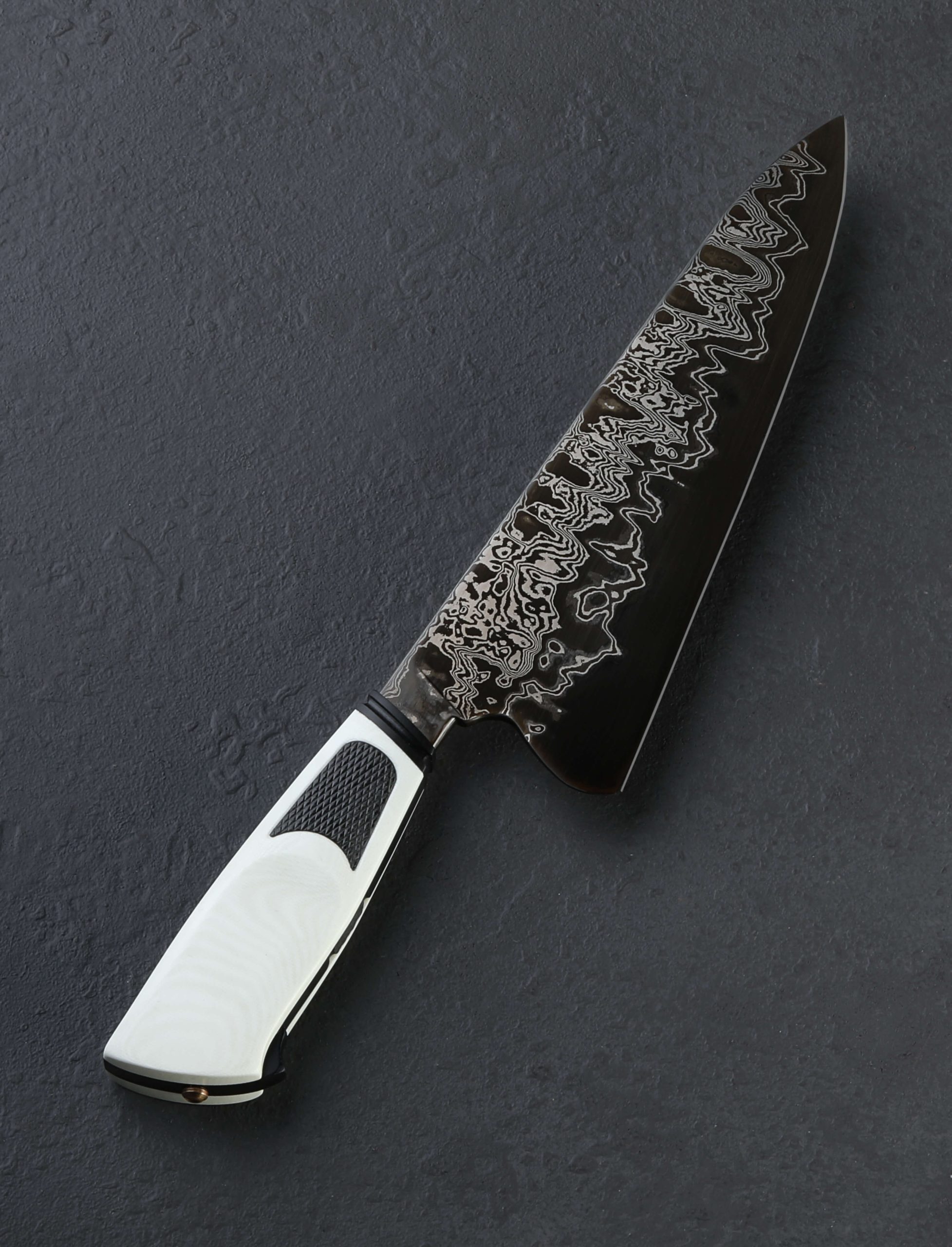 We cannot get enough of part-time maker Joshua White’s thoughtful work, so we were thrilled to have him visit our NYC office recently, leaving in our humble hands this gorgeous new one-of-a-kind chef knife. Josh’s style is unique, always eye-catching, and without fail, designed for cutting performance in kitchens large and small. Whether a home chef on the weekends or a professional chopping for hours a day, Josh’s balance and geometry tells the story of a hard-use tool at first touch. In house-made san mai steel clad with wrought iron, 1084, and 15n20 damascus over a 1095 high-carbon steel core, the Frosted Damascus Chef represents Josh beautifully. Balancing just at the blade’s heel above which the rounded spine measures an robust 5mm across, the knife is weighted and full in the hand, its 9oz / 256g overall weight combining with Josh’s outstanding, free-hand convex bevel geometry to produce a blade that moves effortlessly through ingredients, its heft doing its portion of the work and saving the chef’s energy at the same time. Tough and rigid throughout its length, the 187mm / 7.3″ blade’s spine nonetheless continues to slim gradually forward, from 5mm to around 3.8mm at the midpoint, and further still until reaching a fine, needle-like tip perfect for detail work, making this a versatile and well-rounded knife in an ideal overall size. Relatively straight is the edge profile near the heel where the blade stands a full 60mm tall, ensuring its ability to chop with speed and efficiency no matter how large or dense the ingredient. Rounded for comfort in the pinch grip, both the spine and choil are purposefully shaped and finished. The handle, both comfortable and a work of art in its own right, enjoys black and white G10 paired in a layout that we have seen from this New Jersey artist before. A frame of black, carved with handsome details from front to back and capped with a fluted ferule, is surrounded by nicely sculpted white scales that are inlaid with knurled black highlights. At the handle’s rear, allowing for its removal in case care and maintenance are needed is a domed bronze retention bolt screw. Included is a handmade leather saya.