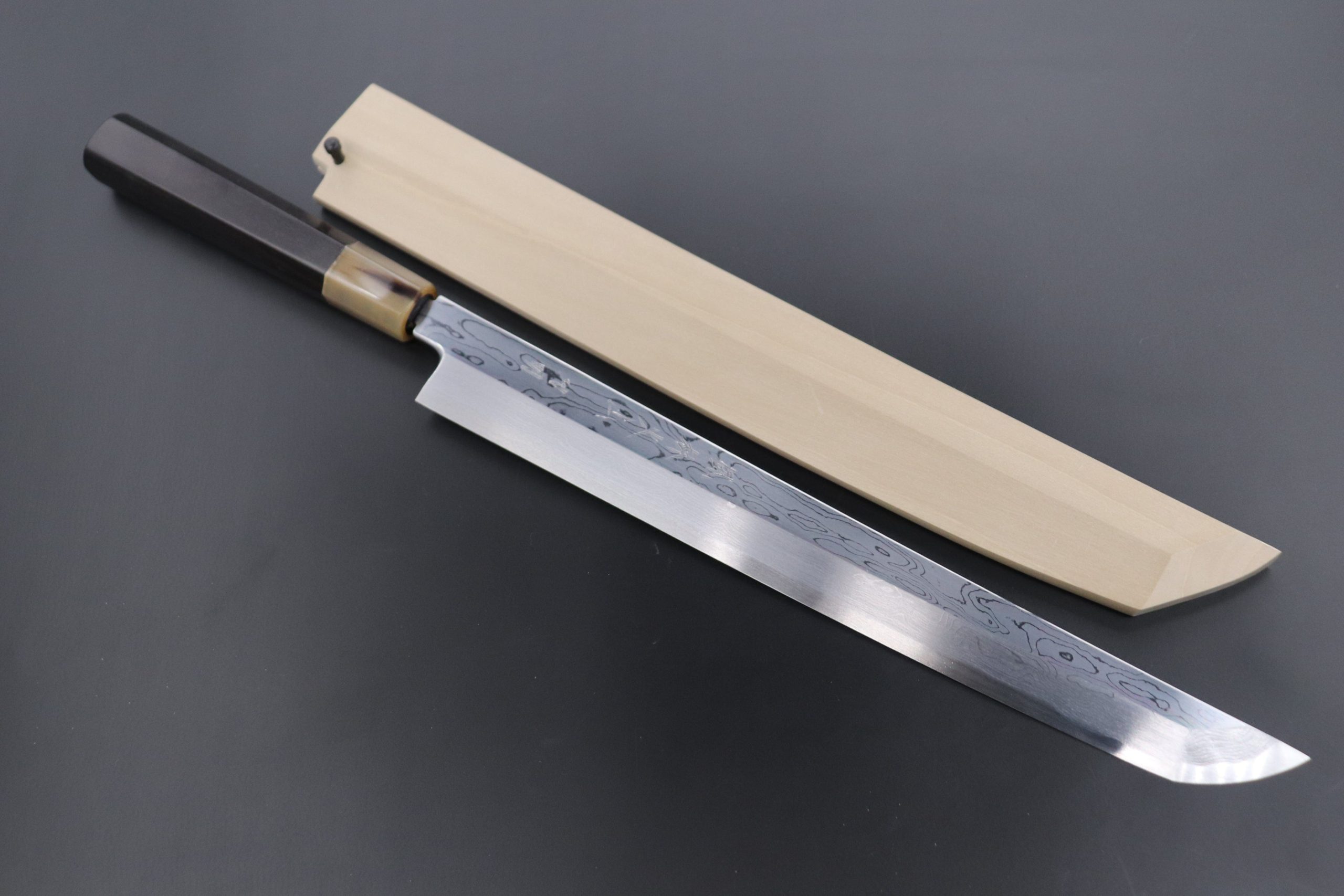 This is the special order made Fu-Rin-Ka-Zan Limited Model and available with limited quantity. Beautiful masterpiece of Blue Steel No.1 Suminagashi Sakimaru Takohiki comes with Octagon Shaped Ebony Wooden Handle and Hand Crafted Magnolia Wooden Saya.