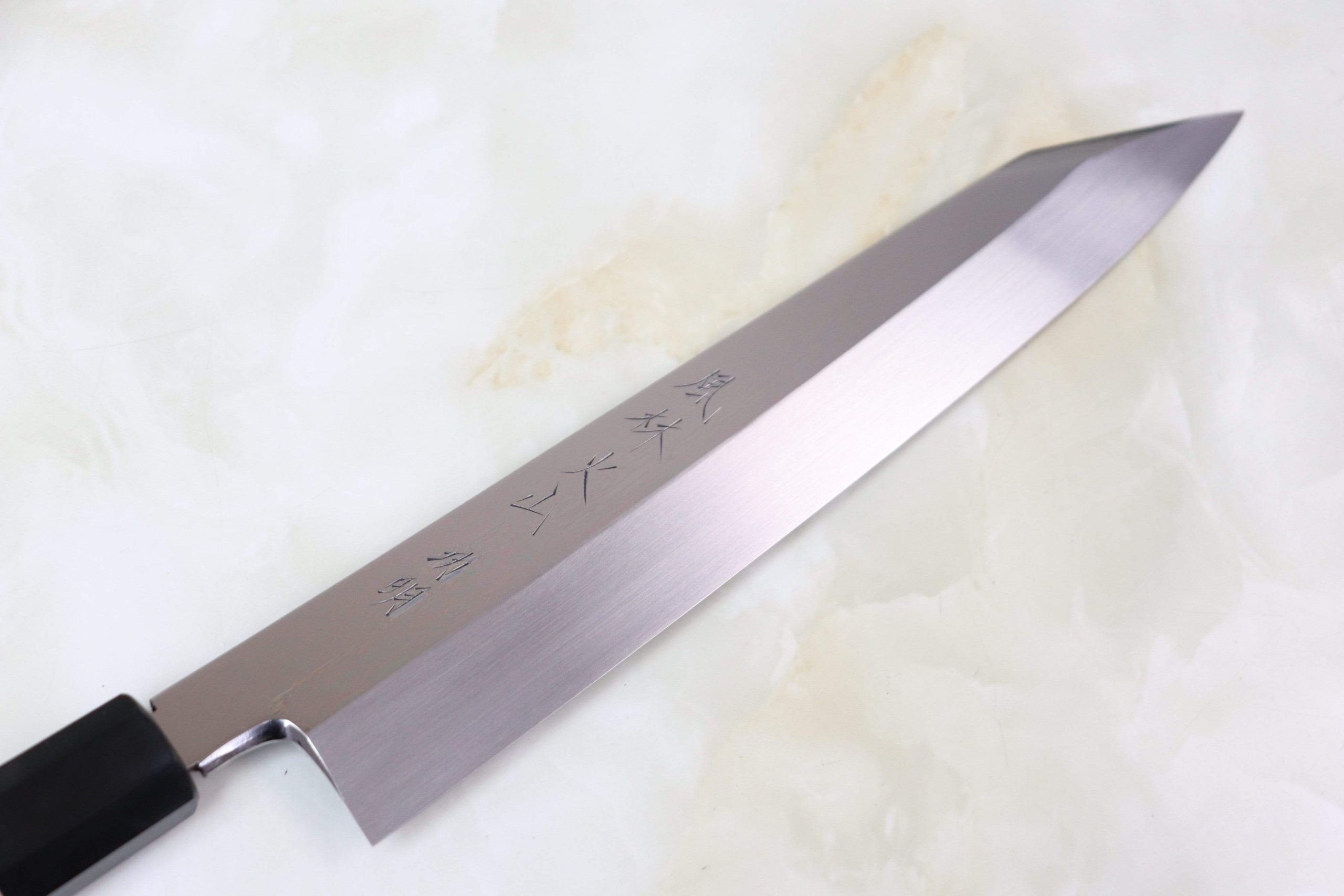 The single bevel edged Kiritsuke is a versatile knife that can be used to perform some of the tasks usually done by the Yanagiba and Usuba. The heel section of the knife is virtually flat and can be used just like an Usuba.