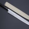 The Kirisuke Yanagiba has a very similar blade profile to the ‘regular’ Yanagiba, but it has what is commonly known as a ‘reverse tanto’ tip, or ‘clipped point’, which is very useful for precision cutting. Apart from this difference, the Kirisuke Yanagiba functions in the same way as the ‘plain’ Yanagiba or the Takohiki.
