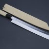 Japanese Traditional Style “Wa-Bocho” knives generally come with Single bevel edge for right handed use (the opposite side of blade is ground flat with slightly concaved shape). The reverse grinding left handed version is also available at 50% extra of regular price. (Sorry for much extra! Due to a small demand for the left handed version in Japan, it is costly to run a special small production from the beginning step). We try to keep the left handed versions in stock, but once sold out, it may take 60 to 90 days for delivery. Please contact us first for the availability at email.