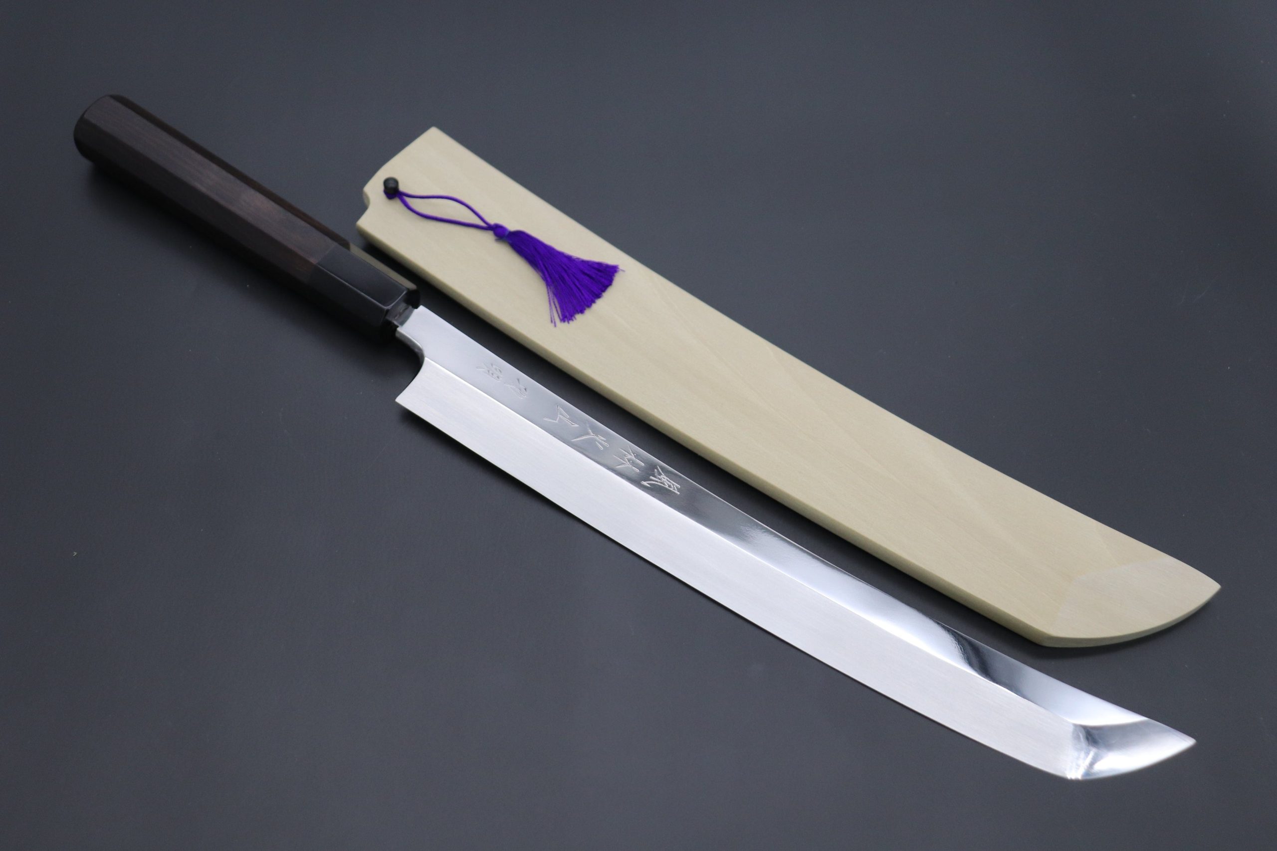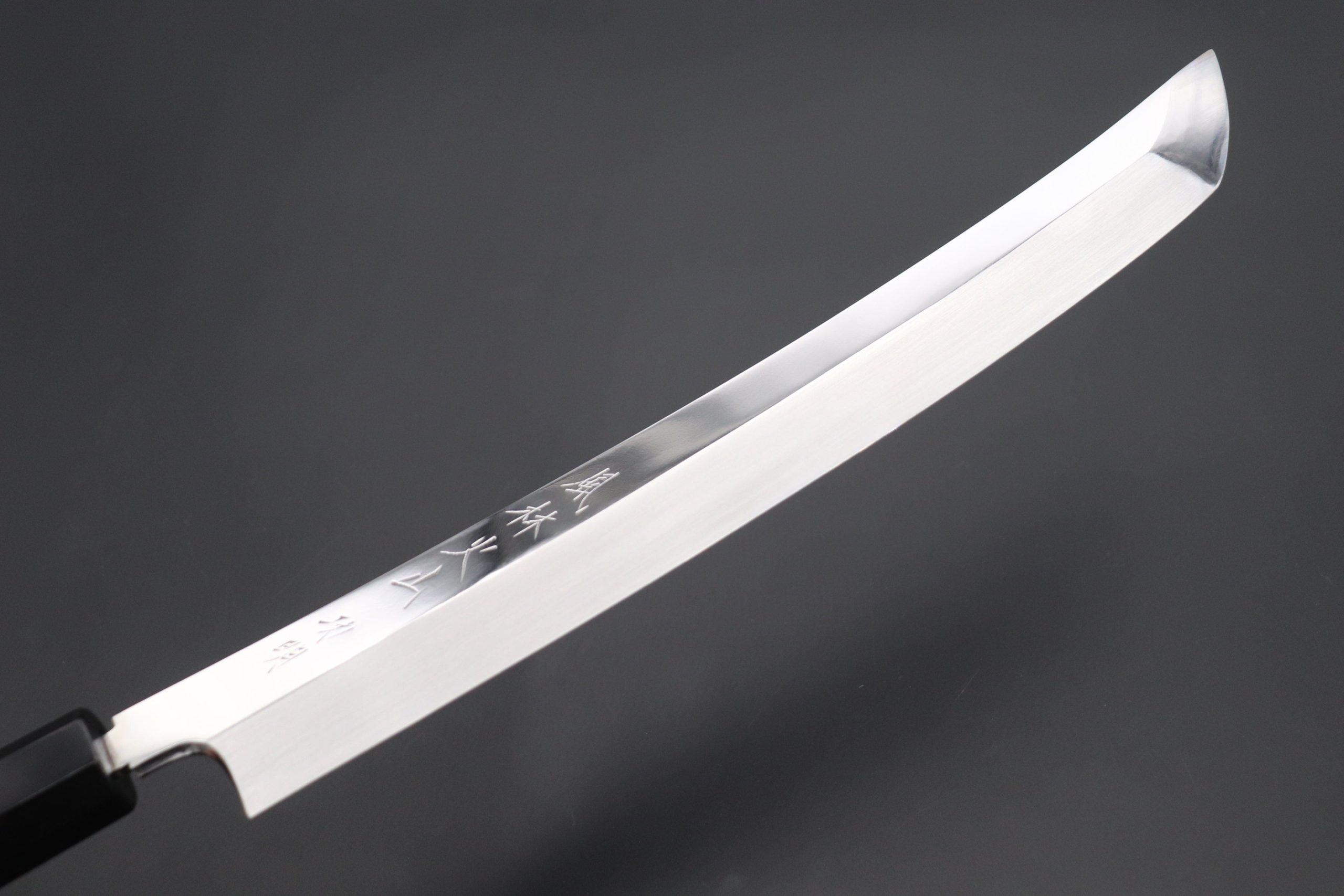 The Sakimaru Takohiki is a variation of the Yanagiba and Takohiki, and is used for much the same purposes. Sakimaru Takohiki are easily identifiable by their blade tips, which look similar to that of a Katana. Their blades have a straight spine similar to the Takohiki, and a slightly curved edge like the Yanagiba, resulting in a knife which looks somewhat like a combination of the two. This is the Special Order Made Sakimaru Takohiki from our loyal customer. The Curved Blade Sakimaru-Takohiki looks like the Stylish and Ellegant Japanese Sword.