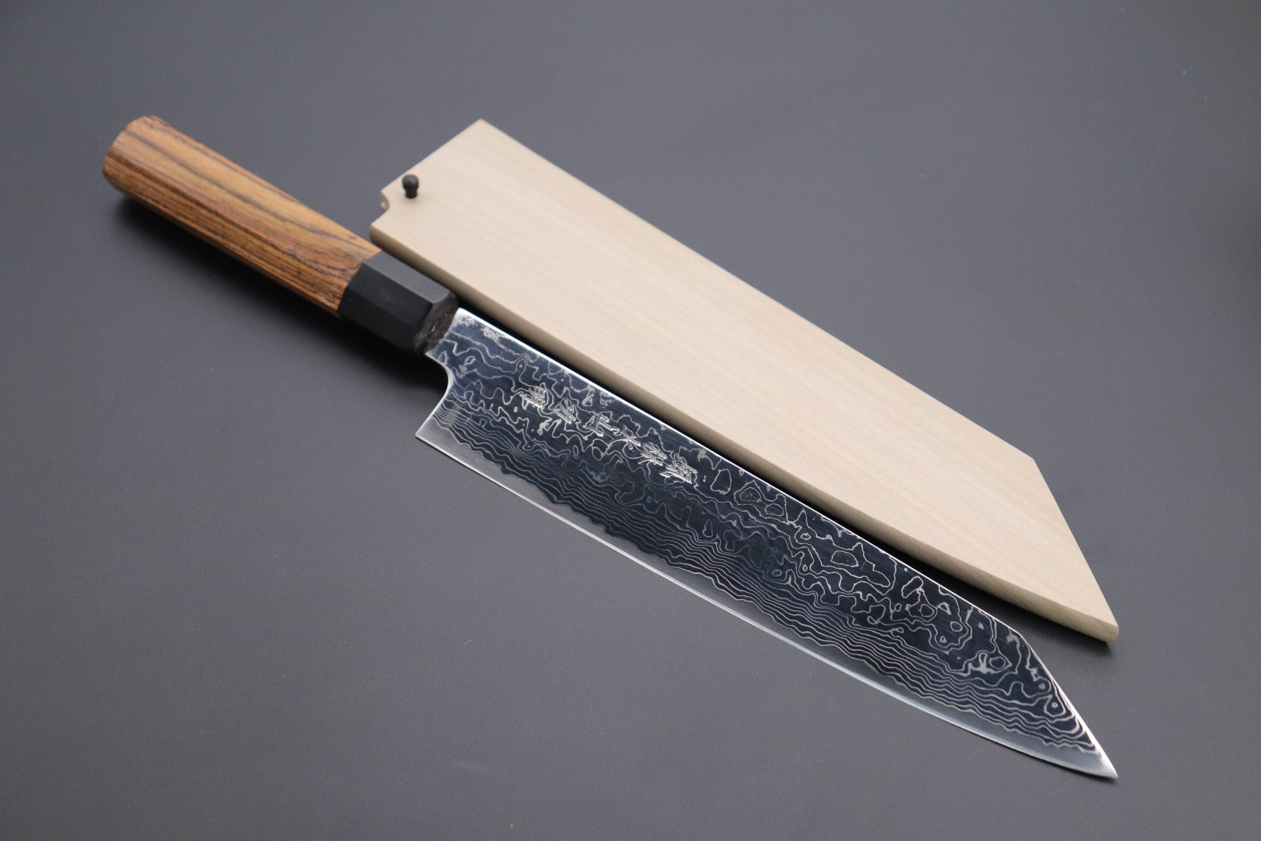 This knife has a unique natural wooden texture of octagonal Bocote wood handle, which has a buffalo horn ferrule.(Sukenari carefully selects the Japan’s Premium Wa Handle craftsman for handcrafting this premium wood Wa Handle). For safekeeping, this knife comes with a matching Handcrafting Magnolia Wooden Saya (Sheath) with a black pakkawood Saya pin.