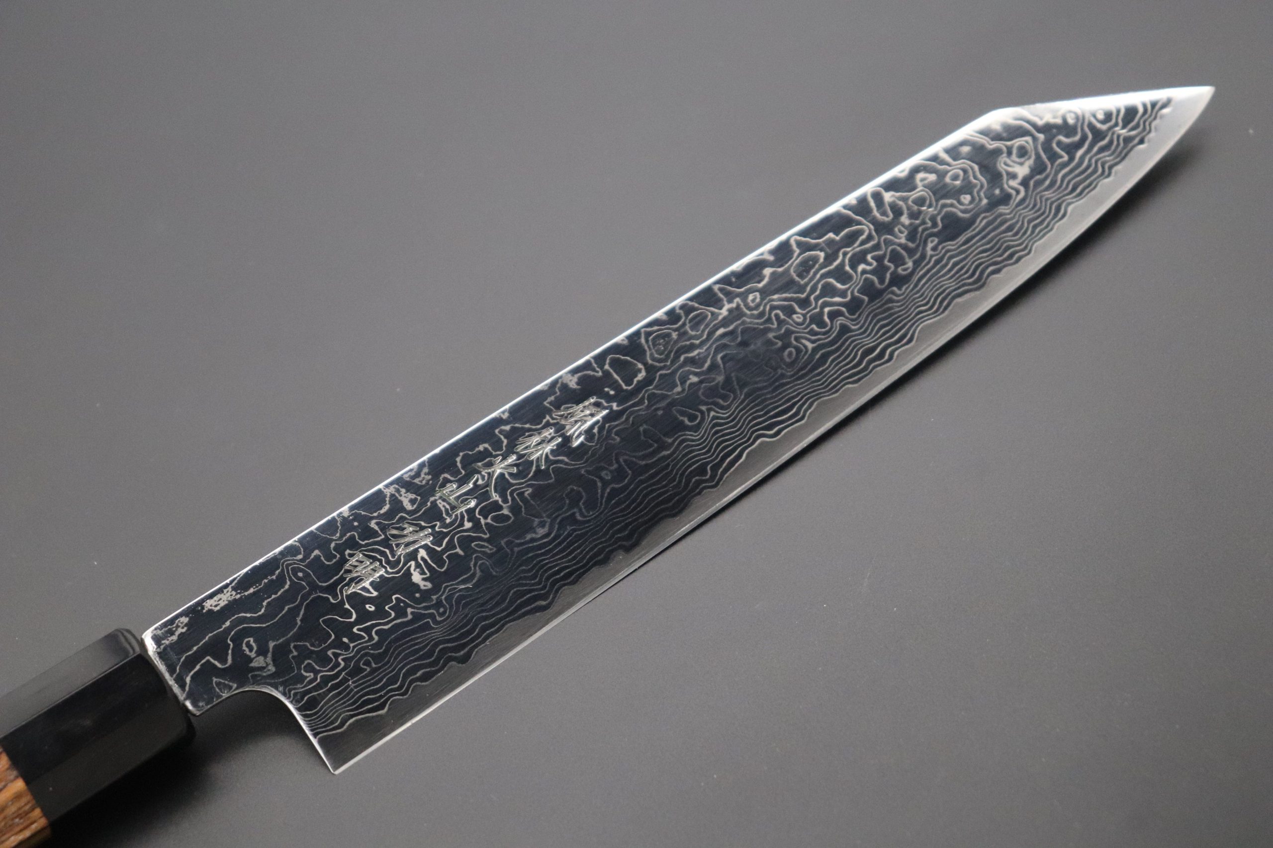This beautiful Damascus Kiritsuke-Slicer is forged and hand crafted by passionate forge smith Sukenari using R-2 steel. R-2 (Also known as SG-II ) is a high-quality Powdered Metallurgy (P.M.) High Speed Tool Steel from Kobelco. R-2 has a very rich chemical composition, which includes Carbon 1.25-1.45 %, Chromium 14- 16%, Molybdenum 2.3- 3.3 %, and Vanadium 1.8- 2.2 %.