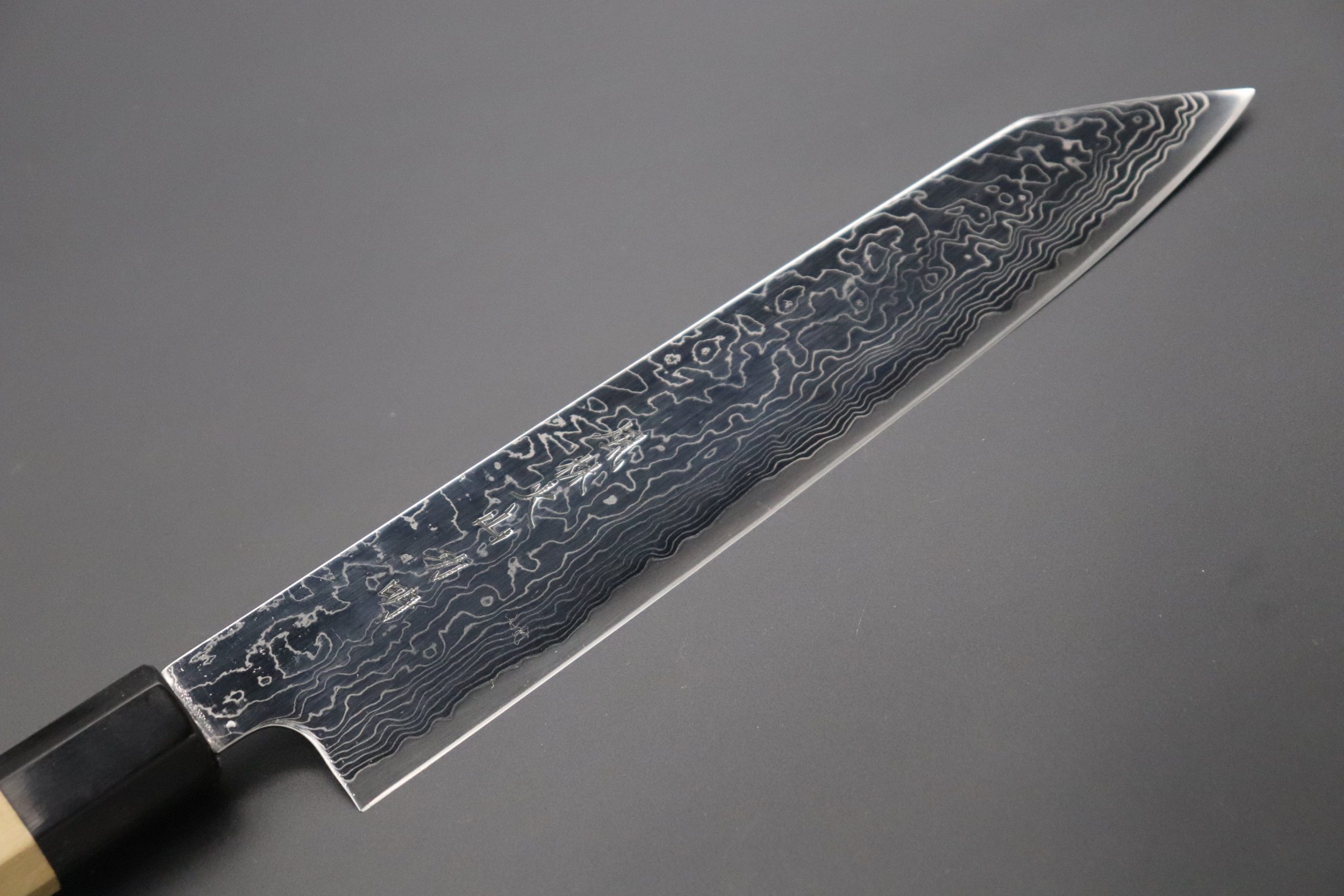 This beautiful Damascus Kiritsuke-Slicer is forged and hand crafted by passionate forge smith Sukenari using R-2 steel. R-2 (Also known as SG-II ) is a high-quality Powdered Metallurgy (P.M.) High Speed Tool Steel from Kobelco. R-2 has a very rich chemical composition, which includes Carbon 1.25-1.45 %, Chromium 14- 16%, Molybdenum 2.3- 3.3 %, and Vanadium 1.8- 2.2 %.