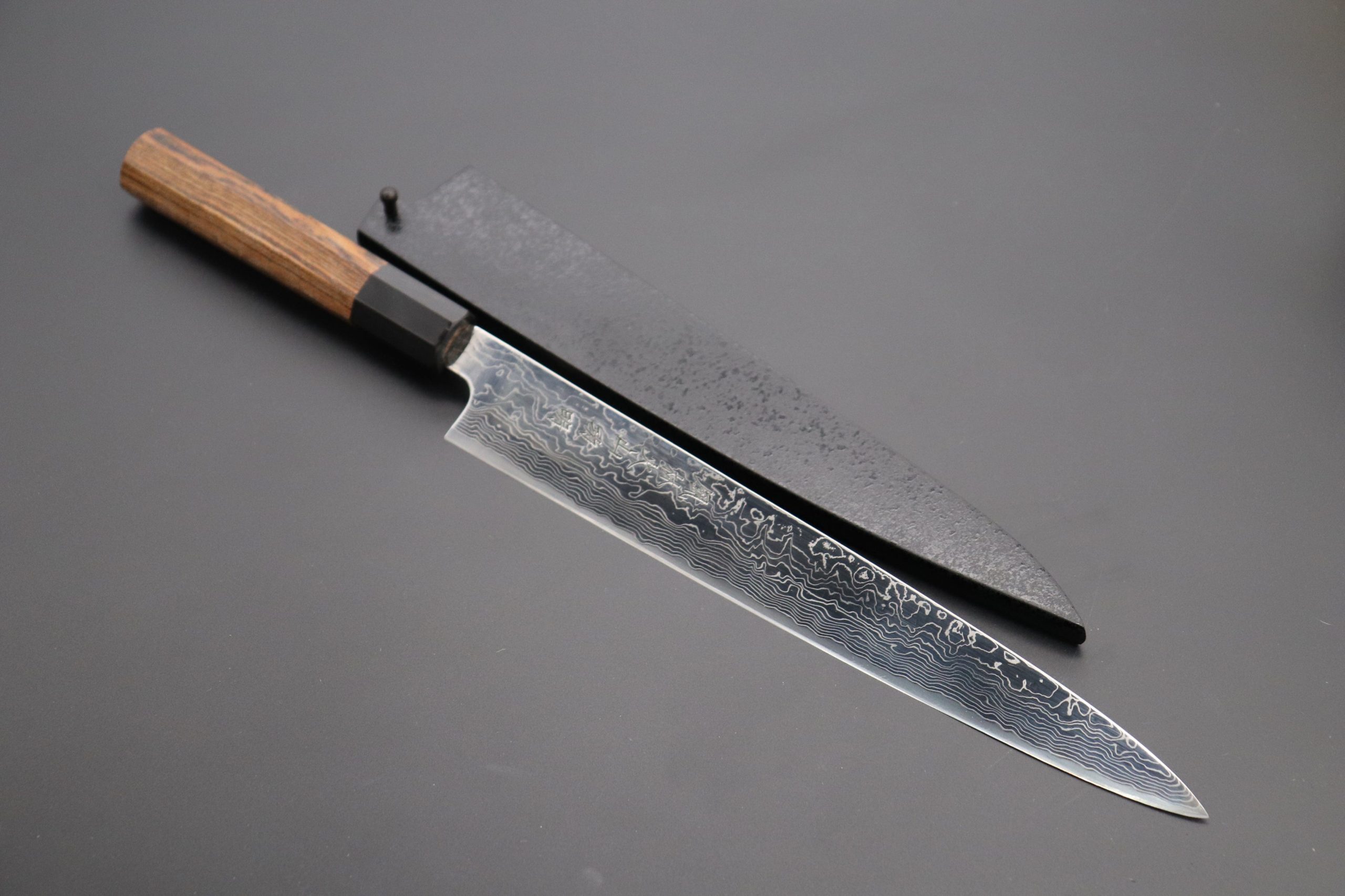 This knife has a unique natural wooden texture of octagonal Bocote wood handle, which has a buffalo horn ferrule.(Sukenari carefully selects the Japan’s Premium Wa Handle craftsman for handcrafting this premium wood Wa Handle). For safekeeping, this knife comes with a matching Black Lacquered wood Saya (Sheath) with a black pakkawood Saya pin.