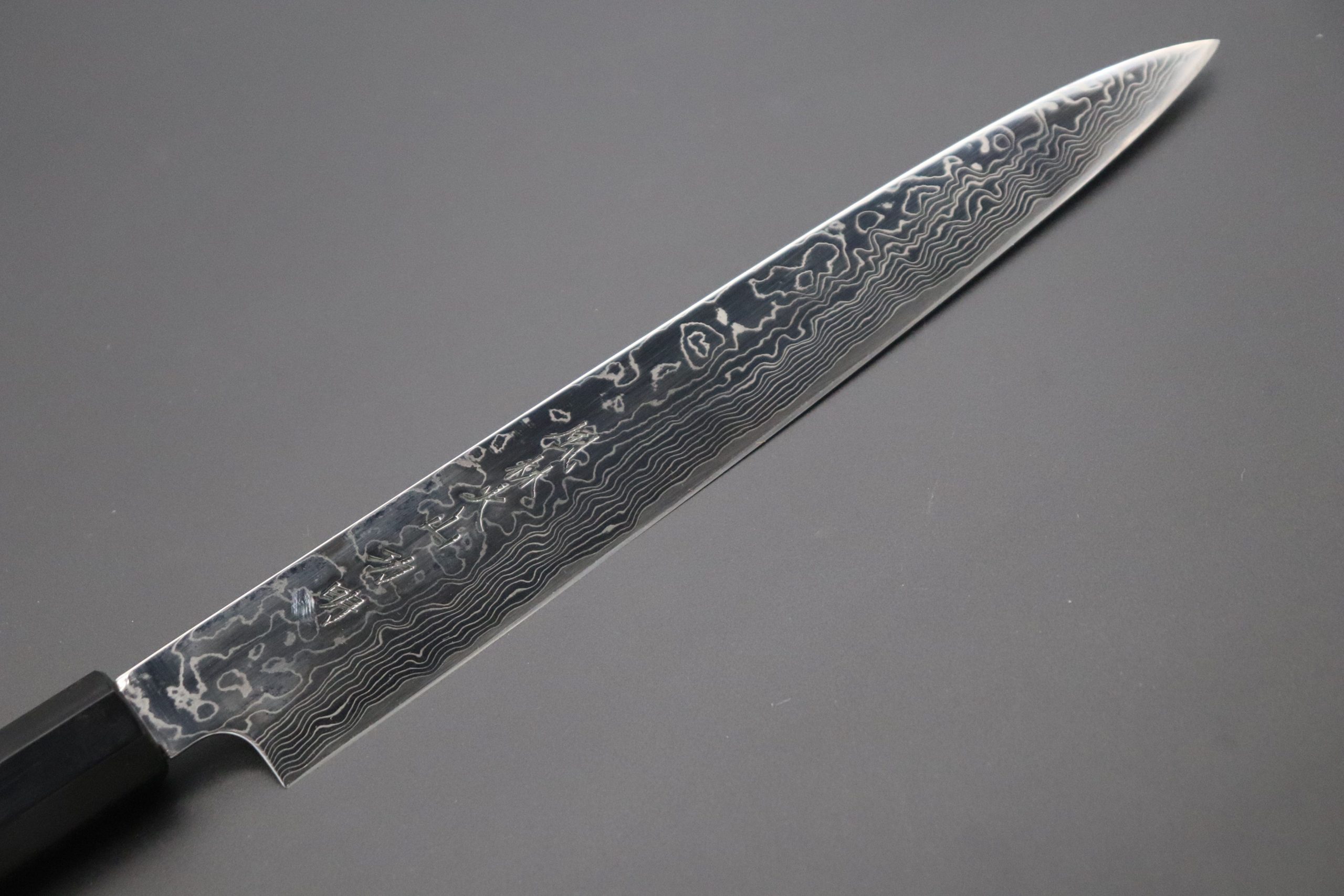This beautiful Damascus Wa Sujihiki is forged and hand crafted by passionate forge smith Sukenari using R-2 steel. R-2 (Also known as SG-II ) is a high-quality Powdered Metallurgy (P.M.) High Speed Tool Steel from Kobelco. R-2 has a very rich chemical composition, which includes Carbon 1.25-1.45 %, Chromium 14- 16%, Molybdenum 2.3- 3.3 %, and Vanadium 1.8- 2.2 %.