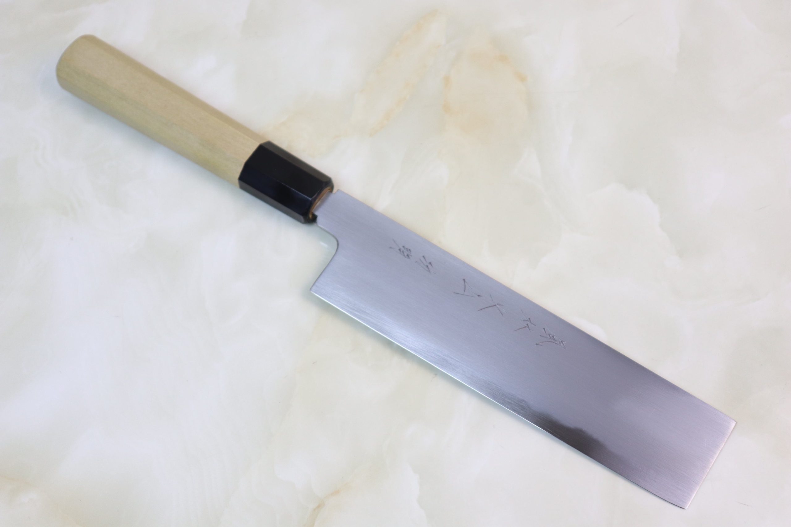 This Nakiri knife has a comfortable octagonal magnolia wood handle, which has a buffalo horn ferrule.